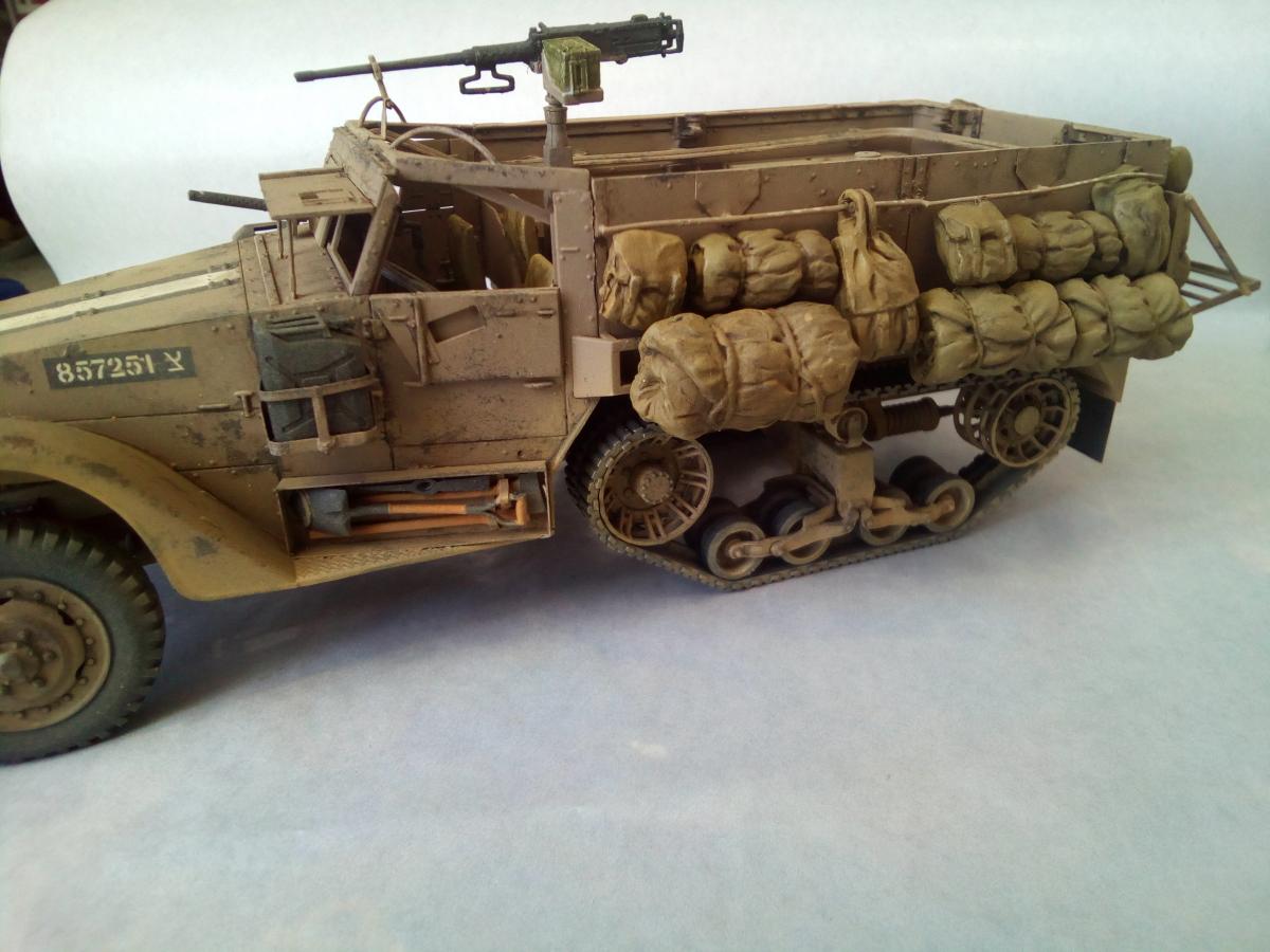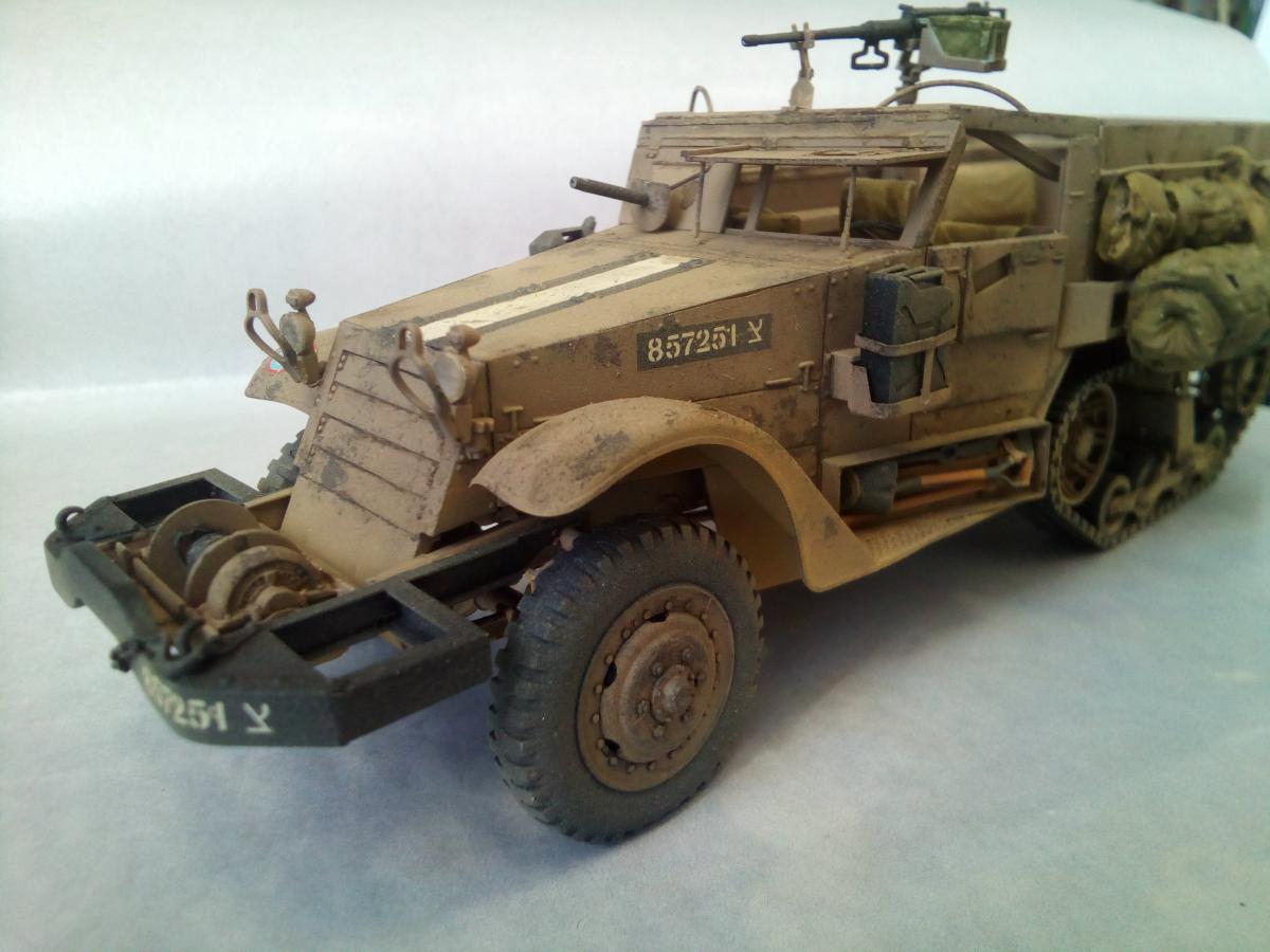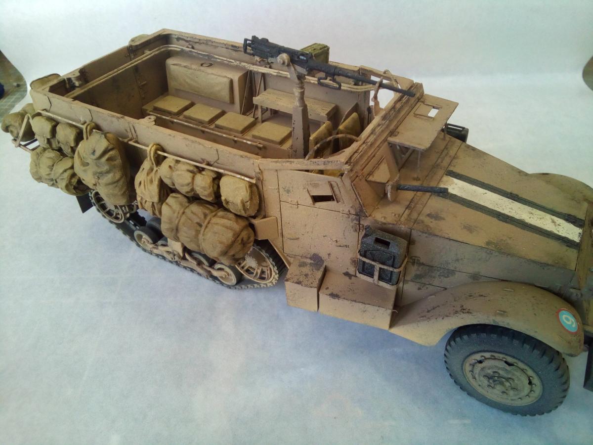 Продолжаю линейку техники Цахала. Представляю новую модель от Драгона. M3 (англ. Half-Track Personnel Carrier M3) — полугусеничный бронетранспортёр США периода Второй мировой войны. Создан в 1940—1941 годах параллельно с почти идентичным ему по конструкции бронетранспортёром M2. Серийное производство M3 продолжалось с 1940 по 1945 год, всего было выпущено 31 176 бронетранспортёров этого типа, включая его улучшенные варианты M5 и M9 и не считая нескольких тысяч машин специального назначения на их базе. Во время Второй мировой войны M3 и машины на его базе в значительных количествах поставлялись союзникам США по программе ленд-лиза, немалое количество бронетранспортёров было продано другим странам и в послевоенное время. Хотя почти во всех странах, использовавших M3, он снят с вооружения, по состоянию на 2007 год отдельные страны всё ещё имеют бронетранспортёры этого типа в своих армиях. Качество кита на высоте. Но иногда встречаются подводные камни в инструкции, некоторые детали появляются из ниоткуда. Обвес выполнен из резиновых деталей, половина осталось не востребованой. Так же осталось много деталей от других модификаций. Не понравилось исполнение седушек десанта, для этой модификации, в базовой они выполнены с рельефом. Окраска красками Пацифик88, так как у них есть аутентичные цвета. Тонировка масляными красками. Фильтр не использовал. Попытка нанесения песчаной пыли жидкой краской с большого расстояния.