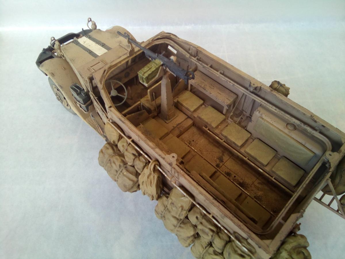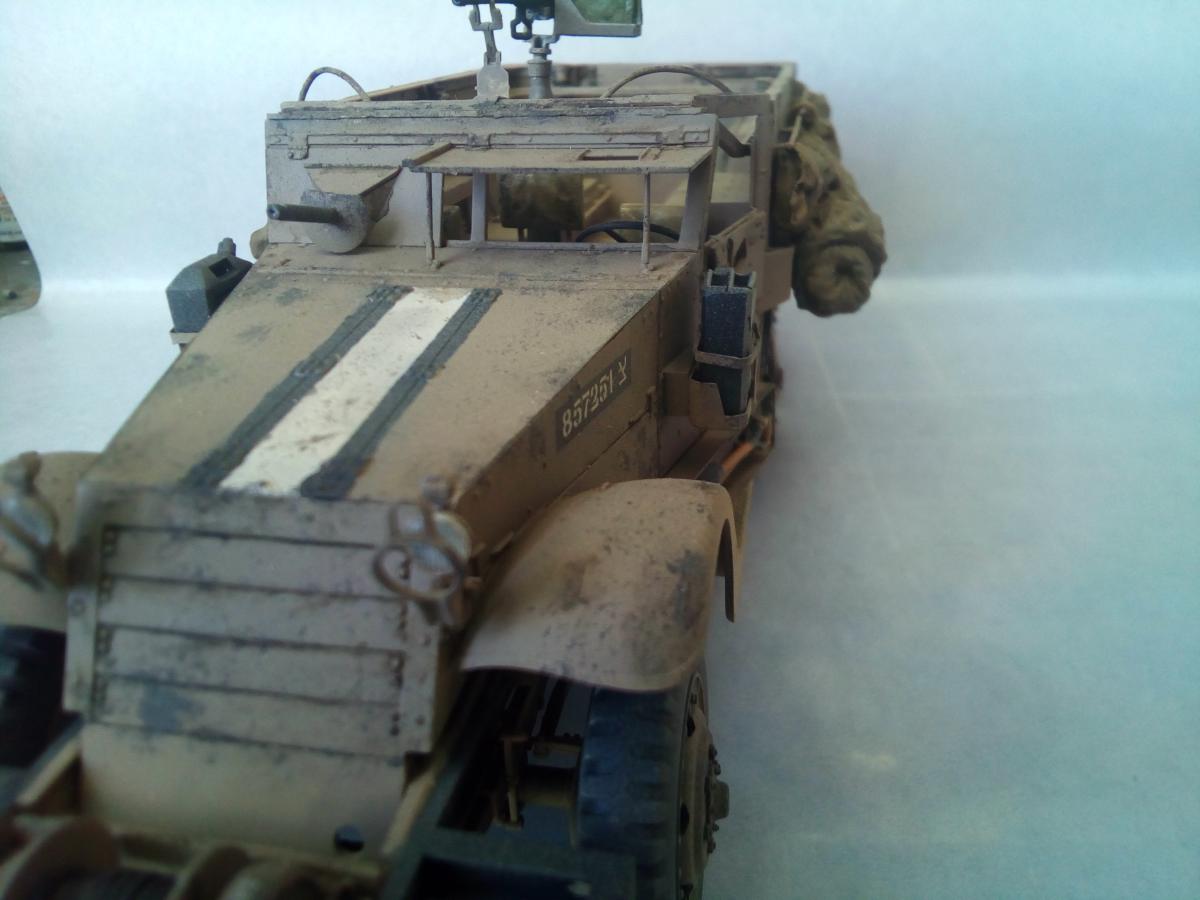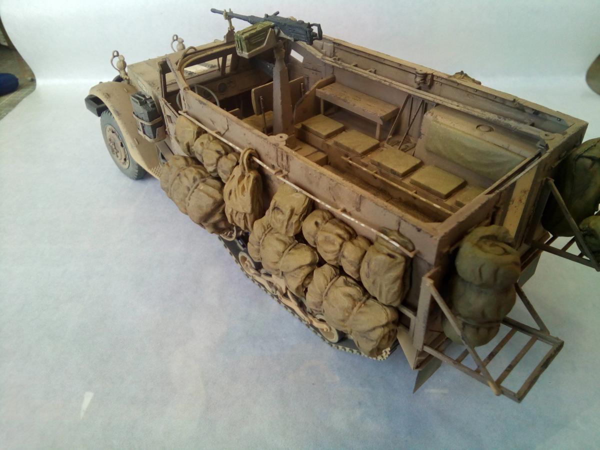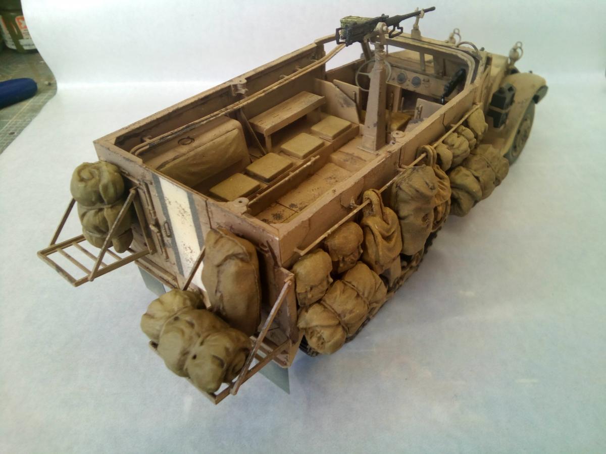 Продолжаю линейку техники Цахала. Представляю новую модель от Драгона. M3 (англ. Half-Track Personnel Carrier M3) — полугусеничный бронетранспортёр США периода Второй мировой войны. Создан в 1940—1941 годах параллельно с почти идентичным ему по конструкции бронетранспортёром M2. Серийное производство M3 продолжалось с 1940 по 1945 год, всего было выпущено 31 176 бронетранспортёров этого типа, включая его улучшенные варианты M5 и M9 и не считая нескольких тысяч машин специального назначения на их базе. Во время Второй мировой войны M3 и машины на его базе в значительных количествах поставлялись союзникам США по программе ленд-лиза, немалое количество бронетранспортёров было продано другим странам и в послевоенное время. Хотя почти во всех странах, использовавших M3, он снят с вооружения, по состоянию на 2007 год отдельные страны всё ещё имеют бронетранспортёры этого типа в своих армиях. Качество кита на высоте. Но иногда встречаются подводные камни в инструкции, некоторые детали появляются из ниоткуда. Обвес выполнен из резиновых деталей, половина осталось не востребованой. Так же осталось много деталей от других модификаций. Не понравилось исполнение седушек десанта, для этой модификации, в базовой они выполнены с рельефом. Окраска красками Пацифик88, так как у них есть аутентичные цвета. Тонировка масляными красками. Фильтр не использовал. Попытка нанесения песчаной пыли жидкой краской с большого расстояния.