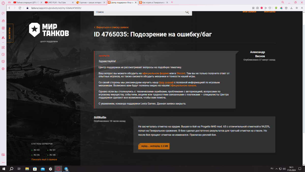 Здравствуйте. Сначала я обратился в ЦПП в раздел игровой механики с этим случаем. Копирую текст с которым обратился туда: Не засчиталась отметка на орудие. Вышел в бой на Progetto M40 mod. 65 с отличительной отметкой в 94,03%, попал на Генеральное сражение. В бою сделал достаточно результатов для третьей отметки на стволе. Но после боя процент отметки не изменился. Прилагаю реплей боя. Там мне ответили (копирую текст): ЗАКРЫТА Здравствуйте! Центр поддержки не рассматривает вопросы на подобную тематику. Ваш вопрос вы можете обсудить на официальном форуме или в Discord. Там вы не только получите ответ от опытных игроков, но также сможете обсудить механики и тонкости нашей игры. Со своей стороны мы рекомендуем изучить нашу базу знаний с полезной информацией по игровым механикам. Возможно вам будут полезны видео на нашем официальном канале. Однако если вы столкнулись с: техническими ошибками, проблемами с авторизацией, вопросами по игровому имуществу, событиям, акциям или трудностями связанными с платежами — специалисты Центра поддержки сделают все возможное, чтобы вам помочь. С уважением, команда поддержки Lesta Games. Данная заявка закрыта. Я так понял, что они не разобравшись в вопросе, подумали, что я ною, что не получил отметку. И что с такими претензиями не в ЦПП. Но так как в разделе "Как играть в Генеральном сражении" четко написано, что в этом режиме игроки могут получать отметки на орудие, как и в случайных боях, прихожу к мнению, что произошла именно ошибка в игре (баг). Так как после боя отметка не изменилась (не упала вниз, и не повысилась). Если это действительно баг игры, то мне должно было засчитать третью отметку на стволе, так как в бою я настрелял 5700+ тысяч урона, и 1500+ ассиста. С 94,03% на Роге я думаю эти цифры вполне тянут на +95%. Скажите, пожалуйста, может на Генеральных сражениях нельзя брать отметки? Тогда инфа в ЦПП про отметки устарела? Или я изначально должен был обратиться на форум, а не в ЦПП? Благодарю за внимание. Прилагаю скриншоты и реплей боя.