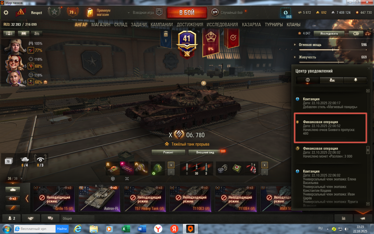 Здравствуйте! После последнего обновления, начисление опыта и серебра после боев крайне малое. Судя по скриншоту можно понять, что явно поломалась механика начисления игровых ценностей, до обновления все было ок. Возможно это фича а не баг, но в таком случае о ней бы сообщили, или же еще что-то. На данный момент не хочется играть, так как непонятно что происходит, и уходишь в огромный минус после боя Можете, пожалуйста, подсказать и проверить в чем дело?