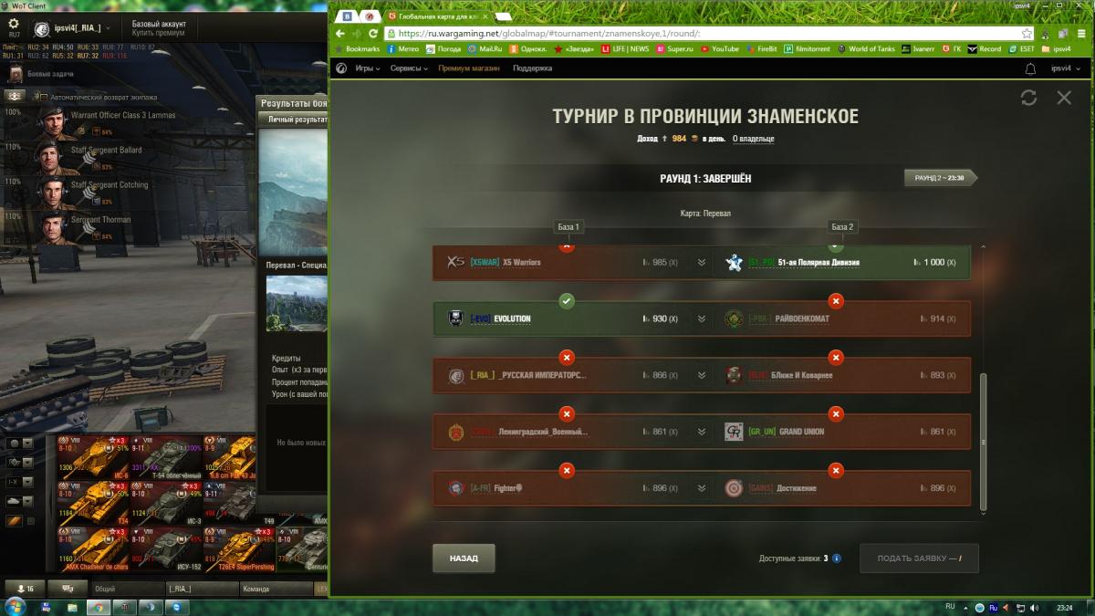 Господа! В высадке на провинцию Знаменское (https://ru.wargaming.net/globalmap/#province/znamenskoye) наш клан [_RIA_] _РУССКАЯ ИМПЕРАТОРСКАЯ АРМИЯ_ (http://ru.wargaming.net/clans/36589/) одержал победу уничтожив всю технику противника. Однако из турнирной сетки нас выкинули приписав поражение обеим командам! Дата 11.03.15. Прошу принять меры! Люди сидели, ждали боя, победили, а их выкинули ни за что! Я уже не говорю про потерянные в результате этого "поражения" очки победы в рейтинге кланов Второго Сезона! Судя по турнирной сетке, я так понимаю, что такая же "ситуация" произошла еще в двух боях! Беспредел!