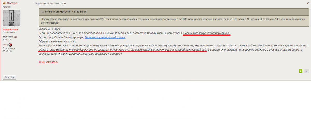 На скрине типичный ответ абсолютно любого модератора или разработчика на вопросы по теме баланса. Ну а красным подчеркнуто два весьма сомнительных утверждения!Перед тем как создать тему я не много я посмотрел какие вопросы чаще всего задают игроки , и на что призывают обратить внимание. Огромное , просто огромное количество тем про баланс. Я провел несколько сотен боев во взводе на 8 уровне , и могу совершенно точно сказать что утверждение :баланс взвода работает нормально, не соответствует действительности. Мы во взводе ни разу, повторяю ни разу не попали в топ в формате 3,5,7. За несколько сотен боев 90% из них были с 10 уровнями. 7-8% с 9 уровнями и остальные в боях где все 8ки. Абсолютно точно могу сказать что баланс взводов абсолютно не работает. Причем когда нажимаешь кнопку в бой ,тебя закидывает моментально, и не в топ. Что ставит под сомнение второе утверждение подчеркнутое красным, про время формирования команд. Второй момент с которым столкнулся сегодня это рандомные бои. Несколько раз видел как люди описывали ситуацию когда во время игры на каком нибудь танке в рандоме, они длинную серию боев не попадали в топ. не придал этому значение так как в рандоме все таки иногда можно попасть в топ даже 3,5,7. Но сегодня и со мной такое произошло. Купил КВ 13, сыграл 10 боев подряд и записал результат:9,9,9,8,9,8,8,8,8,9! Ни одного боя в топе за 10 боев. И все это на стоковой машине,где не то что с девятками, да со своим уровнем трудно играть, так как машина не едет и не стреляет. Причем я не сколько не ждал после нажатия кнопки в бой. Это явно говорит о том что с балансом явные проблемы. При старом балансе за 10 боев, ну хоть раз но закинуло бы с топ. Справедливости ради скажу что это происходит не со всеми машинами, и на других танках я конечно же иногда попадаю в топ, но только не во взводе. Теперь перед тем как задать вопросы я хочу сказать что конечно же понимаю что те кто на них отвечают не особо то и виноваты, просто они даже не могут высказать своего мнения, если оно будет отличатся от мнения руководства. НО! Как быть с этим огромным количеством вопросов/утверждений что баланс не работает? Вы ведь не считаете что это какой то масонно-рептилойдный заговор игроков?Теперь вопросы: Почему компания не обращает внимания на огромное количество вопросов по балансу? Почему ВГ не признает существования проблемы и утверждает что все нормально? И наконец, когда это будут исправлять???