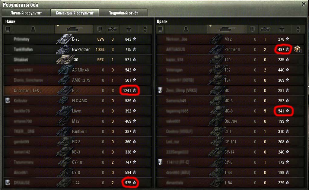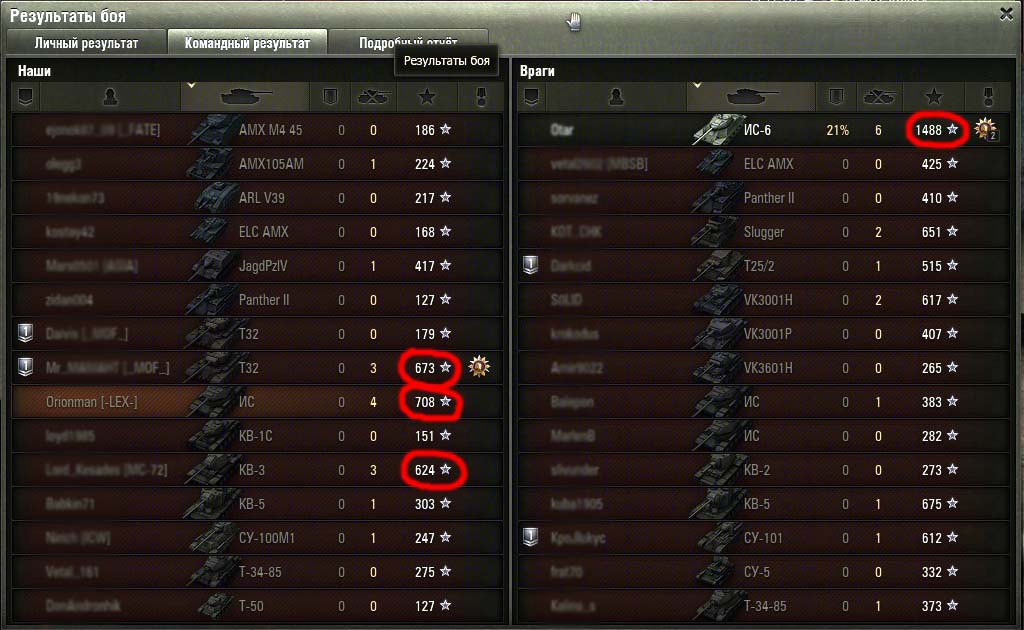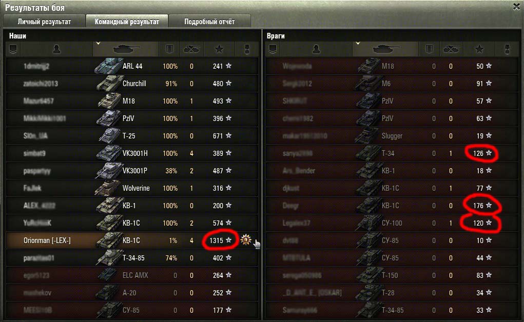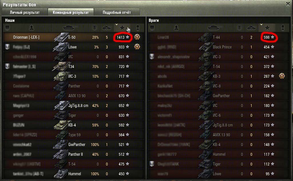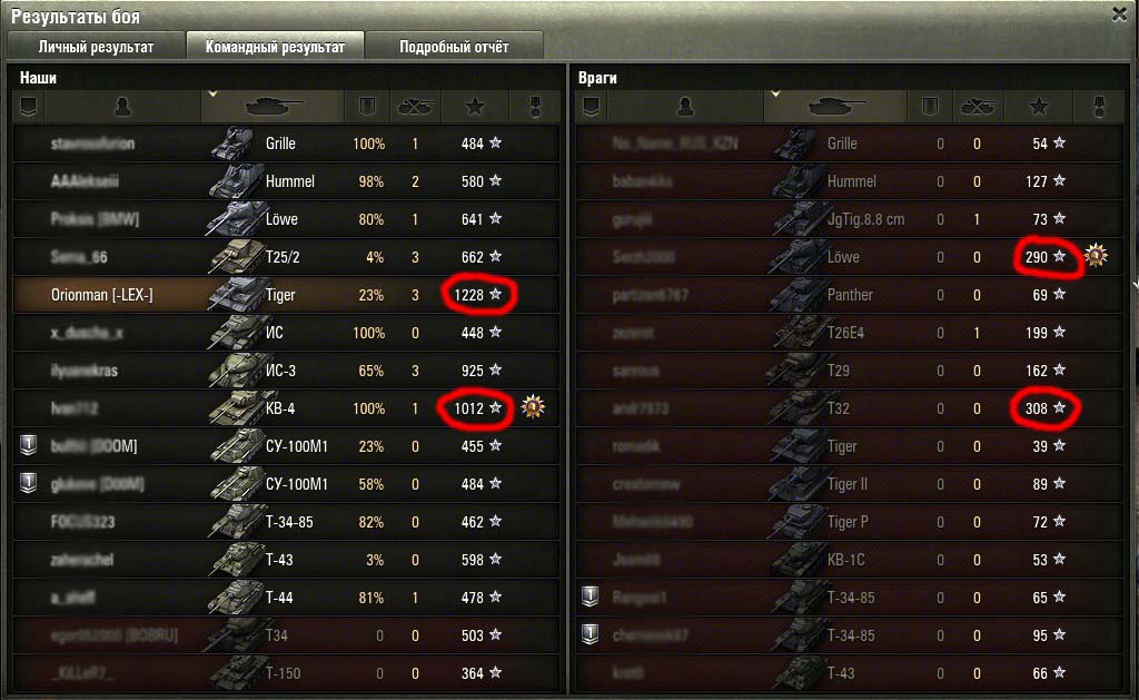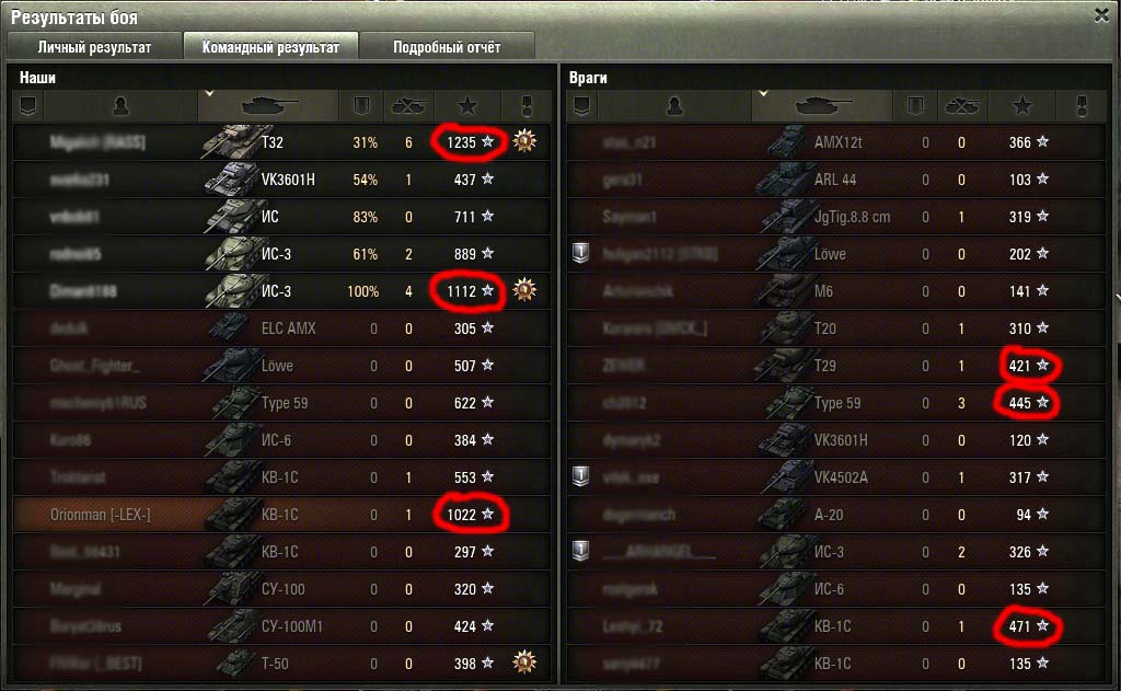У нас, танкистов, появилась возможность просматривать расширенную статистику боя, но проводили ли вы анализ этой статистики? Немного понаблюдав за победными и проигрышными боями, я сделал небольшие выводы, которые, может развивать дальше любой игрок. Вот пару скриншотов боев: (Красным выделены бойцы с наибольшим числом боевого опыта) Так как полученный опыт показывает прямое влияние человека на победу, видно, что на победу всей команды влияют небольшое количество так называемых «Героев». Именно эти люди в бою ослабляют большинство опаснейших противников, отсутствие которых делает вражескую команду небоеспособной.Из литературы я знаю, что в среднем, для морально стойких войск можно применить коэффициент потери боеспособности mk = 0.4-0.5; для морально нестойких войск mk = 0.7-0.8. Эти цифры показывают количество потерянных бойцов от общего числа, при котором боевой дух не уменьшается, и победа еще возможна. Наблюдая за исходом боев, я сделал заключение о полном отсутствии морали у танкистов. Большинство именно сливается, причем вне зависимости от уровня танка, а исход сражения решает небольшая группа, порой независимых бойцов (не взводных) и, как правило, их количество от 1 до 5. mk1= 1 -1/15= 0,933; mk2= 1 -5/15= 0,666 Морально не стойкие войска! Развивая мысль дальше, можно решить, что залог победы – вычисление и ликвидация именно этих виртуальных героев. И действительно этих людей видно сразу, по манере ведения огня, продавливанию направления, знания углов рикошета, пробитий, точности, мгновенной реакции на смену условий и т.д. Таким образом, получается парадокс: Убив 1-го, 5-ть бойцов мы создаем предпосылки победы над 15-тью бойцами. Теперь так же можно объяснить и загадочные «сливы помоев» со счетом 15:0 (причина победы была устранена в самом начале и остальная биомасса «оленей» уже ничего не могут решить) Дальше можно проследить зависимость уровня статы игрока и степени влияния на исход сражений и создать статистику Excel. P.S.: Замечено, что на исход битвы влияют бойцы с опытом >800 единиц (Для сортировки бойцов по опыту нужно нажать на звездочку в статистике) Не ругайте команду за ее состав, они все в любом случае «днище» и «олени», но не будьте такими сами и тяните их к победе, ведь эта победа целиком ваша! Спасибо, за чтение!