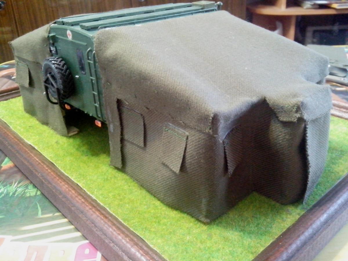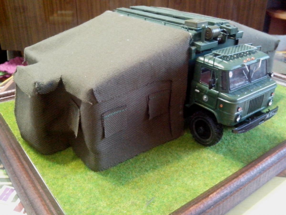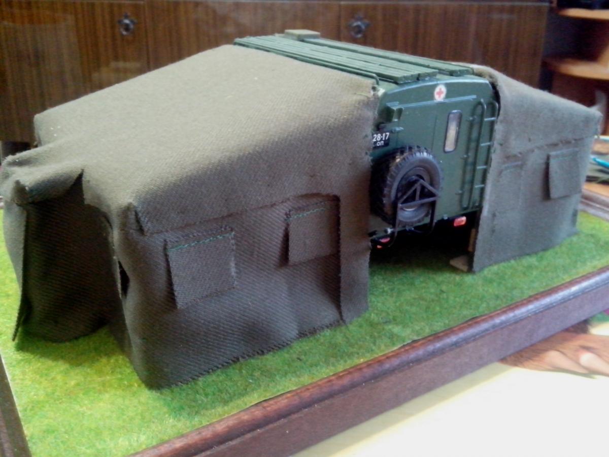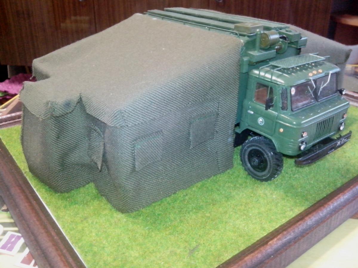 Представляю собранную в развернутом положении автоперевязочную на базе ГАЗ-66 АП-2. Сборка производилась из наборов ГАЗ-66 от восточного экспресса и ЗиЛ-131 КШМ от ICM, а также различной проволоки, ткани и прочее... Покраска акрилом звезды и ревелл.