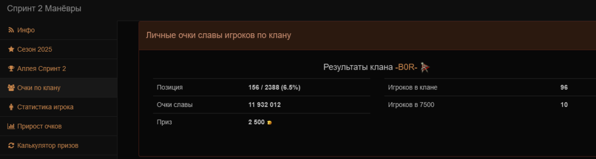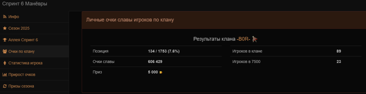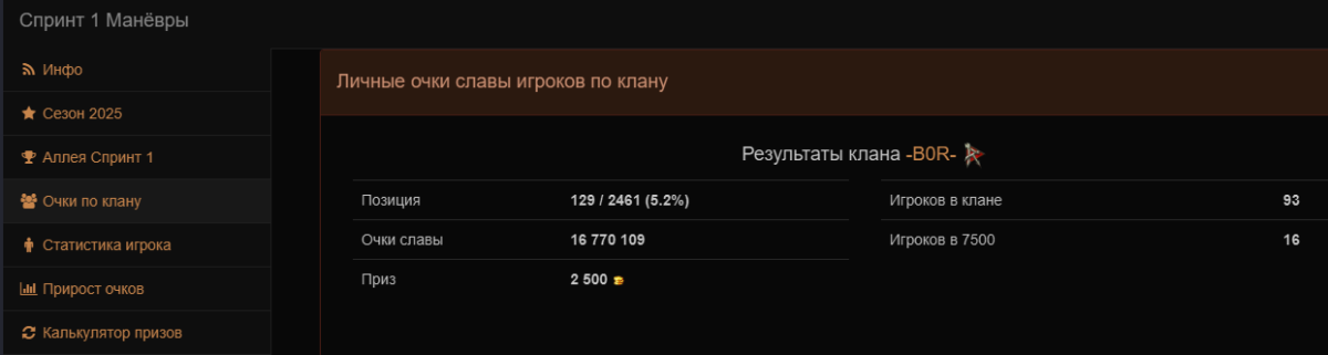 [-B0R-] Brigade of RenegadeОткрыт набор в клан для спринтов и ГК. Стабильное попадание в аллею славы. Клан играет в 4-6 рот, рассматривается возможность входа укомплектованных рот. Статистика по прошедшим ивентам: Общая (Внутри спринт) Спринт 6 Спринт 5 Глобальная карта Спринт 3 Спринт 2 Спринт 1 Кто нам нужен?Мы набираем игроков от 2200 WN8 за последние 1к боёв и от 2700 среднего урона на актуальных топах.В ангаре необходимо наличие не менее 10 актуальных топов, а так же наличие связи TeamSpeak. Подать заявку можно здесь https://lesta.ru/clans/wot/52579/ В первую очередь нас интересуют полевики и координаторы, подробнее под спойлером: Роли В ротах существует следующее распределение: Боец - обычный игрок выполняющий команды полевого командира Координатор - игрок видящий бой и помогающий полевому с направление бойцов, путем дополнительных команд и корректировки игры Полевой командир - игрок, чьи способности не заканчиваются способностью дать раскатку, напротив, умеющий проследить стратегию противника и применить контрстратегию. *Любой игрок может поменяться ролью в зависимости от своих способностей. *Мы готовы рассматривать заявки игроков ниже указанных требований в частных случаях, путем смотра игры в вылазках абс. Прайм-тайм и резервы: Основной прайм с 2000 до 2200 (+3 GMT) Резервы на опыт и опыт экипажа с 1200 до 1800 Резервы на заработок серебра и свободного опыта с 1800 до 0000 (Во время спринтов резервы на серебро 11-12 уровня) *Обязательность игры в абс вне ивентов по усмотрению полевого командира роты, в которую вы будете определены.