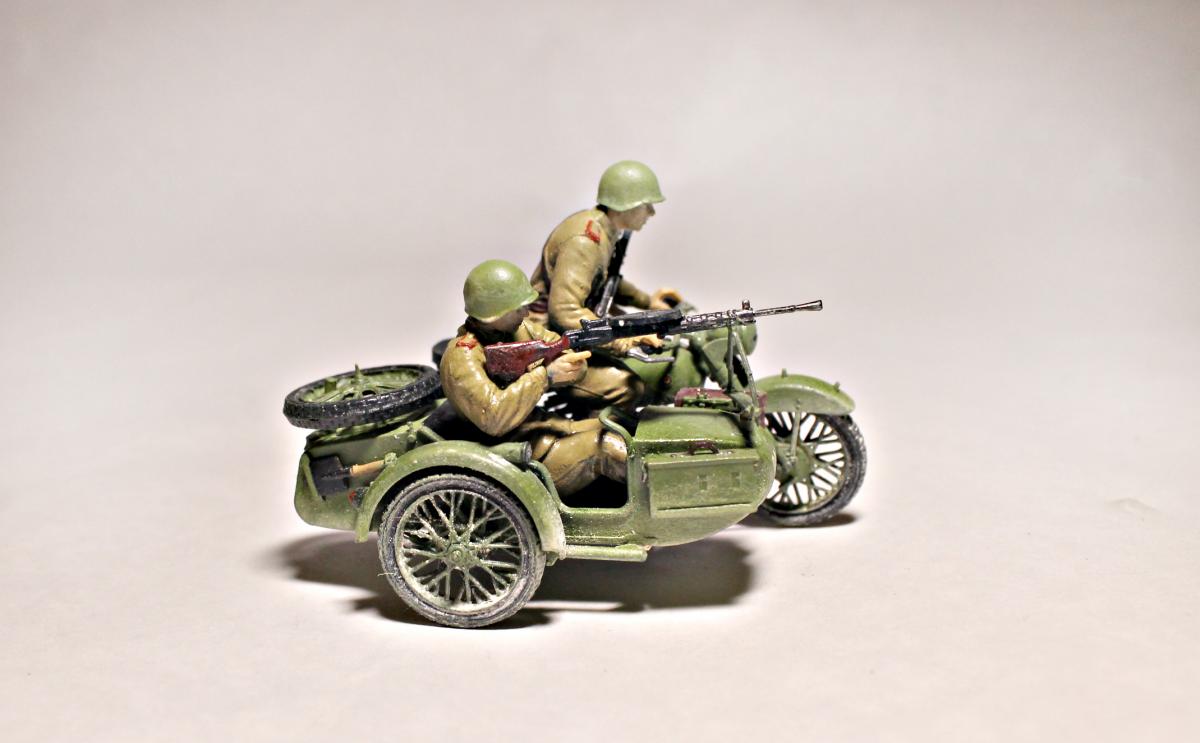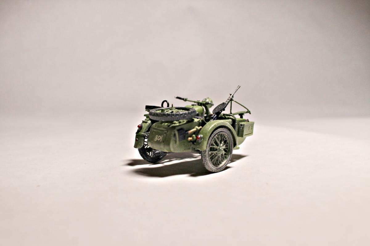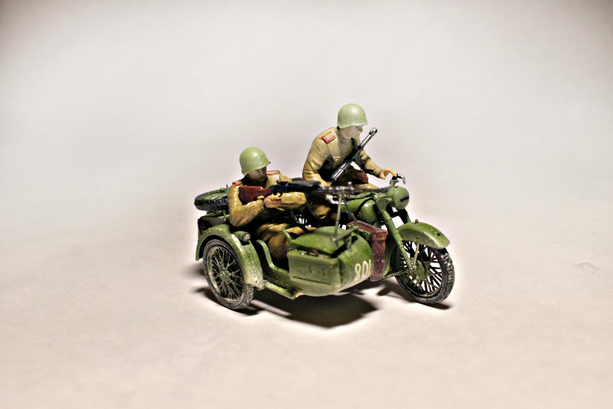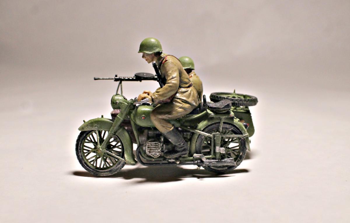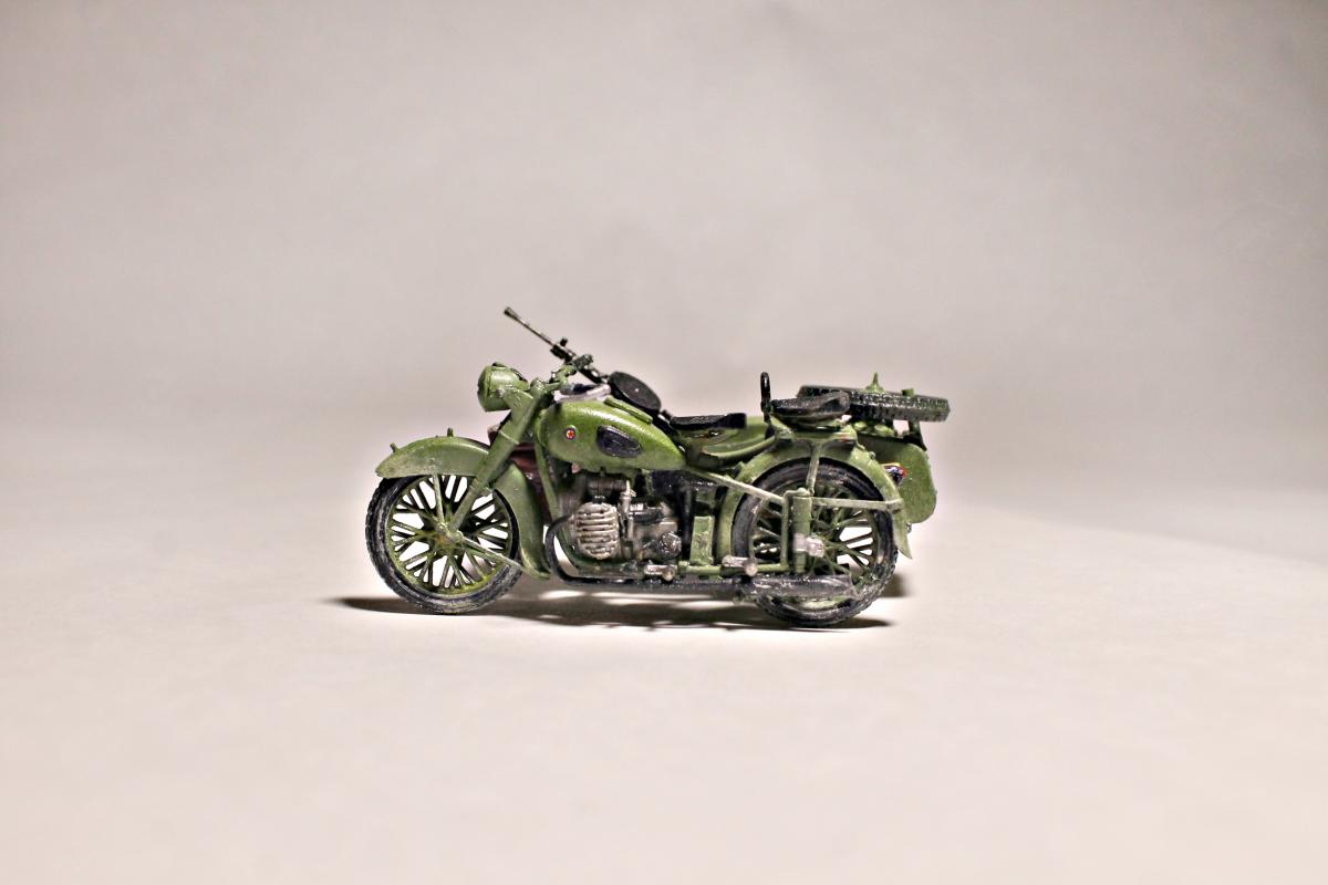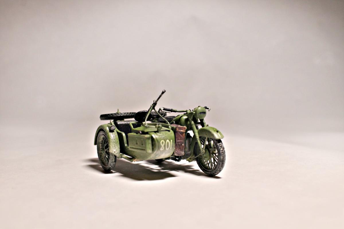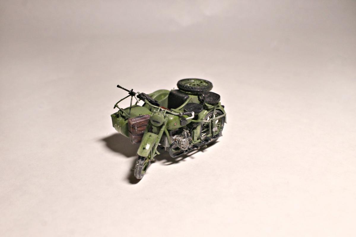 Представляю Вашему вниманию модель тяжелого советского мотоцикла с коляской и экипажем М-72 на основе немецкого мотоцикла R-71. Модель не смотря на свои крохотные размеры весьма детальна и позволяет оставить подвижными все возможные детали (колеса, пулемет, руль). На выбор давалось два варианта экипажа, решил остановиться на представленном на фото, так как планируется использовать данную модель для диограммы. Красилась моделька акрилом от Tamiya. Пигменты использовал Wilder. Для раскраски экипажа так же применял масляные краски. Приятного просмотра.