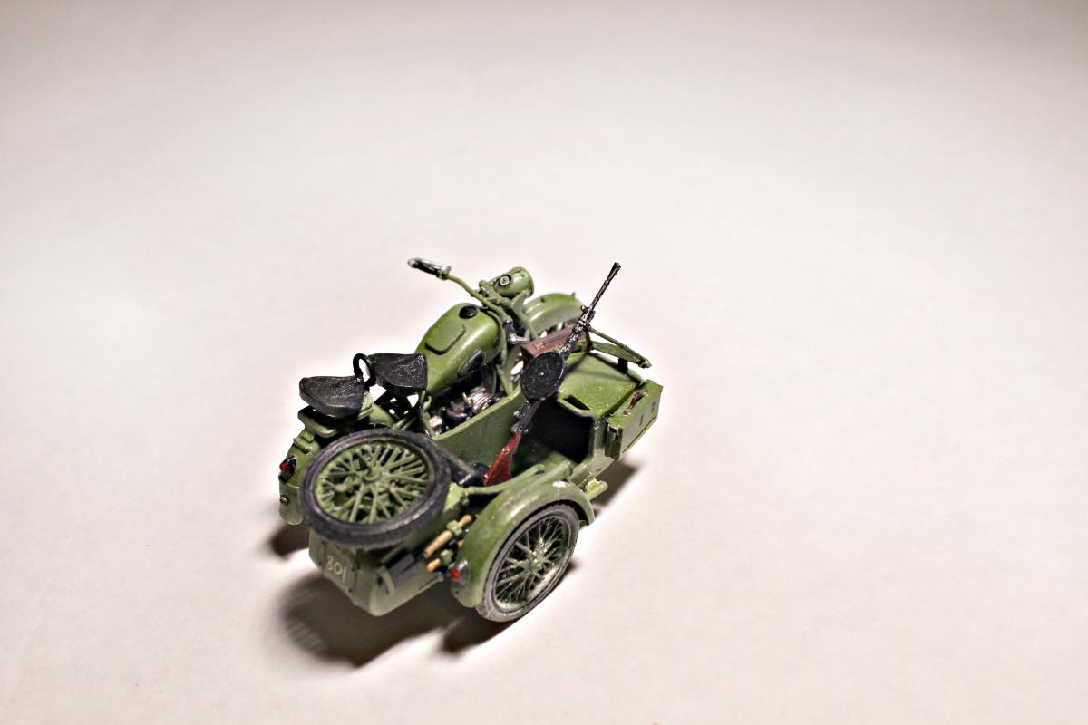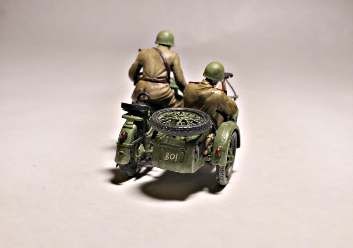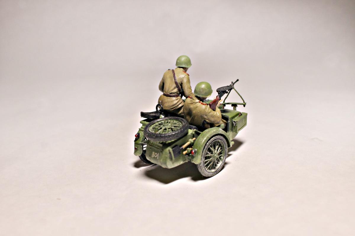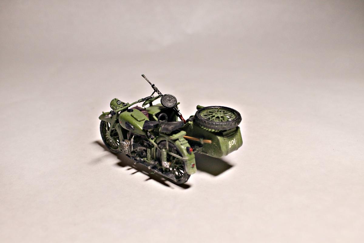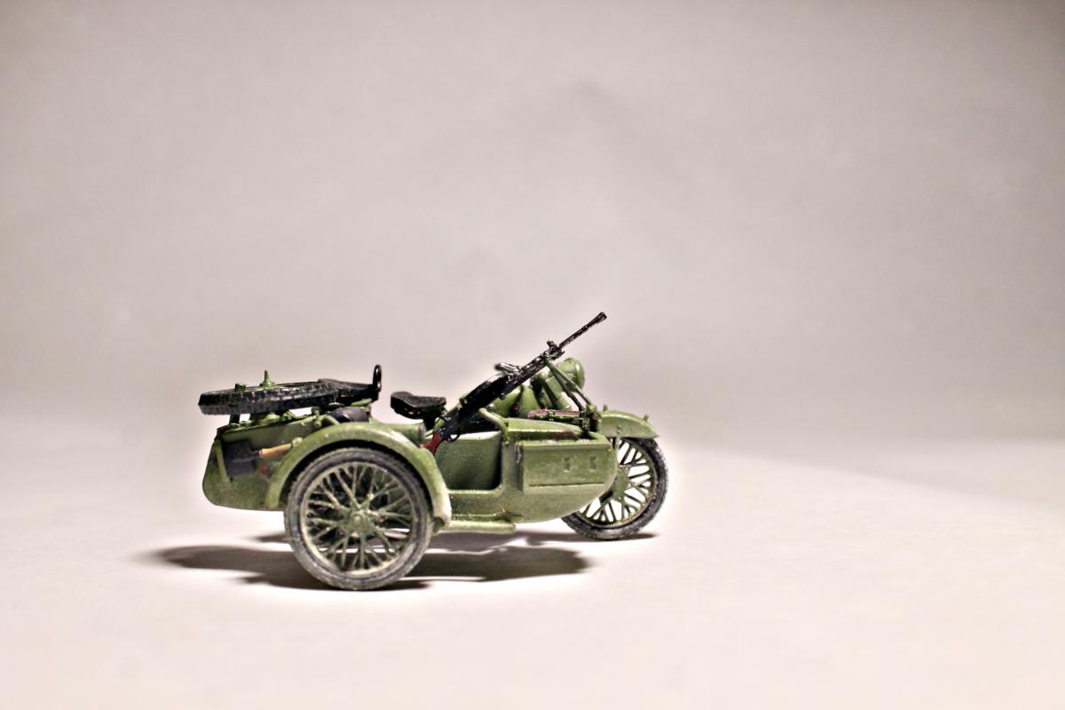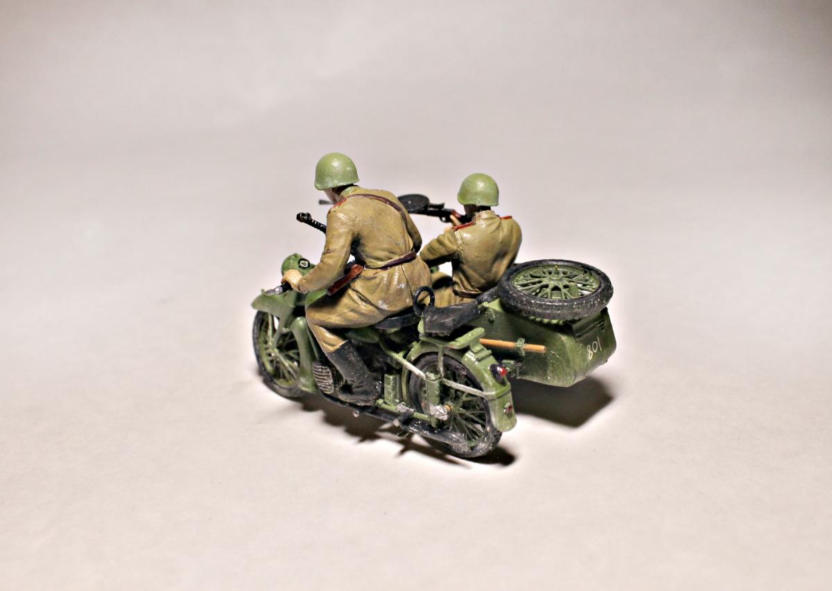 Представляю Вашему вниманию модель тяжелого советского мотоцикла с коляской и экипажем М-72 на основе немецкого мотоцикла R-71. Модель не смотря на свои крохотные размеры весьма детальна и позволяет оставить подвижными все возможные детали (колеса, пулемет, руль). На выбор давалось два варианта экипажа, решил остановиться на представленном на фото, так как планируется использовать данную модель для диограммы. Красилась моделька акрилом от Tamiya. Пигменты использовал Wilder. Для раскраски экипажа так же применял масляные краски. Приятного просмотра.