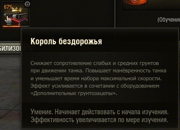 писал в ветке к разработчикам, но по какой то причине мой пост не стали публиковать. Вопрос в следующем. У механика - водителя в доп. професии "Король бездорожья" указано, что, эффект усиливается в сочетании "Дополнительные грунтозацепы" - где взять эти грунтозацепы? В оборудовании Т-50 их нет, видел их только на Хуме и все. Скрин прилагается.