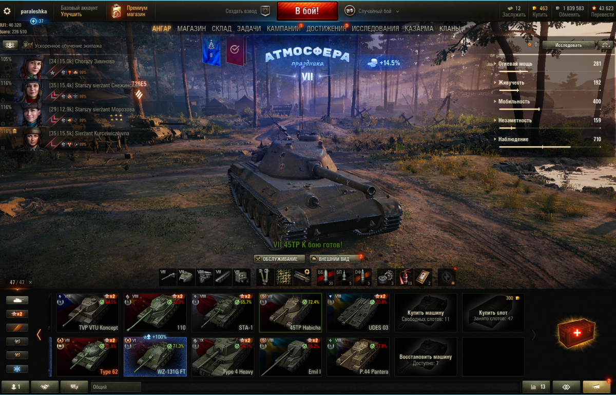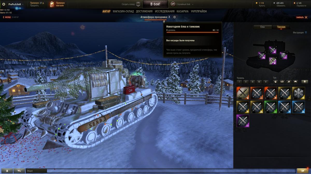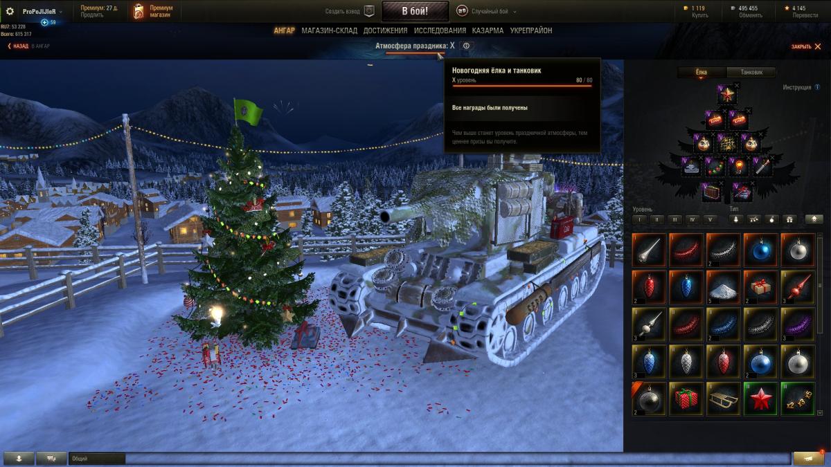 У меня такая проблема, выполнил боевую задачу "Новогоднее наступление". Елку и танк украсил игрушками 5ур. Но достижение Х уровня атмосферы праздника не могу получить, и кроме того когда выхожу в меню игрушки снова меняются местами, т.е на место 5ур становятся 4ур украшения. Так же нету скидок на технику пт Швеции ни на один танк, и нет ни одного члена экипажа. В начале этой акции меня взломали, и какое то время не было доступа к учетке. После ЦПП вернули все, но некоторые елочные и танковые украшения не мои, т.е они появились после кражи аккаунта. Атмосфера праздника уже была развита до 9ур. Очень хочется получить бонусы с этой акции.