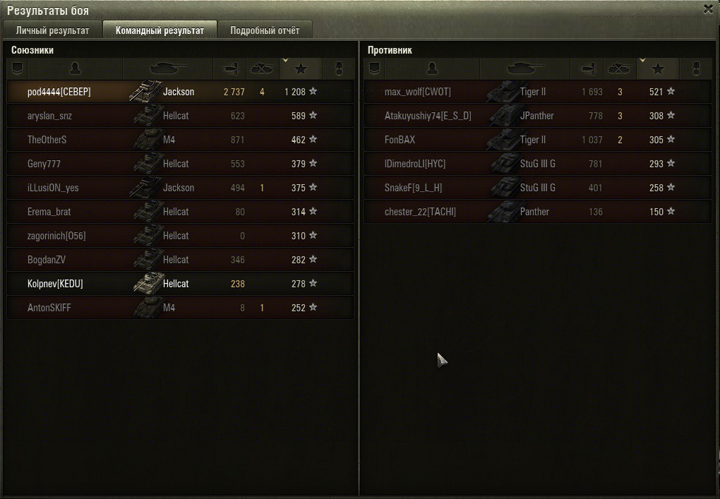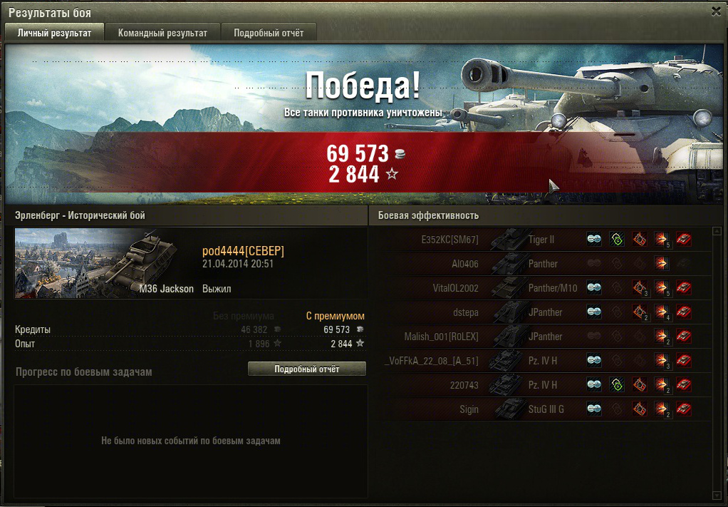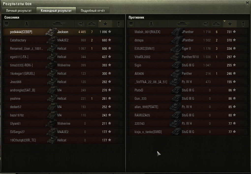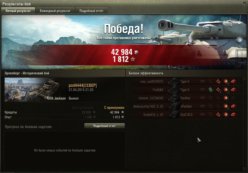 http://upload.wikimedia.org/wikipedia/commons/8/8d/M36-GMC-Danbury.00050krh.jpg Intro Привет всем. Поделюсь своими наблюдения насчет Исторических боев, прокомментирую некоторые мнения насчет баланса, а точнее дисбаланса, а далее расскажу о наиболее эффективном поведении в ИБ и общей тактике за Американцев на Арденах. Пару слов Начнем с того, что я заядлый немцефил, играю с начала ОБТ, так называемый "статист". Отмечу, что в ангаре для ИБ имею пантеру, пз4, джексона. После выхода патча, я конечно был рад возможности покататься на исторически приближенных немцах, их новым модельках, разделению пз4 и штуга на разные модификации и так далее. Однако, я увидел недостаточно позитивную картину, как мне казалось, для советов и особенно амеров. Уничтожать их на немцах, казалось, по истине легко, какого-то особого сопротивления я не почувствовал. Так было по началу, когда патч вышел. Не буду говорить про мощь фердинандов, тигров, королевских тигров и пантер. Сейчас советы на Курской дуге начали массивно набирать СУ-152, штука серьезная и когда их в команде по 5 штук, сказать кто победит трудно. На Балатоне со стороны советов царят ИСУ-122 и СУ-100. В принципе эта техника уравновесила Тигров и Королевских Тигров, учитывая что, обычно, советов балансит в количественном преимуществе, что добавляет мясца и подсвета для советских птшек. Шансы стали равные. Янки гоу хоум или нет? А что насчет амеров? А вот на амерах картина сразу такой радужной не казалась, никаких серьезных орудий амеры не имеют, толстых танчиков тоже. Всё ~500 хп и имеет в лучшем случае 76мм орудие. Хотя последнее утверждение ошибочно, оно было сделано из-за засилье хелкэтов и шерманов в ИБ в первые дни патча. Если рассмотреть внимательнее, то из возможных танков на Арденах, мы можем найти M36 Jackson, вот именно и станет для американцев основным орудием на Арденах. Jackson нас спасет Что имеем?Во-первых 90мм орудие, которое спокойно берет в лоб КТ обычными ББ (в нижний лобовой лист, разумеется), имеет больший альфа-страйк, чем немецкий ахтахт, и почти равную зарядку относительно КТ. Точность хорошая. Пушку к слову устанавливали в дальнейшем на Першинг. Во-вторых нлд толщиной 114 мм и влд в 38мм (не учитывая угол наклона) , что гораздо лучше хэлкатов. Сколько в меня пускали фугасы немцы, привыкшие к стрельбе по 18мм хэлкэтам, я умолчу. В-третьих равный обзор с пантерой в 370м, КТ немного лучше, у него 390м; но мы не такие сарайные как они, а значит в плане видимости мы как минимум на равных, если не превосходим. М36 все чаще начал появляться в ИБ, что радует, и все чаще амеры дают равный бой. Общая тактика амеров. Оценим силы: обычно амеров больше по количеству, амеры быстрее, меньше по габаритам и имеют отличные углы вертикальной наводки, что позволяет при правильном распределении кусать немцев со всех сторон. Карта Эрленберг просто отлично подходит для наших танков, мы имеем кучу неровностей, в которых мы можем скрывать свой силуэт, кучу кустов, чтобы прятаться и светить и так же много домов, среди которых можно не плохо петлять от неуклонных давящих немцев. Основные ошибки: что со стороны немцев, что с нашей - разделяться. Сразу ехать на другой берег не имеет смысла, не узнав где находятся танки противника. Часто случается так, что 3-4 амера просто встречают 1 кт + парочку пантер, а путей отхода уже нет. Бессмысленный мув и -4 в команде. Всё, что нужно сделать, это полнос
