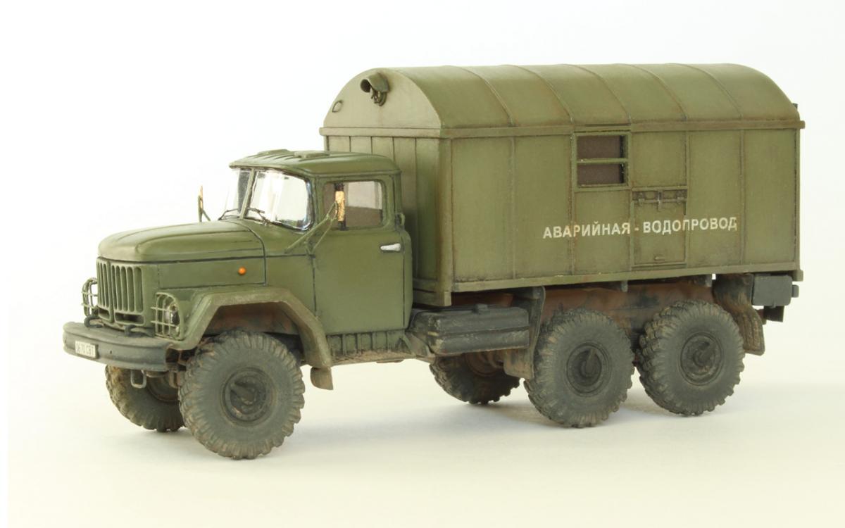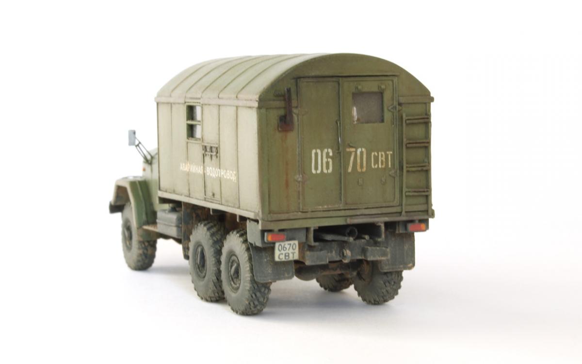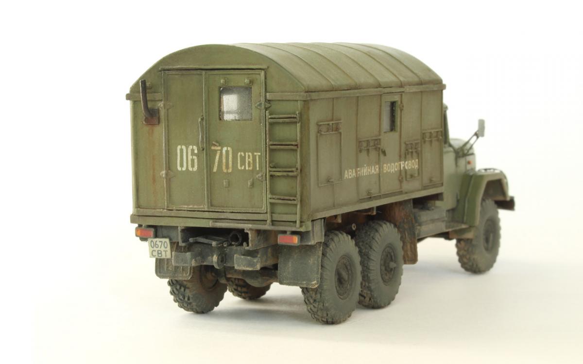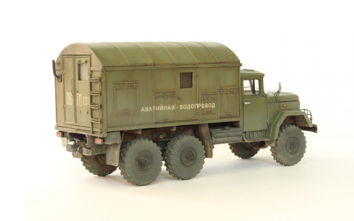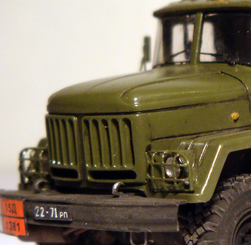 Очередной грузовичёк. ЗиЛ-131 с кузовом КУНГ-1М. Кунг от Balaton вроде не плох,но чтобы собрать что-то похожее на правду надо брать конкретную машину,и делать все окна и лючки по образцу.Потому что машины имели разное предназначение,количество и расположение лючков,дверей и окон у всех было своё. Поэтому я собрал одну из машин на которой во второй половине 90-х годов довелось поработать. На нашей машине как раз было по одному окну,и почти такое расположение люков, в кунге стояли САГ(сварочник),верстак,"лягушка" - насос для откачивания воды,пара лежаков и буржуйка. По модели:набор от ИСМ - сточил тощину бамперов,перенёс выхлоп,насколько позволял пластик сточил топливные баки ,чтобы утопить их поглубже( у ИСМ они уж больно выпирают).Нарезал протектор,изготовил всякие поручни-подножки. На кунге добавил трубу от буржуйки,под кунг запихал лестницу,лом,куски труб. Зеркала и ограждение фар - травление от Лансер,декали от Георгия Сушкова(Народная декаль). Окраска эмалями Revell,смывка - масло,запыление - пастель и пигменты MIG. PS.Номер почти вспомнил - могу ошибаться только в последней букве.