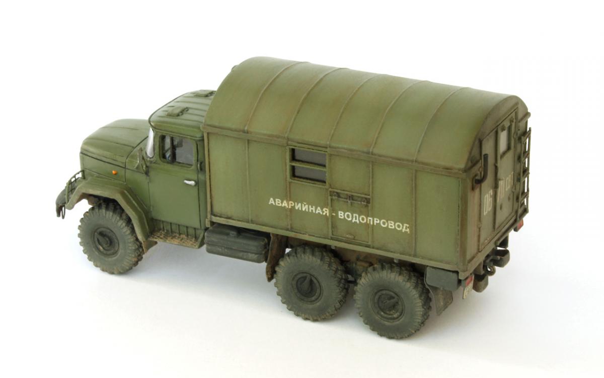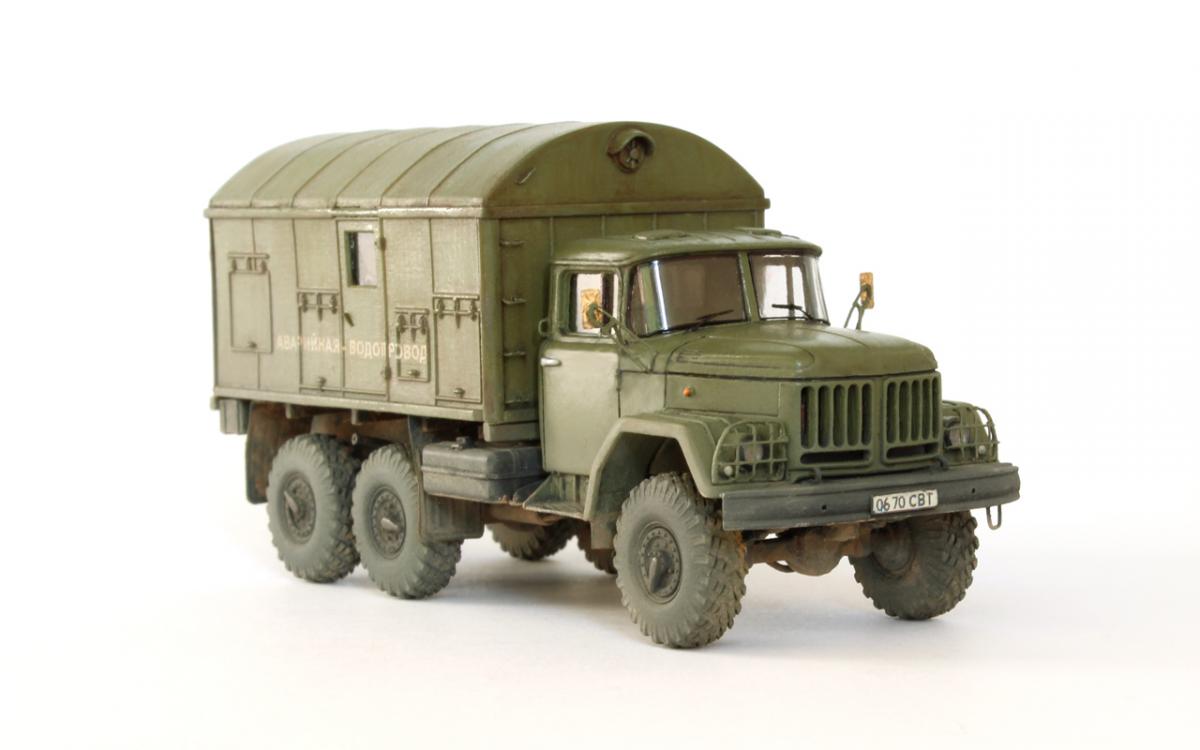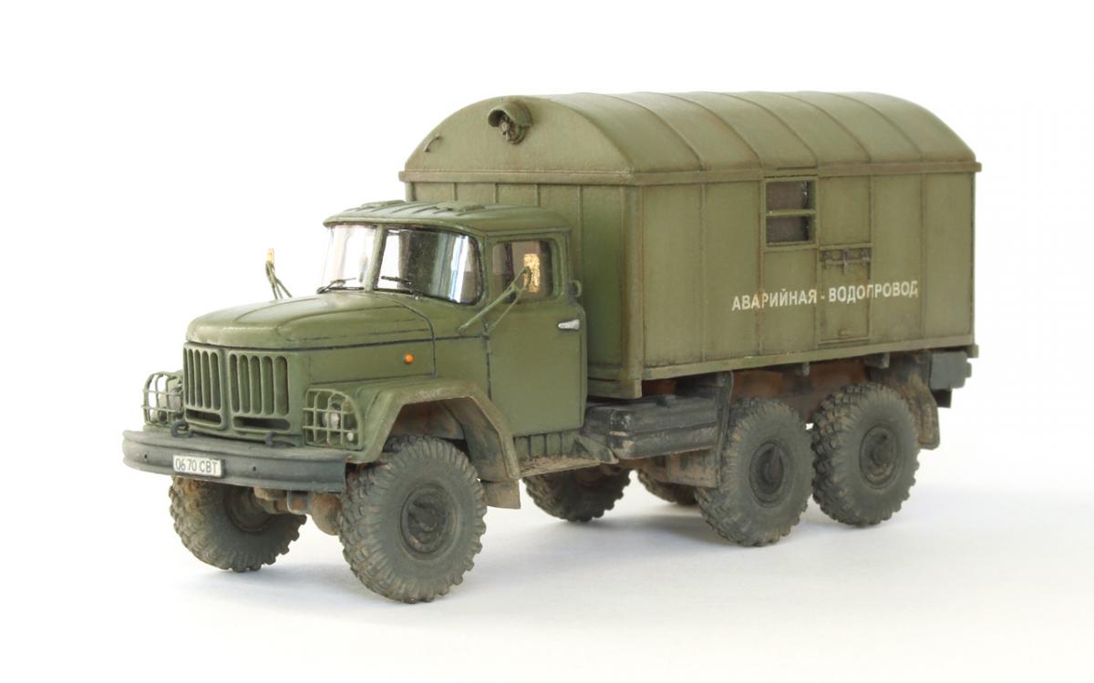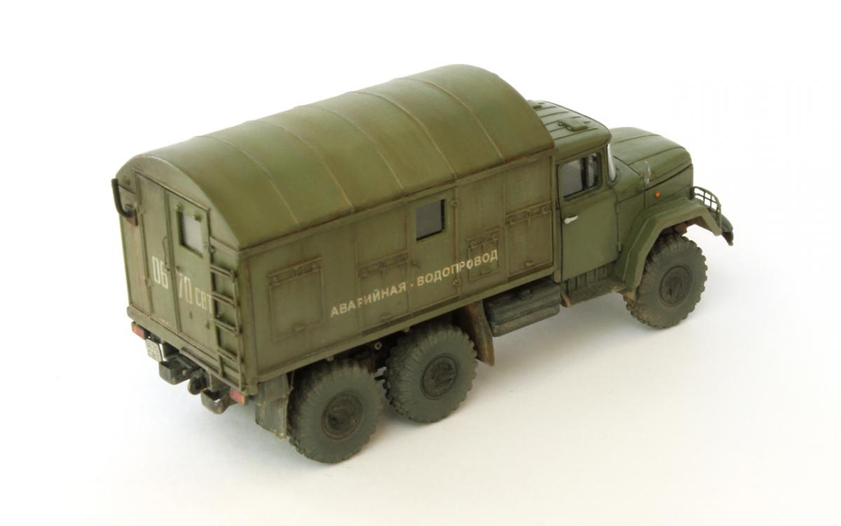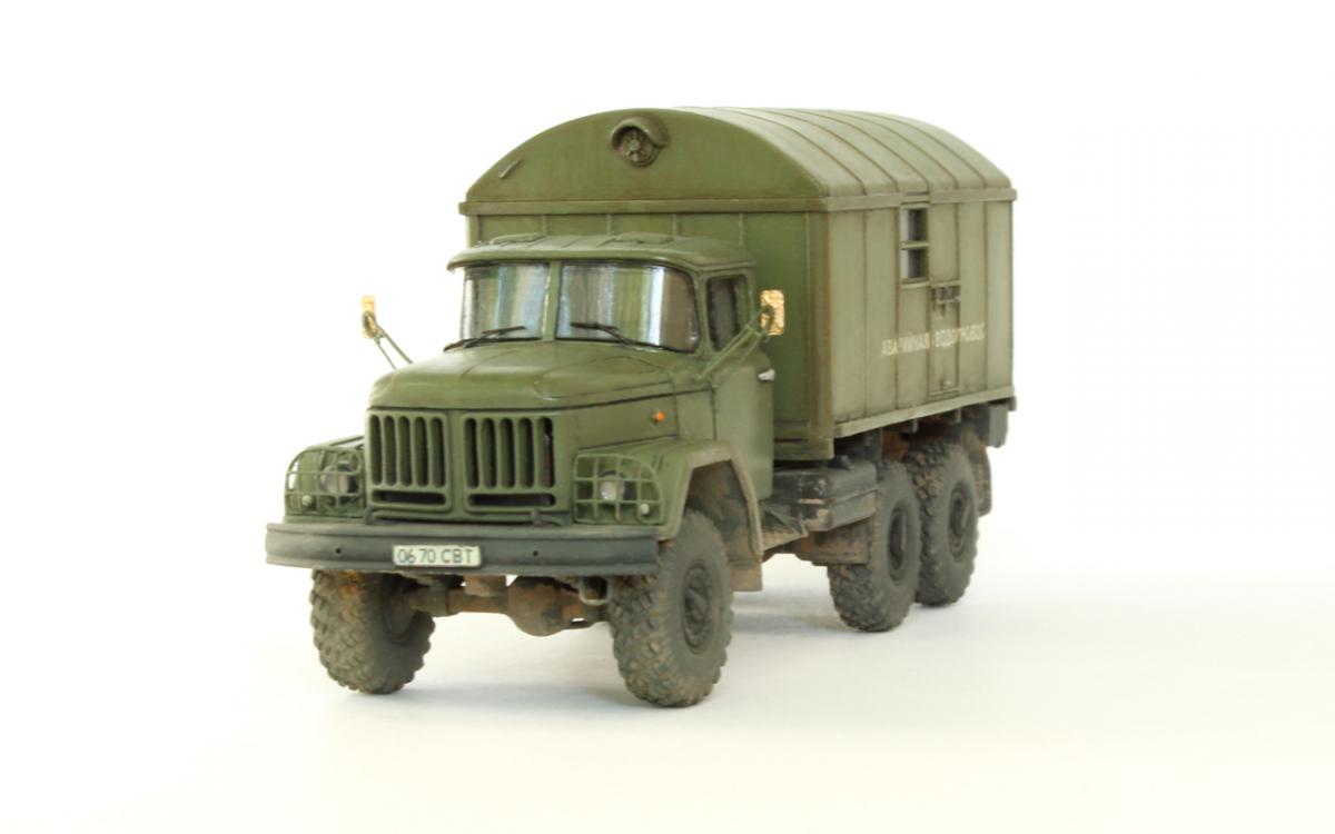 Очередной грузовичёк. ЗиЛ-131 с кузовом КУНГ-1М. Кунг от Balaton вроде не плох,но чтобы собрать что-то похожее на правду надо брать конкретную машину,и делать все окна и лючки по образцу.Потому что машины имели разное предназначение,количество и расположение лючков,дверей и окон у всех было своё. Поэтому я собрал одну из машин на которой во второй половине 90-х годов довелось поработать. На нашей машине как раз было по одному окну,и почти такое расположение люков, в кунге стояли САГ(сварочник),верстак,"лягушка" - насос для откачивания воды,пара лежаков и буржуйка. По модели:набор от ИСМ - сточил тощину бамперов,перенёс выхлоп,насколько позволял пластик сточил топливные баки ,чтобы утопить их поглубже( у ИСМ они уж больно выпирают).Нарезал протектор,изготовил всякие поручни-подножки. На кунге добавил трубу от буржуйки,под кунг запихал лестницу,лом,куски труб. Зеркала и ограждение фар - травление от Лансер,декали от Георгия Сушкова(Народная декаль). Окраска эмалями Revell,смывка - масло,запыление - пастель и пигменты MIG. PS.Номер почти вспомнил - могу ошибаться только в последней букве.