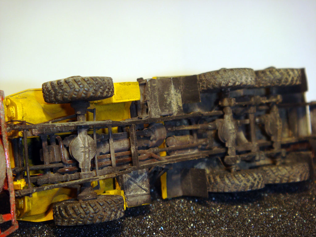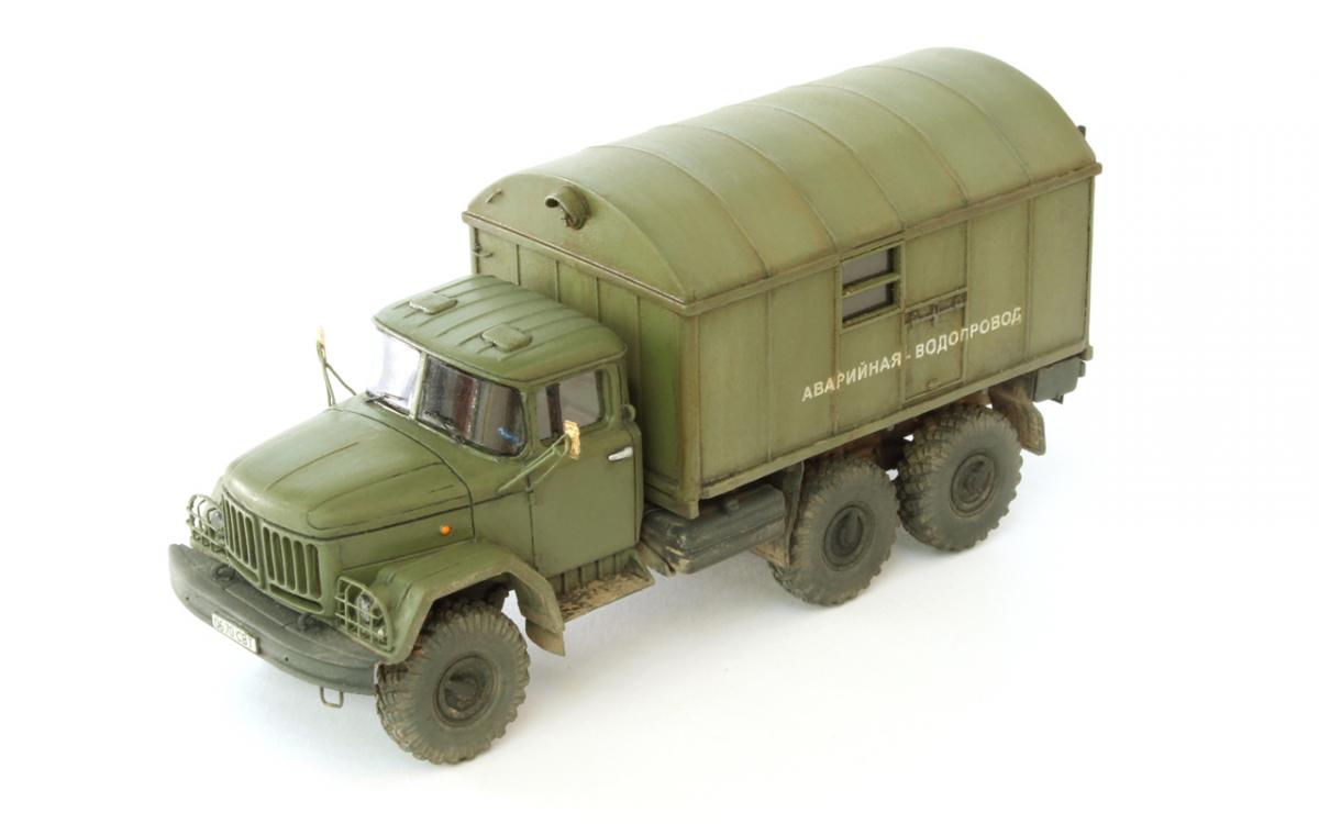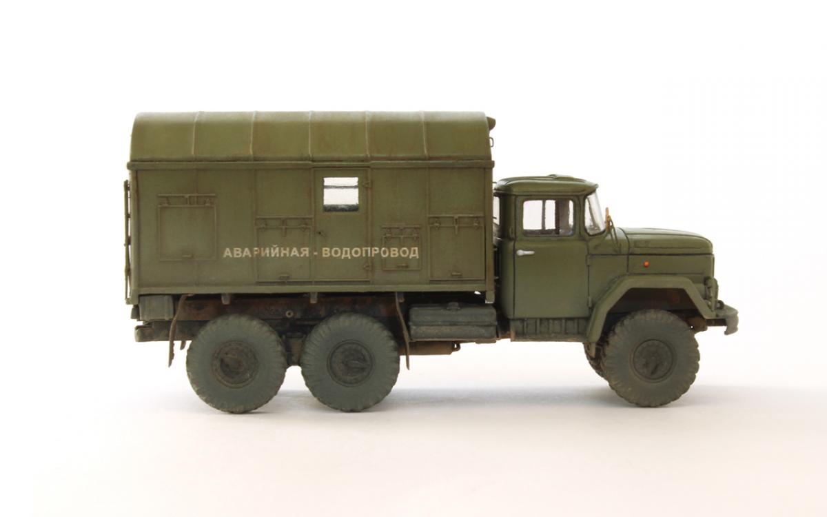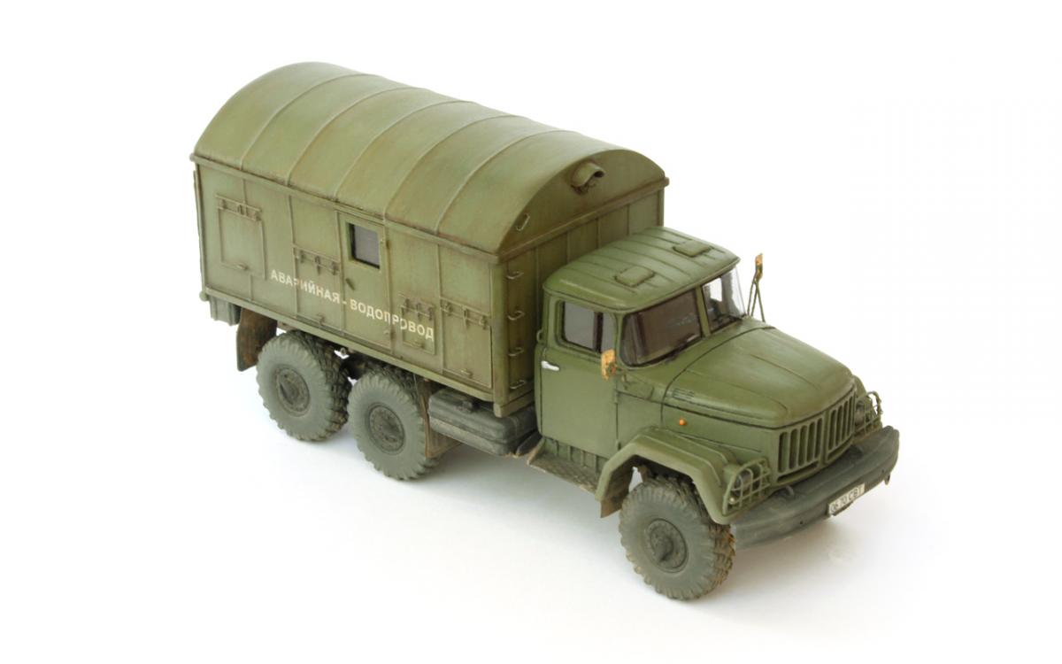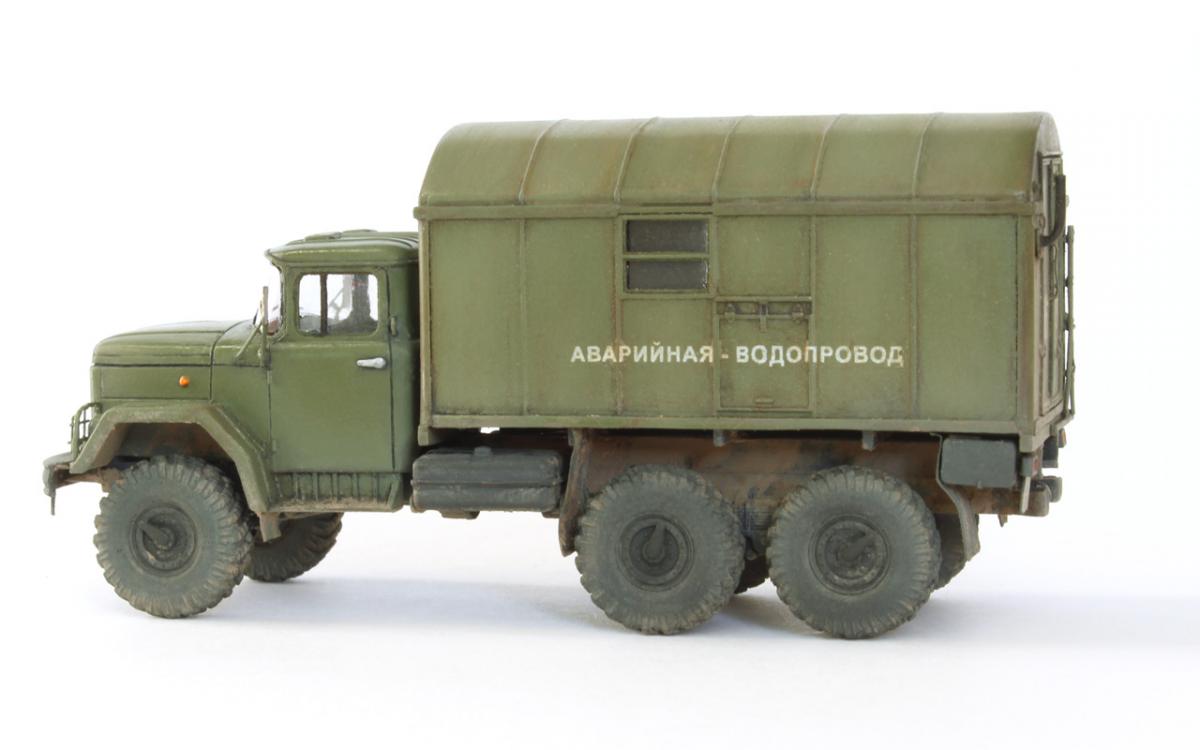 Очередной грузовичёк. ЗиЛ-131 с кузовом КУНГ-1М. Кунг от Balaton вроде не плох,но чтобы собрать что-то похожее на правду надо брать конкретную машину,и делать все окна и лючки по образцу.Потому что машины имели разное предназначение,количество и расположение лючков,дверей и окон у всех было своё. Поэтому я собрал одну из машин на которой во второй половине 90-х годов довелось поработать. На нашей машине как раз было по одному окну,и почти такое расположение люков, в кунге стояли САГ(сварочник),верстак,"лягушка" - насос для откачивания воды,пара лежаков и буржуйка. По модели:набор от ИСМ - сточил тощину бамперов,перенёс выхлоп,насколько позволял пластик сточил топливные баки ,чтобы утопить их поглубже( у ИСМ они уж больно выпирают).Нарезал протектор,изготовил всякие поручни-подножки. На кунге добавил трубу от буржуйки,под кунг запихал лестницу,лом,куски труб. Зеркала и ограждение фар - травление от Лансер,декали от Георгия Сушкова(Народная декаль). Окраска эмалями Revell,смывка - масло,запыление - пастель и пигменты MIG. PS.Номер почти вспомнил - могу ошибаться только в последней букве.