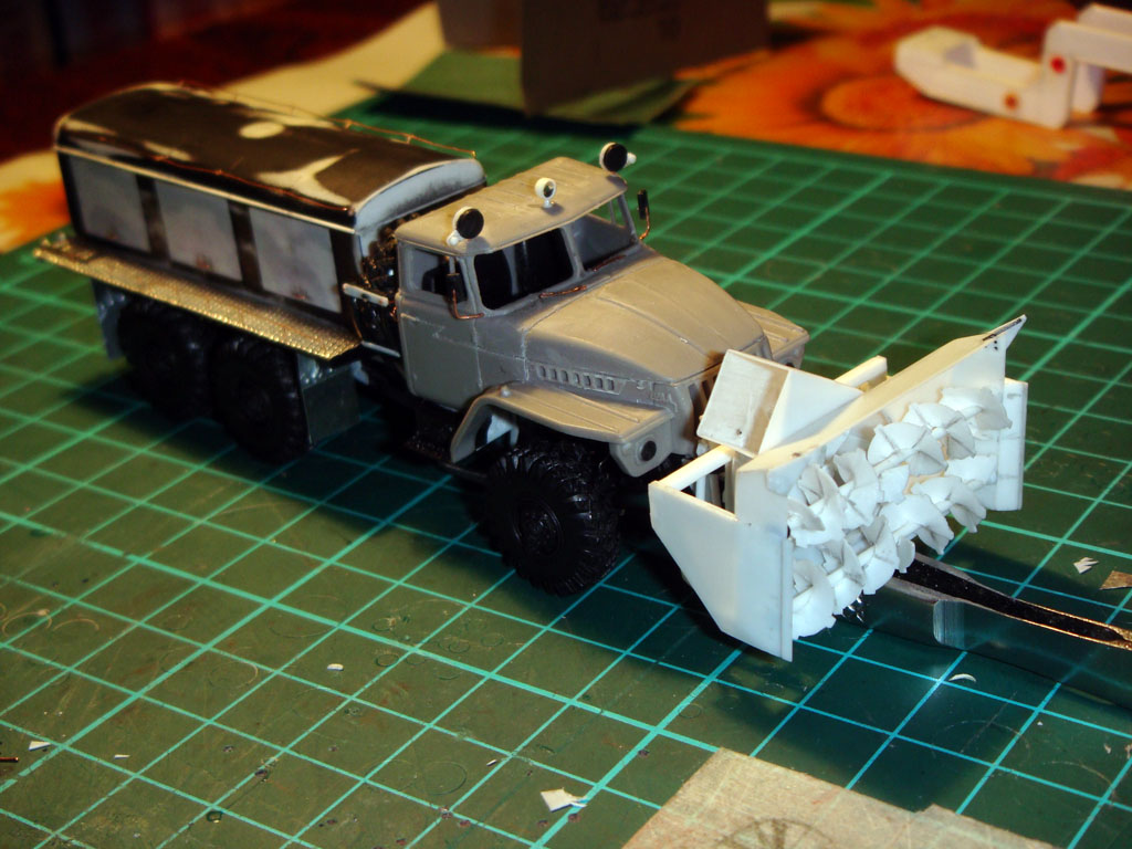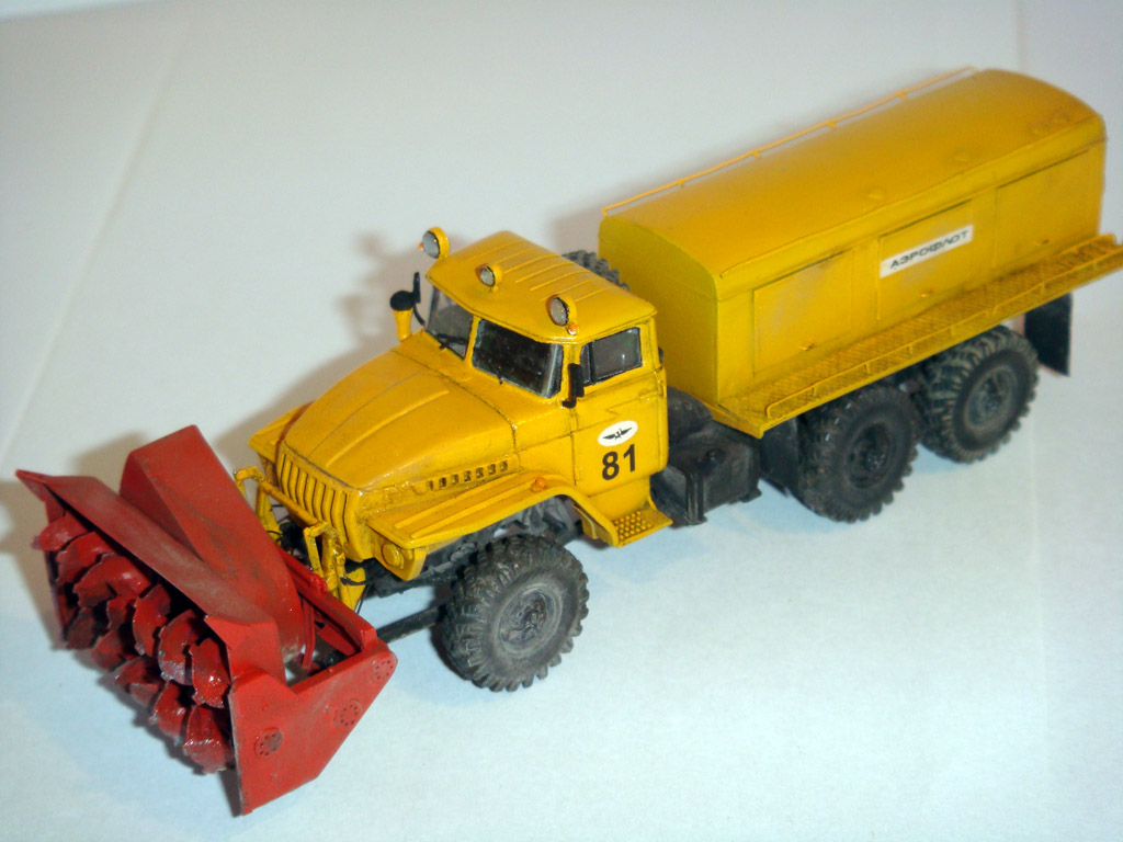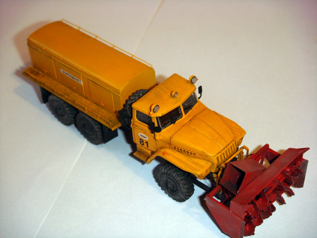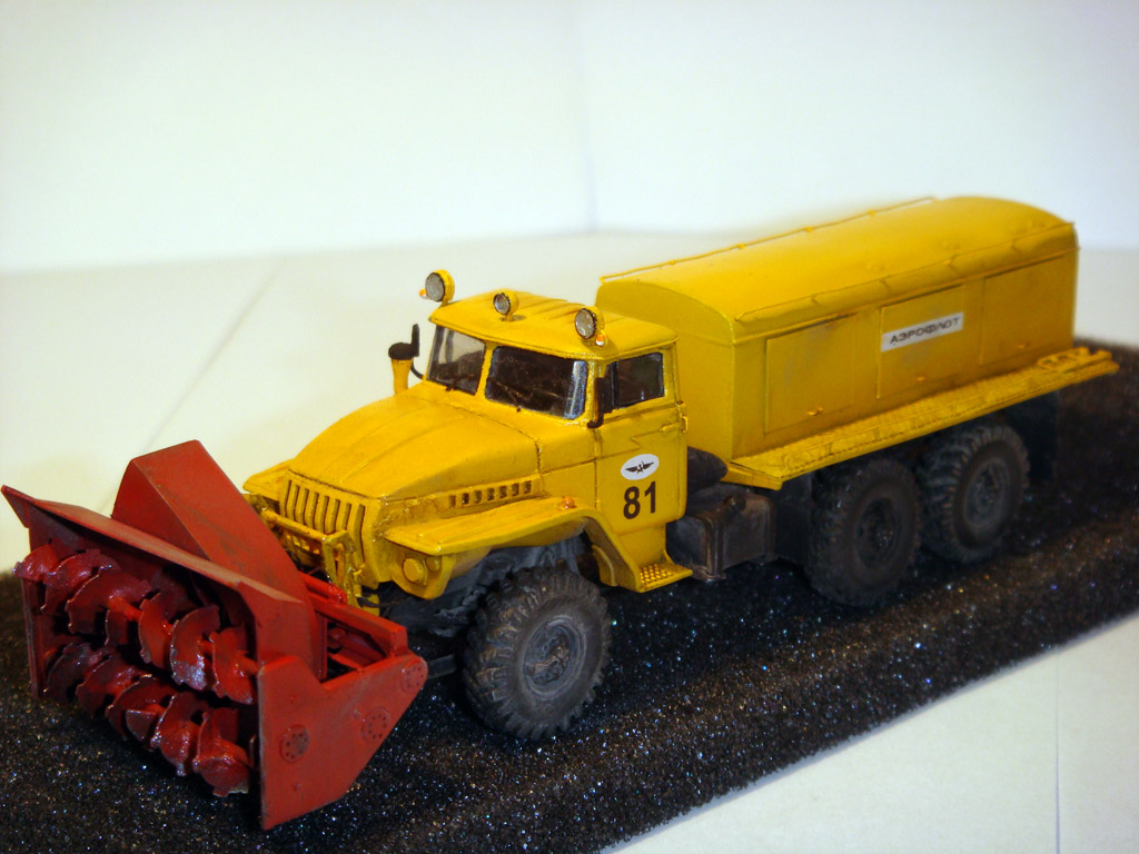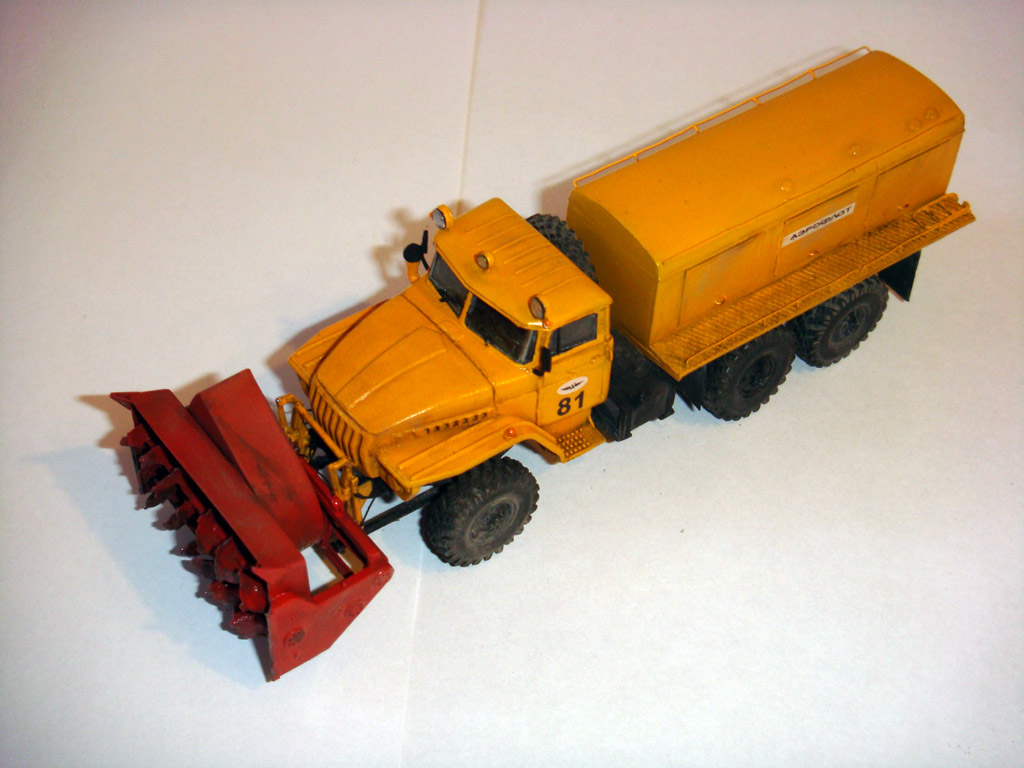 одна из старых моделей - Cнегоочиститель ДЭ-226 на шасси урал 4320. О прототипе: Шнекороторный снегоочиститель ДЭ-226 предназначен для очистки от снега автомагистралей, взлетно-посадочных полос, рулежных дорожек, мест стоянок самолетов, а также для отбрасывания снежных валов высотой до 1,6 метра на расстояние 30-50 метров. Привод рабочих органов снегоочистителя осуществляется от отдельного дизельного двигателя. Основа модели,как всегда ИСМ,масштаб 72-ой. В постройке использовал каталоги запчастей и многочисленные фото прототипа. По модели:удлинена рама сзади,переделана выхлопная система,сделаны продольная и поперечная рулевые тяги,гур,топливный бак перепилен в 200-сот литровый,сделаны тормозные трубки,подводка к баку,переделан ДЗК,по схемам сделаны ресиверы,доработан аккумуляторный ящик с подножкой.Нарезан протектор на колесах.На кабине переделаны выштамповки сзади,сделаны поручни,установлена оптика на крыше. Покраска эмалями Ревелл,смывка - масло,запыление - пастель и пигменты Миг.