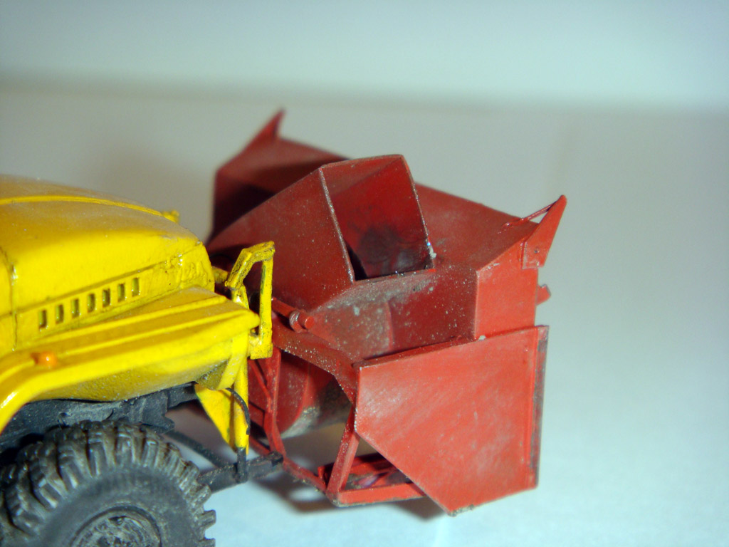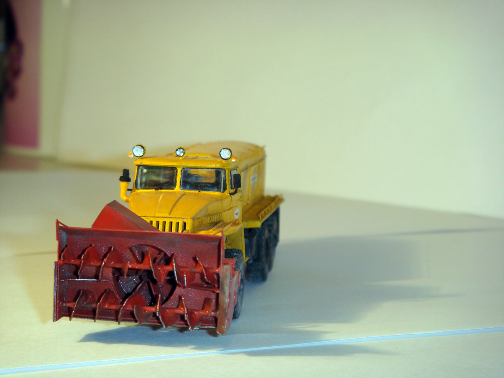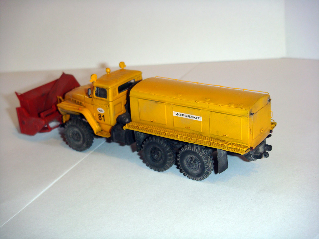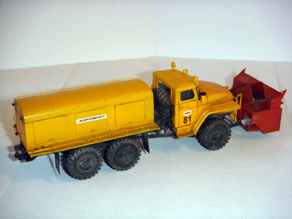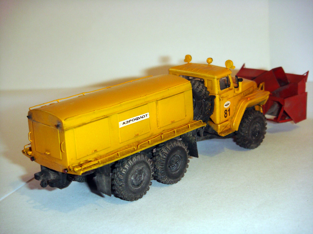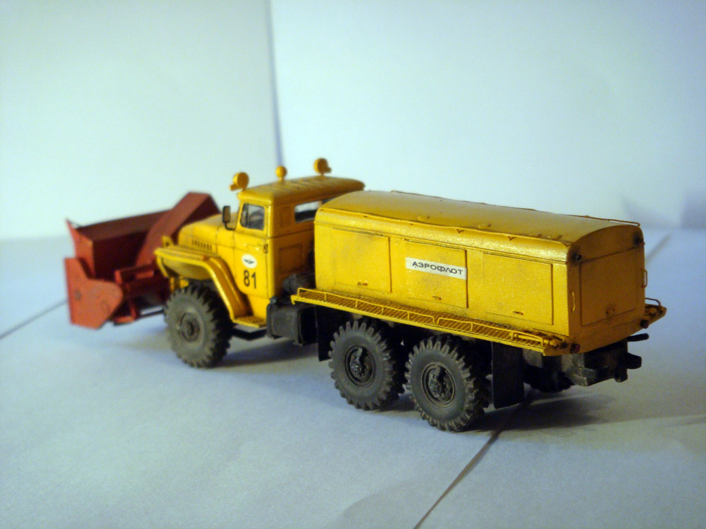 одна из старых моделей - Cнегоочиститель ДЭ-226 на шасси урал 4320. О прототипе: Шнекороторный снегоочиститель ДЭ-226 предназначен для очистки от снега автомагистралей, взлетно-посадочных полос, рулежных дорожек, мест стоянок самолетов, а также для отбрасывания снежных валов высотой до 1,6 метра на расстояние 30-50 метров. Привод рабочих органов снегоочистителя осуществляется от отдельного дизельного двигателя. Основа модели,как всегда ИСМ,масштаб 72-ой. В постройке использовал каталоги запчастей и многочисленные фото прототипа. По модели:удлинена рама сзади,переделана выхлопная система,сделаны продольная и поперечная рулевые тяги,гур,топливный бак перепилен в 200-сот литровый,сделаны тормозные трубки,подводка к баку,переделан ДЗК,по схемам сделаны ресиверы,доработан аккумуляторный ящик с подножкой.Нарезан протектор на колесах.На кабине переделаны выштамповки сзади,сделаны поручни,установлена оптика на крыше. Покраска эмалями Ревелл,смывка - масло,запыление - пастель и пигменты Миг.