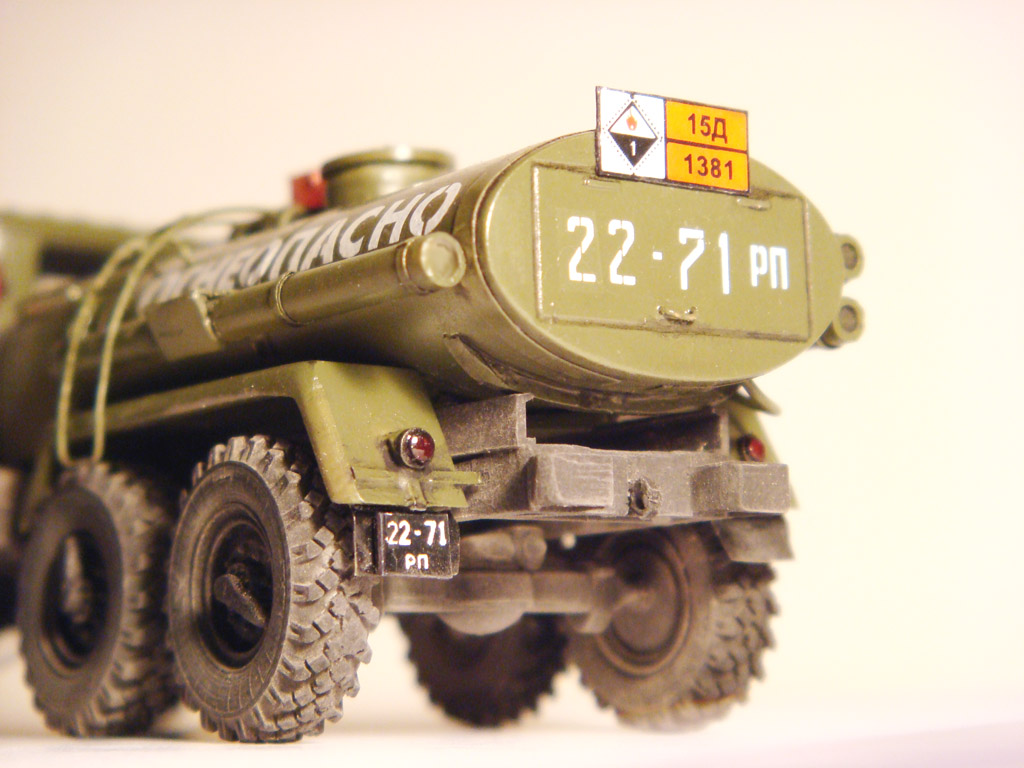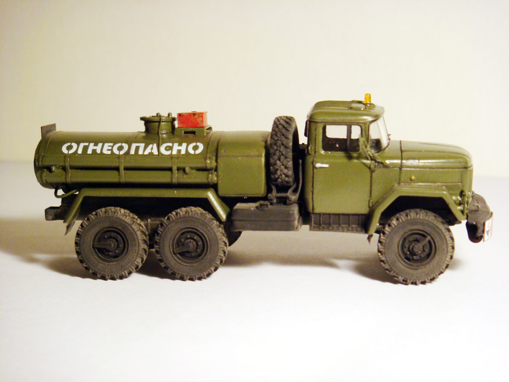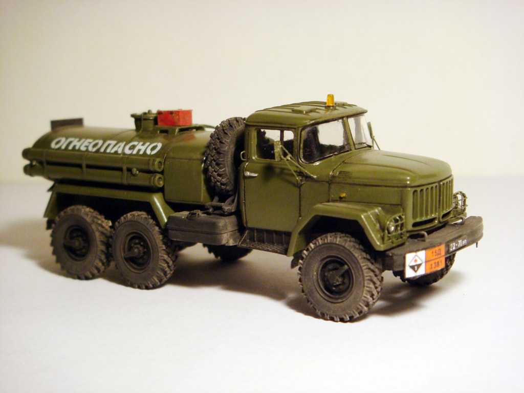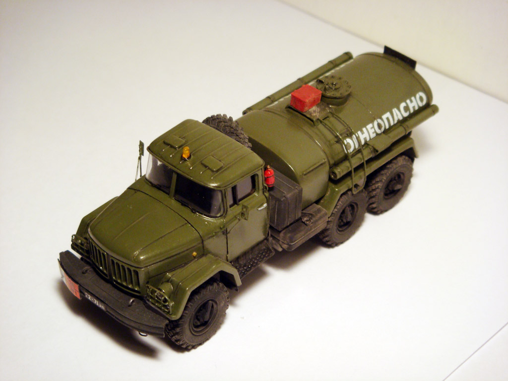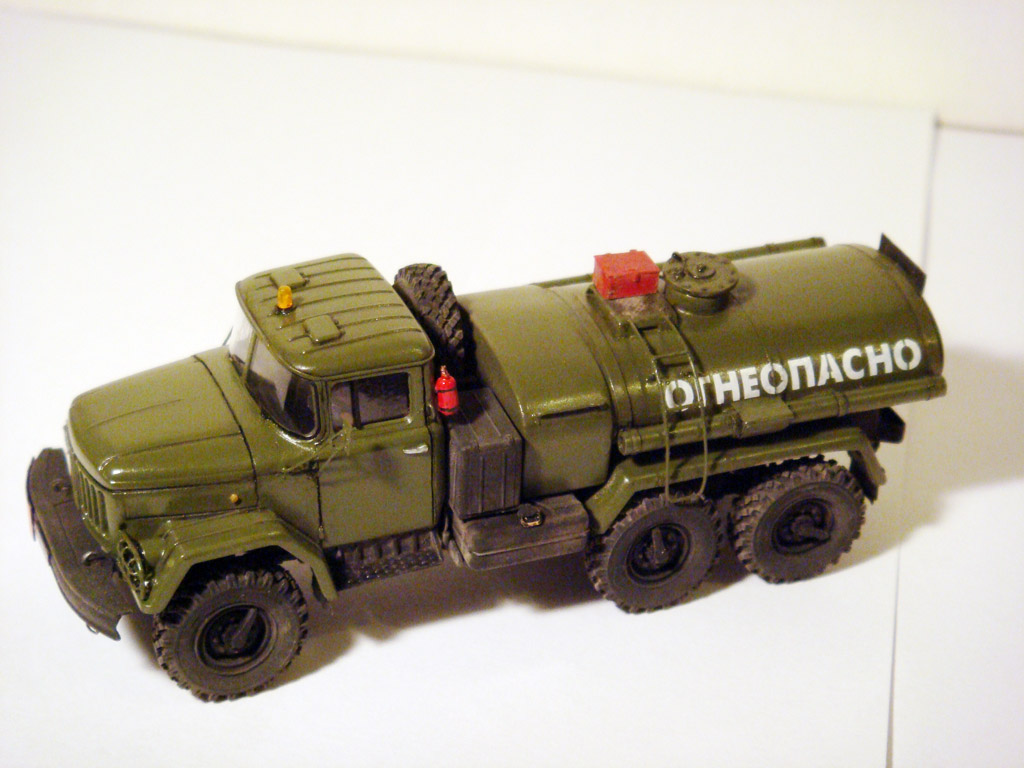 очередной грузовик ЗИЛ - 131 АТЗ-4,4-131 Топливозаправщик предназначен для транспортирования, кратковременного хранения и заправки различной техники светлыми нефтепродуктами с одновременным измерением объема выданного топлива. Цистерна оцинкованная или алюминиевая, эксплуатационная вместимость 4,4 м3, счетчики, 2 пистолета, рукава. По модели: немного сточены крепления баков,также сточен до приемлемой толщины задний бампер.Немного переделан передний бампер,по толщине и форме. Зеркала,дворники и решетки на фарах и крышки заливных горловин - самодельное травление группы московских комрадов. Мигалка и поворотники - цветные прозрачные шпажки,фары - эльф.Огнетушитель от урала.На бочке заменил ленты крепления,добавил ещё один пенал на правой стороне,чуть доработал площадку перед горловиной,сделал лестницу и поручни из проволоки,сделал площадки для задних фар и сами фары,брызговики фольга. Доработал ДЗК,сделал топливные и тормозные трубки.Ну и главное - колёса от танкограда(правда ещё старых выпусков).Колесики очень понравились.Именно поэтому решил сильно машину не пачкать,по легенде это или машина обслуживающая парад(обычно стоят в сторонке,на всякий случай),или машина с хранения, недавно расконсервированная. От себя добавил ящик с песком(видел на фотках такой способ установки). Красил,как всегда - эмали ревелл,смывка - масло,пыль пастель и пигменты МИГ. -