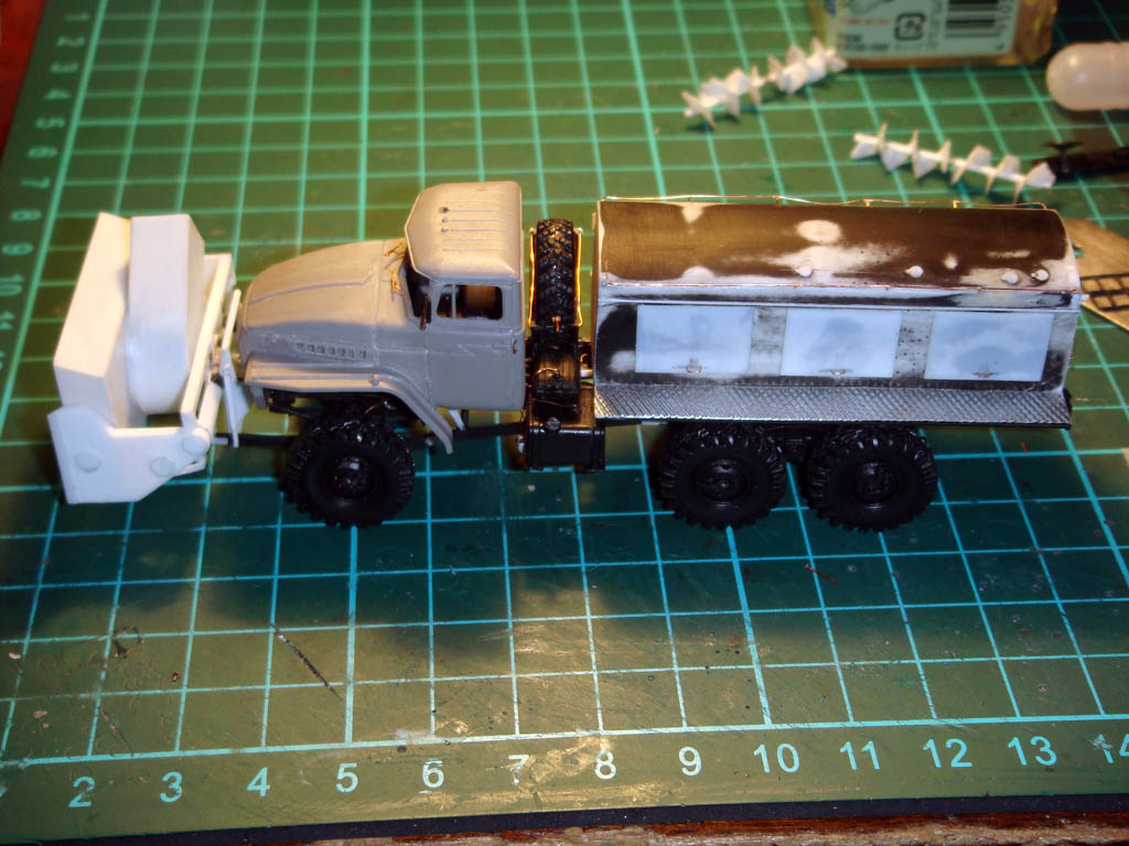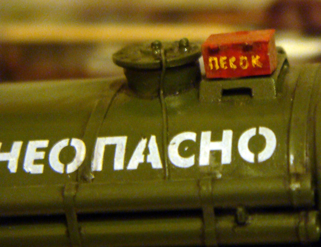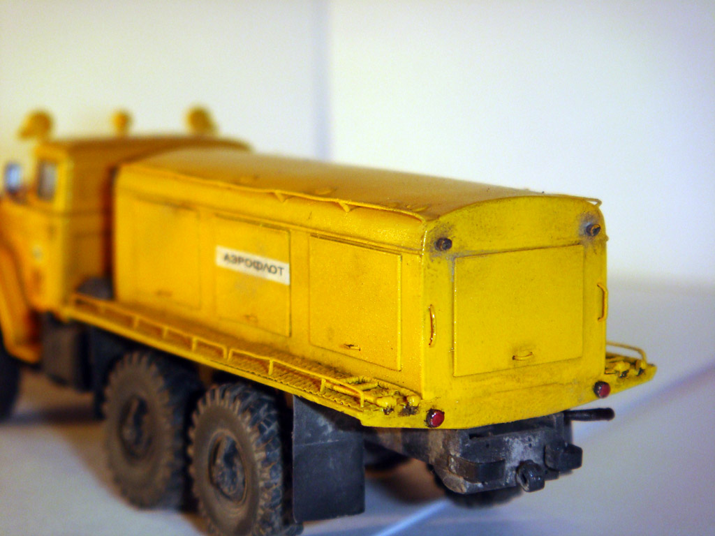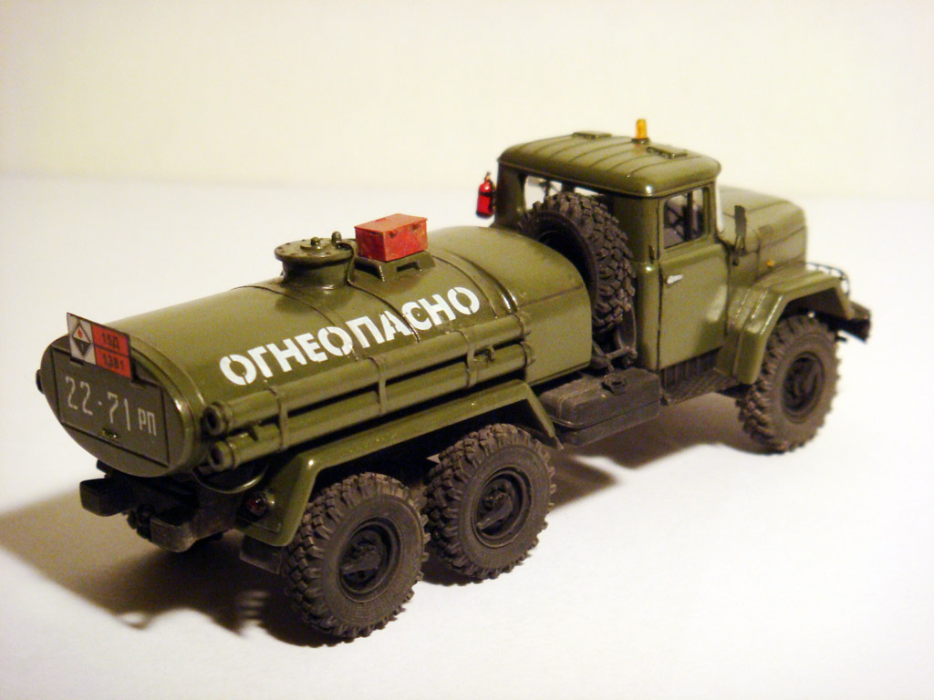 очередной грузовик ЗИЛ - 131 АТЗ-4,4-131 Топливозаправщик предназначен для транспортирования, кратковременного хранения и заправки различной техники светлыми нефтепродуктами с одновременным измерением объема выданного топлива. Цистерна оцинкованная или алюминиевая, эксплуатационная вместимость 4,4 м3, счетчики, 2 пистолета, рукава. По модели: немного сточены крепления баков,также сточен до приемлемой толщины задний бампер.Немного переделан передний бампер,по толщине и форме. Зеркала,дворники и решетки на фарах и крышки заливных горловин - самодельное травление группы московских комрадов. Мигалка и поворотники - цветные прозрачные шпажки,фары - эльф.Огнетушитель от урала.На бочке заменил ленты крепления,добавил ещё один пенал на правой стороне,чуть доработал площадку перед горловиной,сделал лестницу и поручни из проволоки,сделал площадки для задних фар и сами фары,брызговики фольга. Доработал ДЗК,сделал топливные и тормозные трубки.Ну и главное - колёса от танкограда(правда ещё старых выпусков).Колесики очень понравились.Именно поэтому решил сильно машину не пачкать,по легенде это или машина обслуживающая парад(обычно стоят в сторонке,на всякий случай),или машина с хранения, недавно расконсервированная. От себя добавил ящик с песком(видел на фотках такой способ установки). Красил,как всегда - эмали ревелл,смывка - масло,пыль пастель и пигменты МИГ. -