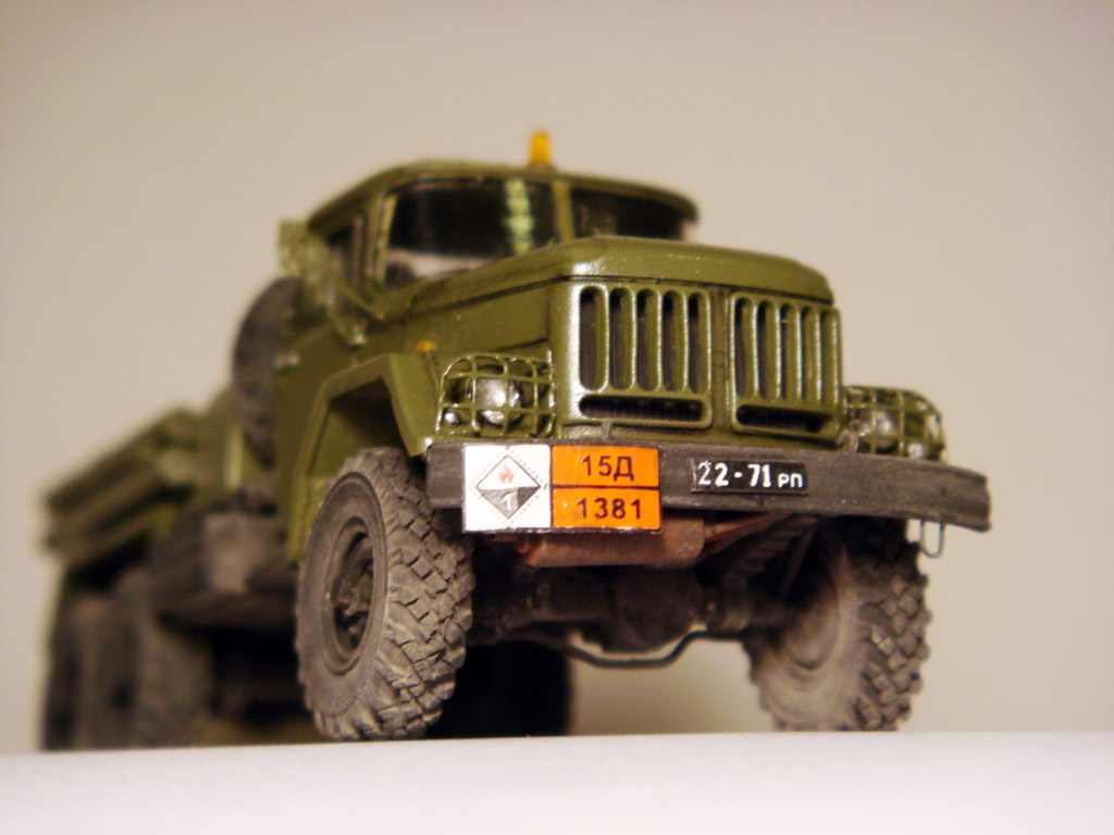 Продолжим тему уралов. На этот раз топливозаправщик атз 5,5 на шасси урал 4320. Сделал тормозные магистрали,ресиверы,проводку к бакам,переделал дзк и дополнительный бак, на кабине переделал выштамповку сзади,нарезал протектор на колесах,сделал всевозможные подножки и поручни. На бочке сделал открывающимися задний и боковой отсеки,(может когда-нибудь соберусь и сделаю маленькую виньетку),сделал наполнение отсеков.Переделал площадку перед горловиной,заменил поручни на проволку.Окраска эмалями revell,смывка - масло,пыль - пастель и пигменты миг.