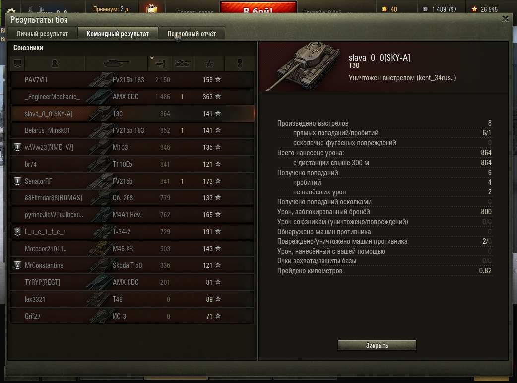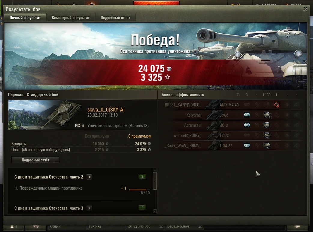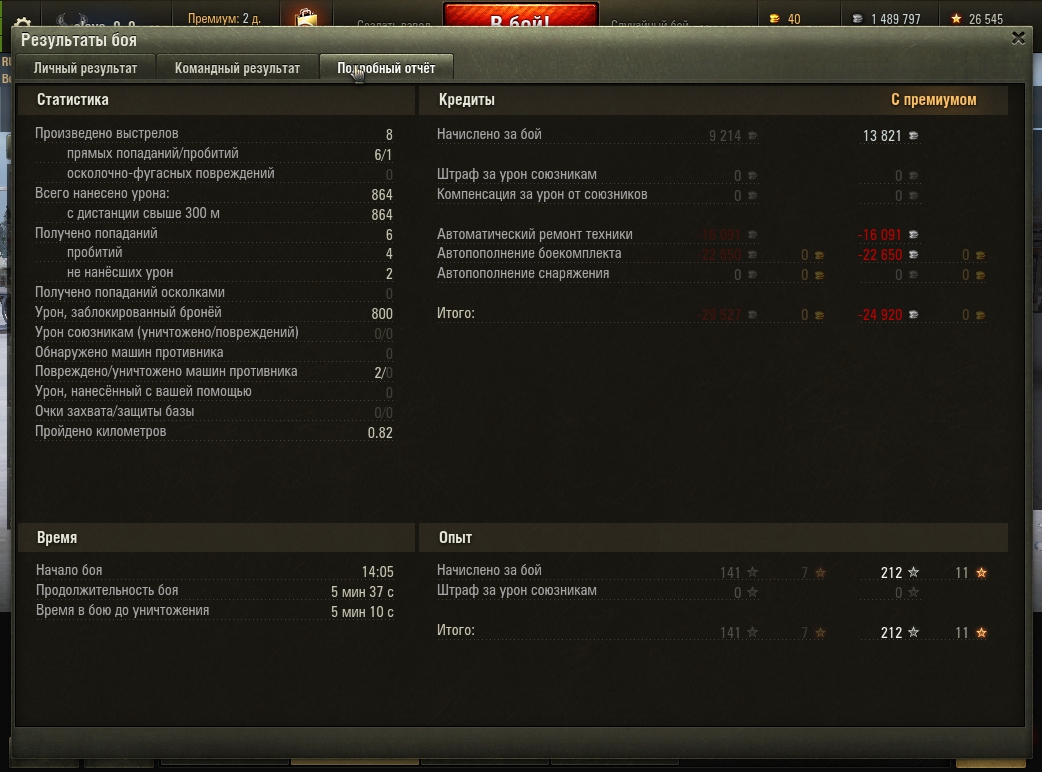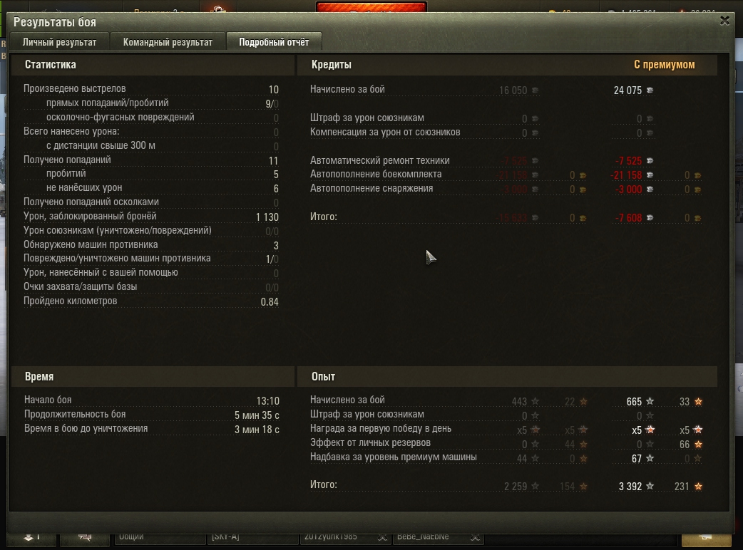 Тут я настрелял 7 фрагов, медаль воина и ещё кучу других медалей. Накидал 3430 урона, заблокировал бронёй 890 урона и нафармил 53 600 серебряных монет с прем аккаунтом. По опыту я получил 2170 единиц. Спасибо союзной яге, грамотно сыграла