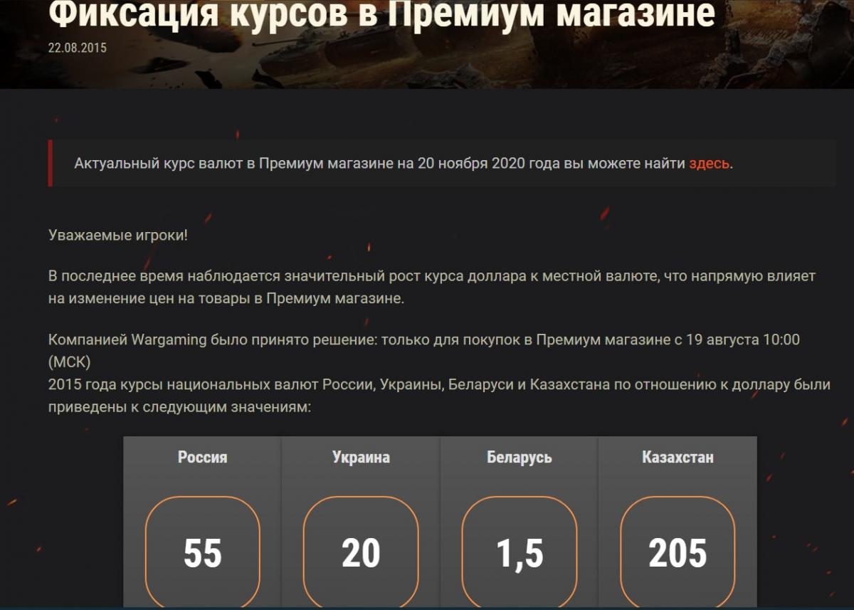 Всем доброго времени суток! WG в августе 2015 было принято решение о фиксации курса $ для национальных валют, скрин и ссылка на новость ниже: https://worldoftanks.ru/ru/news/common/prem_shop_currency/https://worldoftanks.ru/ru/news/common/prem_shop_currency/ Вопрос, будет ли пересмотрено данное решение в связи с последними изменениями курса?