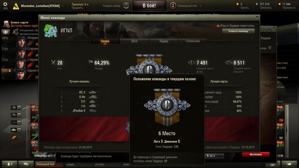 Ищем надежных боевых товарищей для сражениях за укрепрайоны и боях в ладдере! Играем в основном с 17:00 - 00:00 по мск на RU4 и RU8. http://ru.wargaming.net/clans/47028/ - Наш клан! Для связи используем RaidCall - id 3840318. Есть вопросы, заходите)