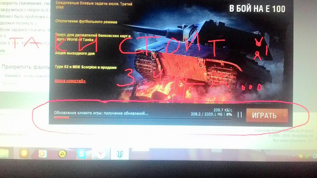 Дорогие танкисты, помогите, пожалуйста!!!Крч проблема в следующем:Поставил я значит скачивать ВоТ, вроде бы всё идёт как нужно, но через 2 минуты нижняя строка (на которой показываются скорость скачивания, сколько скачалось и всего мегабайт) зависла, но обновилась через 3 часа, по идеи игра должна была загрузиться ( скорость 0.250 мб\сек )Может быть проблема с лаунчером??? Комп вроде железо имеет ( хотя и иногда виснет, хотя это и не комп, а ноут , но ВоТ должен потянуть )Всем заранее спасибо, буду ждать ОТ ВАС помощи, сам ничего поделать не могуP.S.Win 8 32x, 4gb ddr3 geforce 810m intel pentium 3556... ( дальше проц стёрт на наклейке, смотреть-лень, но по идеи должен тянуть на средних )