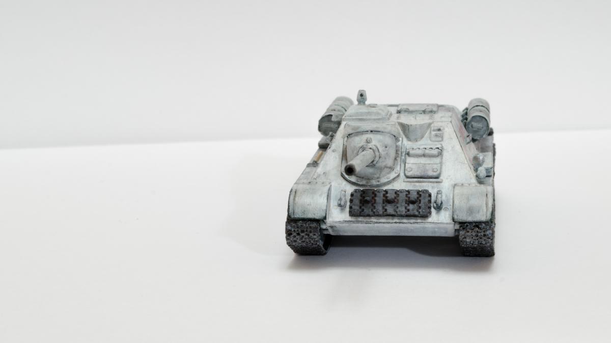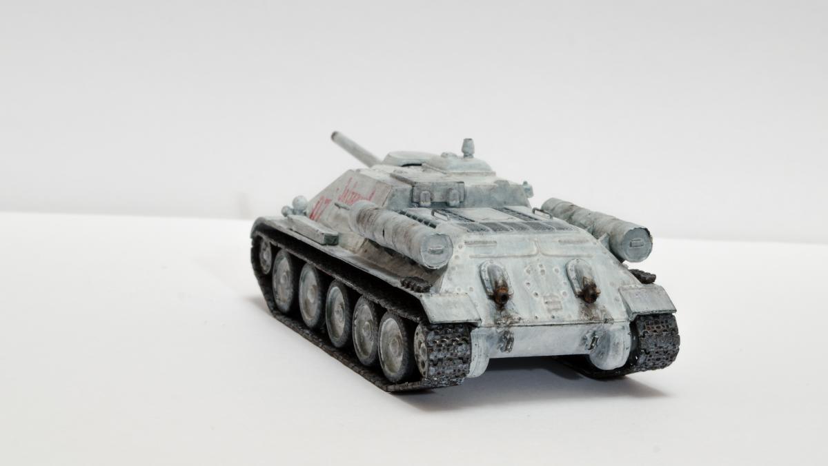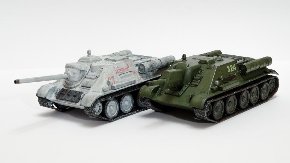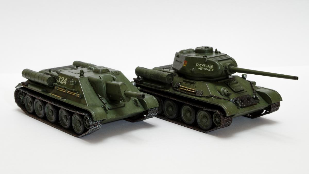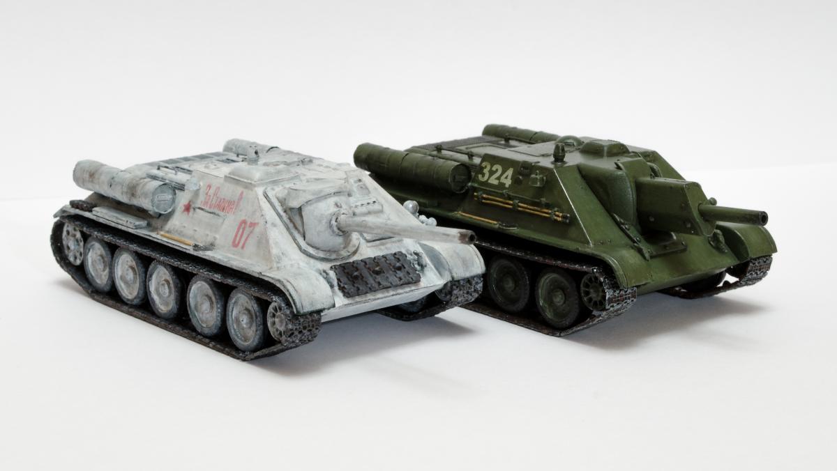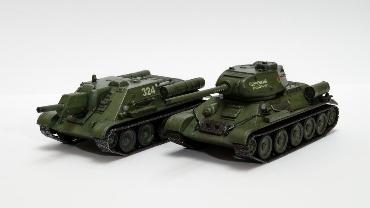 Представляю свою вторую и третью модели СУ-122 и Т-34-85 от Моделиста. Для начинающих моделистов, таких как я, не рекомендую. Звезда собирается гораздо приятнее и легче. Однако при помощи экстракта валерианы и известной матери собрать можно. Сборка из коробки и подручных материалов. Окраска кистью красками звезда. В качестве грунта нанес эмаль "звезда супер" - результат понравился. Акрил поверх ложится просто замечательно, адгезия также весьма хороша. Единственная оговорка, после нанесения "грунта" лучше не сильно затягивать с покраской в базу. Т-34 красил спустя недели 3, поверхность стала гидрофобной, краска ложилась заметно хуже. Описание техпроцесса для начинающих коллег по цеху. Матерым моделистам это уже не ново.Категорически не понравились баки предложенные изготовителем. Дорабатывал следующим образом: обклеил тонкой фольгой для имитации отбортовки и в торцах добавил ручки из литника. СУ-122 - от поручней оставлены элементы крепления, в которых проделаны отверстия сверлом 0,3мм и вставлена проволока. Смотрится гораздо лучше пластика. Что касается самих литников - качество оставляет желать лучшего. Особенно "порадовали" траки, смещение пресс-форм более чем на миллиметр. Пришлось индивидуально прорезать каждый трак. Удовольствие еще то. При натяжении гусениц ждал еще один сюрприз, при сборке не хватает 1,5 трака на сторону. Пересобирал три раза, все три раза результат одинаковый. Благо среди неиспользуемых для сборки деталей была деталь "траки монтируемые на ВЛД". Пришлось эту детальку попилить и спрятать под надгусеничную полку. Ушло на доработку пол детали, вторая половина осталась ждать сборки Т-34-85. Т-34-85 - поручни заменены на проволочные, так же из проволоки свиты тросы. Пулеметы изготовлены из игл инсулиновых шприцов. Триплексы по советам опытных товарищей изготовлены из флоппи-диска. Что касается сборки, то сложности были только со стыковкой верхней и нижней деталей корпуса. По умолчанию они отказались стыковаться, пришлось подрезать детали и штатлевать щели между НДЛ и ВЛД. А вот сборка гусянки удивила и порадовала - гусеницы сошлись и ничего дорабатывать не пришлось. Надо отметить что качество литника с гусянкой было заметно выше чем в наборе с СУ-122. Сейчас собрал СУ-85 от Моделиста, при том что качество литников сравнимо с Т-34-85 гуси не сошлись, как и в случае с СУ-122. Но что делать в этом случае я уже знал :) То что получилось смотрите ниже. Технику не пачкал. Вариант в стиле недавно из цеха и суровые отцы-командиры не дающие расслабиться экипажу.