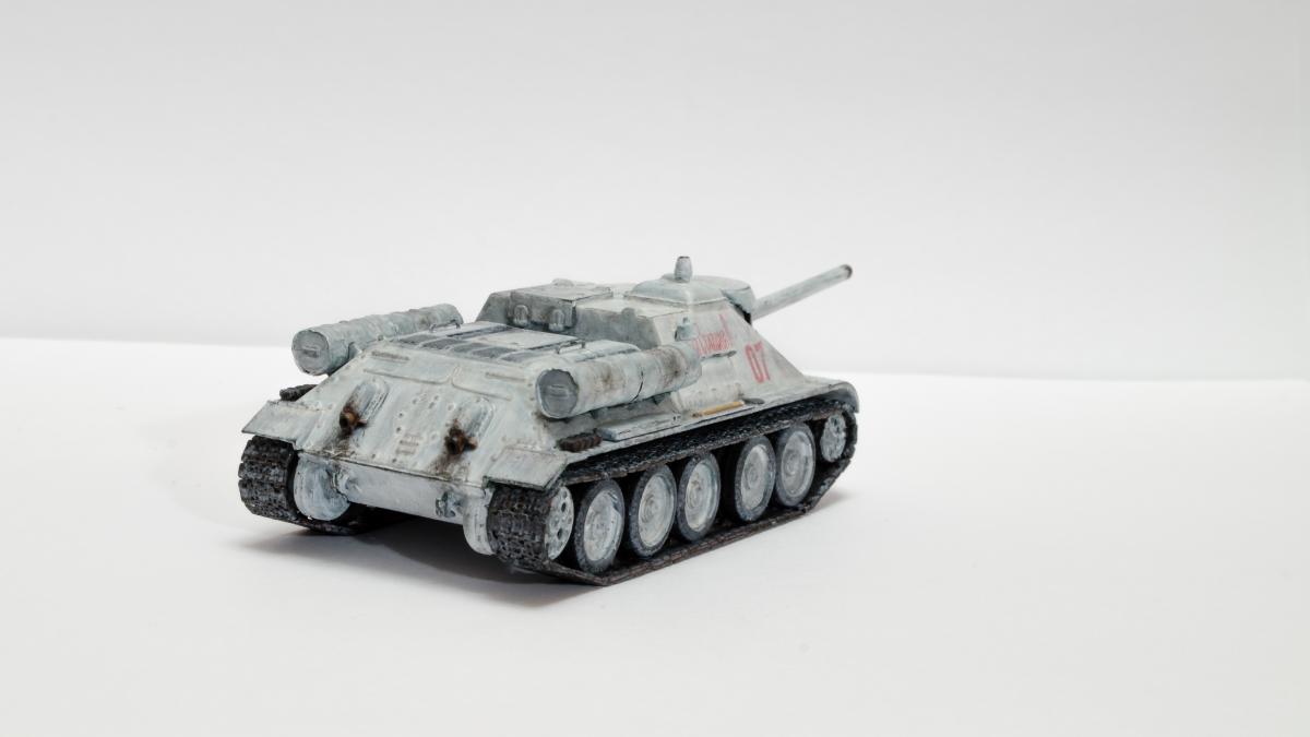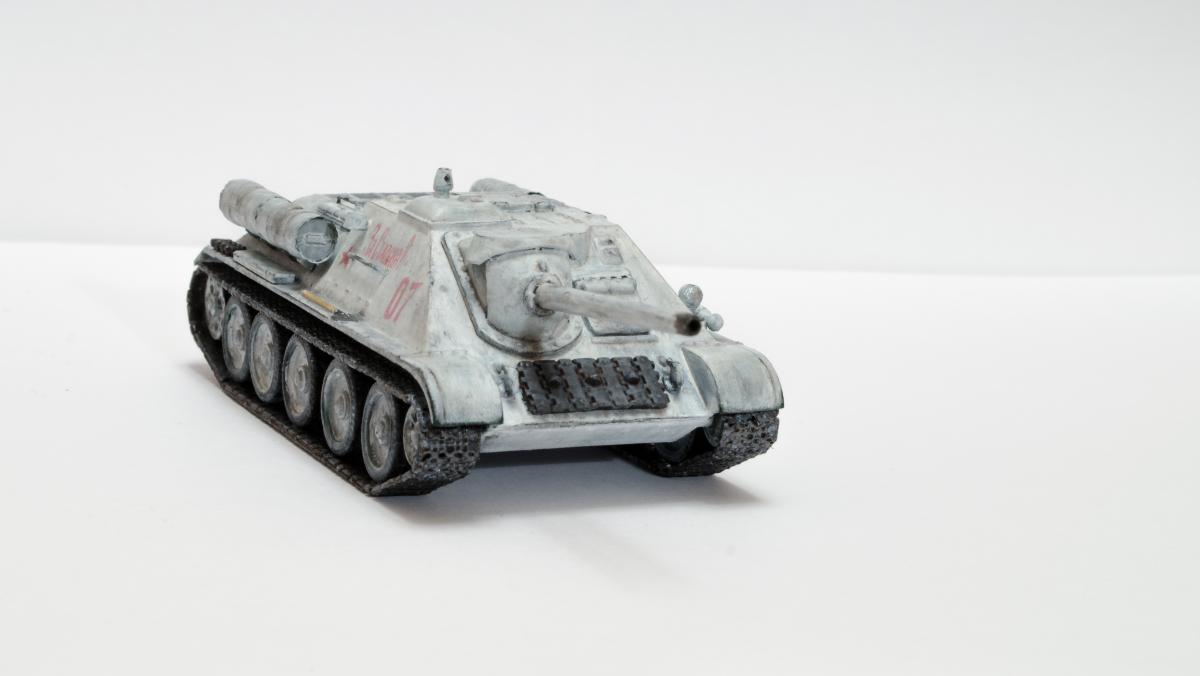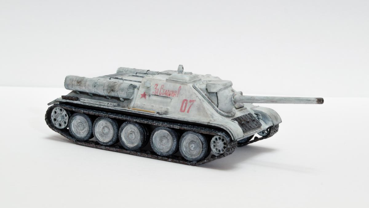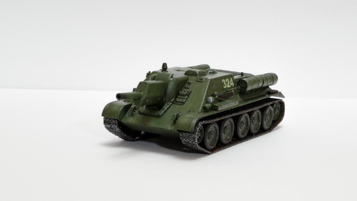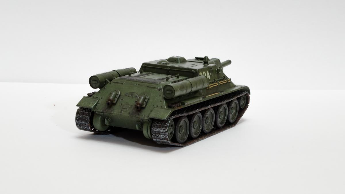 Представляю свою вторую и третью модели СУ-122 и Т-34-85 от Моделиста. Для начинающих моделистов, таких как я, не рекомендую. Звезда собирается гораздо приятнее и легче. Однако при помощи экстракта валерианы и известной матери собрать можно. Сборка из коробки и подручных материалов. Окраска кистью красками звезда. В качестве грунта нанес эмаль "звезда супер" - результат понравился. Акрил поверх ложится просто замечательно, адгезия также весьма хороша. Единственная оговорка, после нанесения "грунта" лучше не сильно затягивать с покраской в базу. Т-34 красил спустя недели 3, поверхность стала гидрофобной, краска ложилась заметно хуже. Описание техпроцесса для начинающих коллег по цеху. Матерым моделистам это уже не ново.Категорически не понравились баки предложенные изготовителем. Дорабатывал следующим образом: обклеил тонкой фольгой для имитации отбортовки и в торцах добавил ручки из литника. СУ-122 - от поручней оставлены элементы крепления, в которых проделаны отверстия сверлом 0,3мм и вставлена проволока. Смотрится гораздо лучше пластика. Что касается самих литников - качество оставляет желать лучшего. Особенно "порадовали" траки, смещение пресс-форм более чем на миллиметр. Пришлось индивидуально прорезать каждый трак. Удовольствие еще то. При натяжении гусениц ждал еще один сюрприз, при сборке не хватает 1,5 трака на сторону. Пересобирал три раза, все три раза результат одинаковый. Благо среди неиспользуемых для сборки деталей была деталь "траки монтируемые на ВЛД". Пришлось эту детальку попилить и спрятать под надгусеничную полку. Ушло на доработку пол детали, вторая половина осталась ждать сборки Т-34-85. Т-34-85 - поручни заменены на проволочные, так же из проволоки свиты тросы. Пулеметы изготовлены из игл инсулиновых шприцов. Триплексы по советам опытных товарищей изготовлены из флоппи-диска. Что касается сборки, то сложности были только со стыковкой верхней и нижней деталей корпуса. По умолчанию они отказались стыковаться, пришлось подрезать детали и штатлевать щели между НДЛ и ВЛД. А вот сборка гусянки удивила и порадовала - гусеницы сошлись и ничего дорабатывать не пришлось. Надо отметить что качество литника с гусянкой было заметно выше чем в наборе с СУ-122. Сейчас собрал СУ-85 от Моделиста, при том что качество литников сравнимо с Т-34-85 гуси не сошлись, как и в случае с СУ-122. Но что делать в этом случае я уже знал :) То что получилось смотрите ниже. Технику не пачкал. Вариант в стиле недавно из цеха и суровые отцы-командиры не дающие расслабиться экипажу.