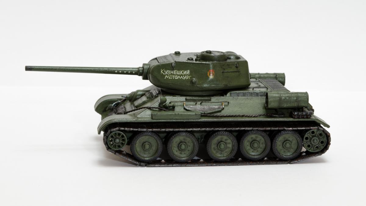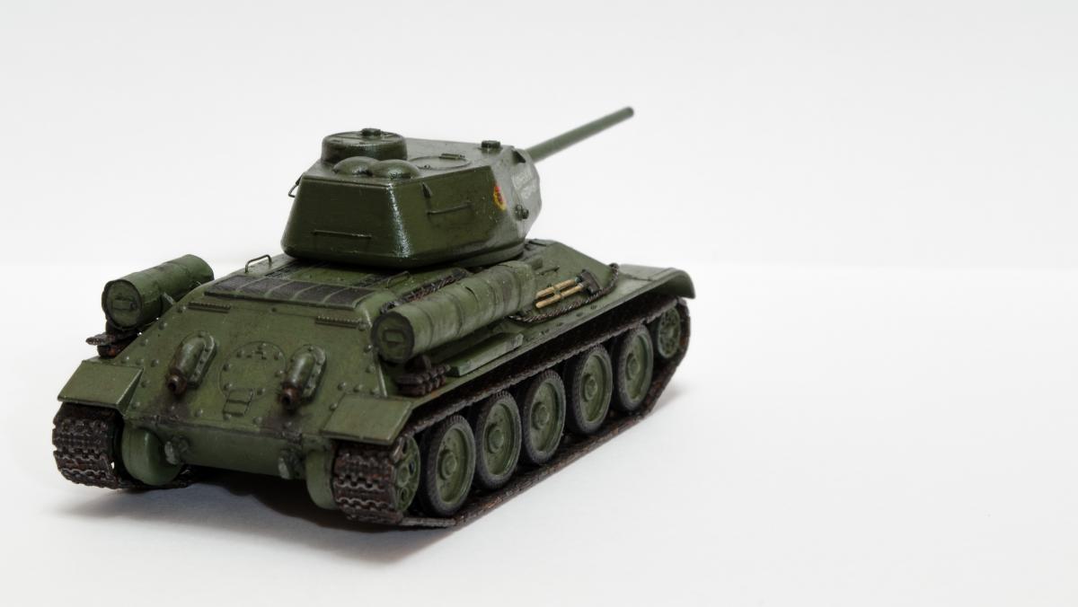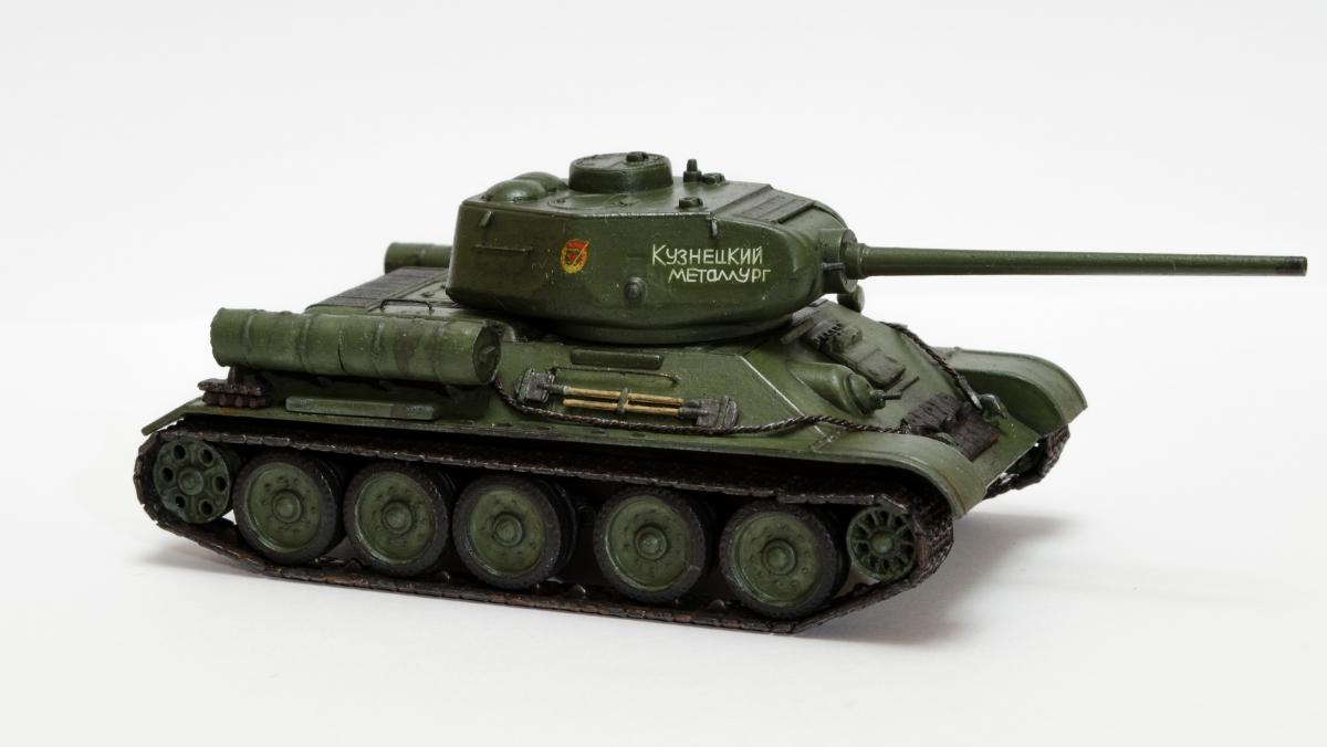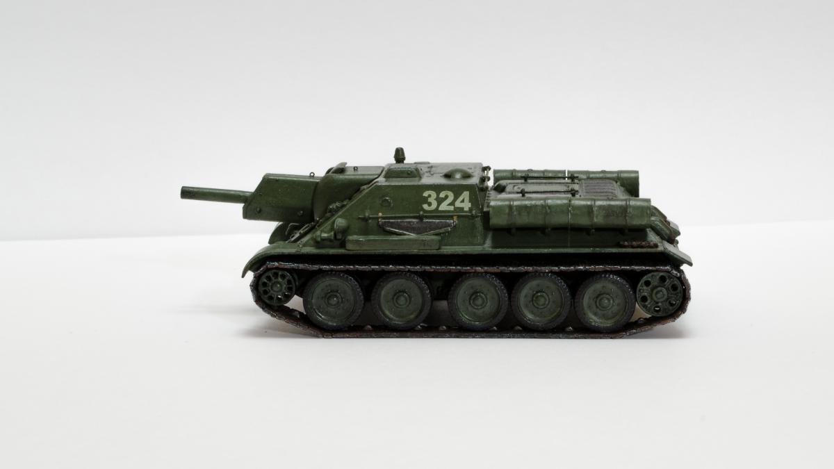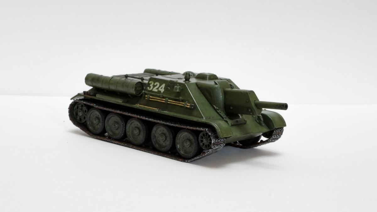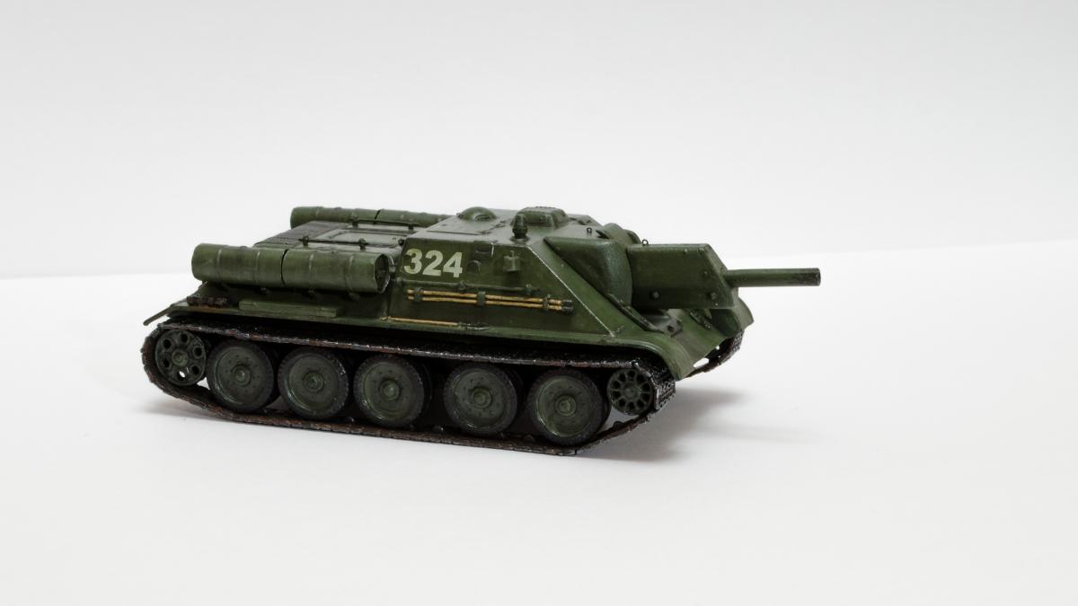 Представляю свою вторую и третью модели СУ-122 и Т-34-85 от Моделиста. Для начинающих моделистов, таких как я, не рекомендую. Звезда собирается гораздо приятнее и легче. Однако при помощи экстракта валерианы и известной матери собрать можно. Сборка из коробки и подручных материалов. Окраска кистью красками звезда. В качестве грунта нанес эмаль "звезда супер" - результат понравился. Акрил поверх ложится просто замечательно, адгезия также весьма хороша. Единственная оговорка, после нанесения "грунта" лучше не сильно затягивать с покраской в базу. Т-34 красил спустя недели 3, поверхность стала гидрофобной, краска ложилась заметно хуже. Описание техпроцесса для начинающих коллег по цеху. Матерым моделистам это уже не ново.Категорически не понравились баки предложенные изготовителем. Дорабатывал следующим образом: обклеил тонкой фольгой для имитации отбортовки и в торцах добавил ручки из литника. СУ-122 - от поручней оставлены элементы крепления, в которых проделаны отверстия сверлом 0,3мм и вставлена проволока. Смотрится гораздо лучше пластика. Что касается самих литников - качество оставляет желать лучшего. Особенно "порадовали" траки, смещение пресс-форм более чем на миллиметр. Пришлось индивидуально прорезать каждый трак. Удовольствие еще то. При натяжении гусениц ждал еще один сюрприз, при сборке не хватает 1,5 трака на сторону. Пересобирал три раза, все три раза результат одинаковый. Благо среди неиспользуемых для сборки деталей была деталь "траки монтируемые на ВЛД". Пришлось эту детальку попилить и спрятать под надгусеничную полку. Ушло на доработку пол детали, вторая половина осталась ждать сборки Т-34-85. Т-34-85 - поручни заменены на проволочные, так же из проволоки свиты тросы. Пулеметы изготовлены из игл инсулиновых шприцов. Триплексы по советам опытных товарищей изготовлены из флоппи-диска. Что касается сборки, то сложности были только со стыковкой верхней и нижней деталей корпуса. По умолчанию они отказались стыковаться, пришлось подрезать детали и штатлевать щели между НДЛ и ВЛД. А вот сборка гусянки удивила и порадовала - гусеницы сошлись и ничего дорабатывать не пришлось. Надо отметить что качество литника с гусянкой было заметно выше чем в наборе с СУ-122. Сейчас собрал СУ-85 от Моделиста, при том что качество литников сравнимо с Т-34-85 гуси не сошлись, как и в случае с СУ-122. Но что делать в этом случае я уже знал :) То что получилось смотрите ниже. Технику не пачкал. Вариант в стиле недавно из цеха и суровые отцы-командиры не дающие расслабиться экипажу.