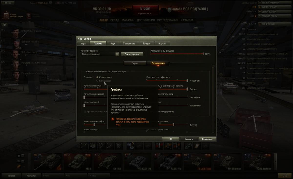 Доброго времени суток уважаемые форумчани! У меня к вам и к разработчикам вопрос, что касается качества ландшафта при стандартной и улучшенной графике. Как написано в описании самой настройки "При низких показателях возможны несоответствия текстур клиента и сервера". Так вот, почему же те кто играет на стандартных должны страдать (когда в снайперском видно что снаряд пролетит, а на сервере ты стреляешь в карту) из-за невозможности выставить хотя бы среднее, для устранения данной проблемы? На улучшенной играть нету возможности, лагает сам ангар (кто знает почему), игра до 35 фпс (из-за ангара частенько кикает с сервера). Может в дальнейших патчах вы пересмотрите и добавите для "Стандарной" качество ландшафта такое, что бы не было несоответствия клиент/сервер, и не было таких вот "казусов" и "форс мажоров". Буду благодарен за пояснительный ответ почему нет, или когда будет рассмотрено. P.S. Доброго ФПСа и нагиба танкисты