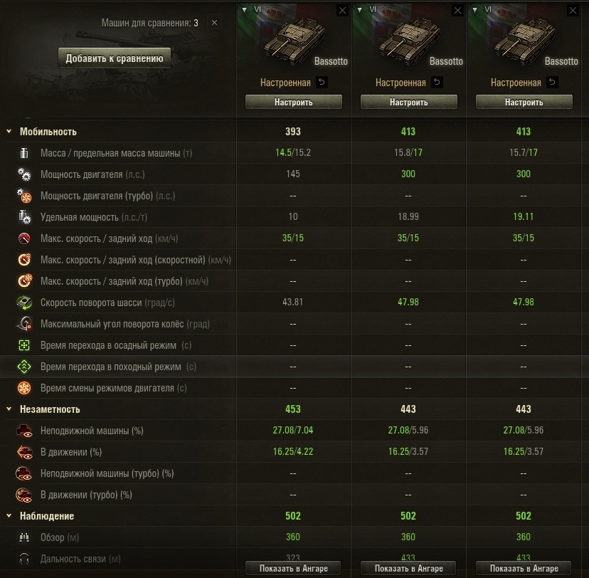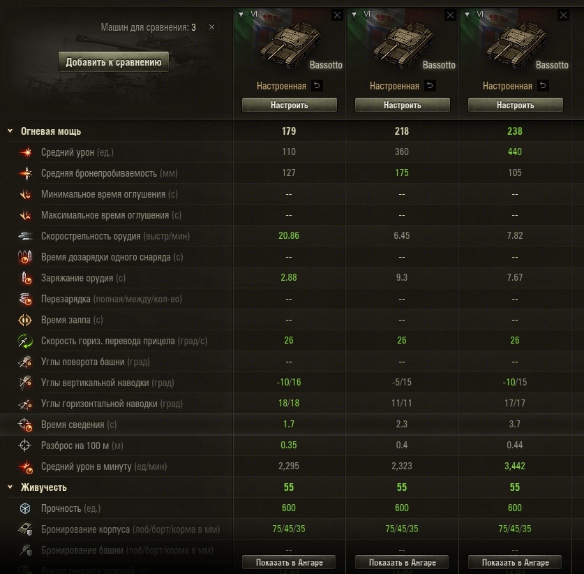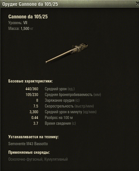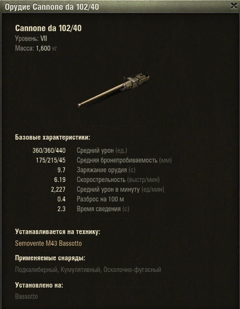 Semovente M43 Bassotto Это, пожалуй, самая интересная линейная ПТ-САУ, которая появилось на 6 лвл за последние годы. Универсальной ее не назовешь. Наоборот, ее достоинства столь же велики, как и недостатки. Историческая справка: Итальянская ПТ-САУ Semovente M43 Bassotto имеет исторический прототип - Semovente da 105/25 su scafo Fiat-Ansaldo M43. За приземистый силуэт танк получил прозвище Bassotto («Такса». Первые 30 ПТ фирма Ansaldo выпустила весной-летом 1943 года. Они оказались настолько удачными, что военный заказ был увеличен до 454 экземпляров, но из-за капитуляции Италии его отменили. Использовали эти ПТ и немцы. Тут, правда, сложно сказать почему. Может, танк реально был хорош, а может, германцам в конце 1943 года было уже не до жиру. В любом случае, ПТ была участницей боев Второй мировой. ТТХ В 2022 году выкатывать в бой стоковый танк – это моветон, поэтому за свободный опыт выкачиваем все необходимые модули. Если такой возможности нет, то вначале прокачиваем ходовую, затем орудия, поскольку именно они - соль танка. Установив предтоп, прокачиваем двигатель, потом рацию и, если есть желание, - топовое орудие. Топовая ходовая обладает отличной скоростью поворота – 46 градусов в секунду. На практике ее крутят и ЛТ, и тот же «Кромвель», надо усиливать перком «виртуоз». Даже без перков на ремонт ходовая чинится быстрее чем за 7 сек. – отличный показатель, но мало что дает на практике из малого количества ХП. Базовый обзор – 360 м. Для кустовой ПТ этого мало, надо усиливать. У «Таксы» три орудия 7 лвл. На мой взгляд, оптимальное из них Cannone da 102/40. У него лучшие бронепробитие на базовых снарядах (175 мм) и точность (0,4 м) при высоком ДПМ (2227). 90-миллиметровое орудие просто для галочки, ибо хуже во всем. Историческая фугасница с жутким для 6 лвл ДПМ (базовый на фугасах – 3300!), хорошим пробитием как фугаса (105 мм), так и кумулятива (230 мм), очень хорошим склонением (-10), но чрезвычайно некомфортна из-за долгого сведения (3,7 с) и низкой скорости полета снаряда (410 м/с для фугаса и 330 – для кумулятива). В боях с 3-5 ЛТ в каждой команде - это тренажер для мазохистов. Но если кто в это орудие сможет, то в позиционных боях на открытых картах, оно сможет выдать рекордный дамаг. Сравнение танка в стоке и в топе (с предтоповым и топовым орудиями): Преимущества и недостатки Плюсы:- Отличная альфа (не рекордная, но одна из лучших на уровне) - Отличная незаметность (27.08% - для неподвижной машины без «усилителей»;- Прекрасный ДПМ; - Отличное время сведения; - Небольшой размер; - Хорошее бронепробитие; - Хорошая удельная мощность Минусы:- Плохая стабилизация; - Небольшая скорость движения вперед; - Ужасные УВН предтопового орудия(-5 градусов); - Мало единиц прочности - Повышенная критуемость двигателя. - Низкая точность всех орудий. Экипаж У ПТ всего 3 члена экипажа, поэтому не жадничаем и сразу сажаем на нее персонажей из «Боевого пропуска» с 3 перками. Это минимум. Желательны 6 перков. Приоритетные перки: Командир (наводчик) – артолампа (чтобы не ловить блайнды от САУ), маскировка, ББ, плавный поворот башни, орлиный глаз, ремонт. Мехвод – маскировка, ББ, король бездорожья, виртуоз, плавный ход, ремонт. Заряжающий (радист) – маскировка, ББ, радиоперехват, бесконтактная боеукладка, ремонт, отчаянный. 1 2 3 4 5 Командир (наводчик) Артолампа Маскировка ББ Плавный поворот башни Орлиный глаз Механик-водитель Маскировка Король бездорожья ББ Виртуоз Плавный ход Заря