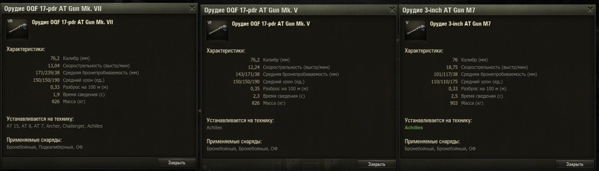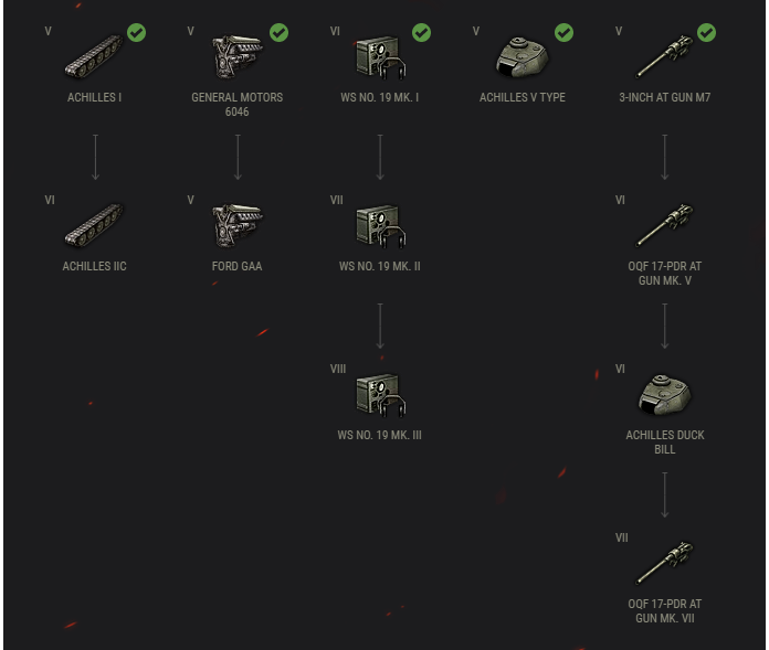 ОБЗОР БРИТАНСКОЙ ПТ-САУ VI УРОВНЯ "Achilles" Если вы читаете эту тему, то вы заинтересовались второй веткой британских ПТ-САУ и либо планируете её прокачивать, либо уже в процессе её прокачки. Этот гайд поможет вам пройти эту машину максимально эффективно и приятно. И кто знает, может она вам так понравится, что даже останется в ангаре? Итак, начали:1. История В википедию информация о машине крайне мало, но в целом оно хорошо описывает концепцию Ахиллеса: В целом это М10 с 17-ти фунтовым орудием на 6-м левеле. Описывать исторические ТТХ нет смысла, поэтому сразу перейду к разделу 2.2. Игровые тактико-технические характеристики Сразу скажу, что у этой ПТ есть два противоположных состояния, которые ОЧЕНЬ сильно отличаются - Стоковое и Топовое. И страдание в первом состоянии может вам испортить впечатление от машины навсегда. Поэтому подходите к вопросам прокачки техники с умом. Печальное зрелище, брони нет, орудие слабое, подвижность низкая. Но всё меняется стоит нам вывести машину в топ: Конечно брони и количества ХП нам не добавилось (привыкайте, вся ветка такая), но зато появилась замечательная пушка и хорошая подвижность. Немного пострадали отрицательные УВН, но при правильном применении это незаметно. При апе ветки ПТ-САУ эту ПТ единственную обошли в апом отрицательных УВН, да и вообще с апом. Теперь кратко рассмотрим дерево исследований и перейдём к самому животрепещущему вопросу - порядке прокачки. Дерево исследований: 3. Прокачка машины в топовое состояние Общая стоимость вывода Achilles’ав топ - 39 400 опыта. До ребаланса древ прокачки, когда вы играли на Archer’е сначала, то мы автоматически получали открытую топовую пушку и рацию, а это целых 22 600 опыта - львиная доля всей прокачки. Сейчас с АТ-2 переезжает только рация. Но если вы прокачивали ветку АТ до этого, то пушка тоже будет открыта. Можете поиграть на Archer’е чтобы получить топовую пушку, можете пострадать на этом танке, если не хотите покупать Archer. Сразу хочу заметить, что я не ездил на стоковой машине. За свободный опыт я открыл топовый двигатель , предтоп пушку и топовую башню, всего 11 700 свободного опыта. И только ходовую я открывал на боевой опыт. Двигатели: Со стоковой пушкой полноценно воевать, как ПТ6, будет сложно. Будет сильно не хватать пробития, но ДПМ на дыроколе чуть лучше, чем даже у топового орудия. В среднем на открытие предтопового орудия вам понадобиться 3-5 боёв х2, либо около 10 обычных боёв/сливов. На предоповом орудии, аналогичном предтоповому орудию Archer’a (кстати не понимаю, почему она разные (sic!)) играть будет веселее и за те же 3-4 боёв х2 или 6-8 обычных боёв мы наконец-то откроем башню и сразу сможем установить венец танковой мощи Англии начала войны - 17-ти фунтовку с отличными ТТХ. Затем уже неторопясь, можно открывать ходовую и рации (если вы их не открыли на Archer’e). 4. Дополнительные модули и перки экипажа В зависимости от способа прокачки и наличных средств экипаж танка может очень сильно отличаться. В голосании в шапка можете уточнить народный выбор дополнительного оборудования, но лично мои рекомендации выглядят так: 1. Досылатель, Стереотруба, Маскировочная сеть - максимально кустовая ПТ-сау. 2. УМП, досылатель, улучшенный прицел - билд для городской карты на максимальный комфорт стрельбы. 3. УМП, Малошум, Оптика - компромиссный вариант, для подвижной полу-засадной игры. 4. УМП, До