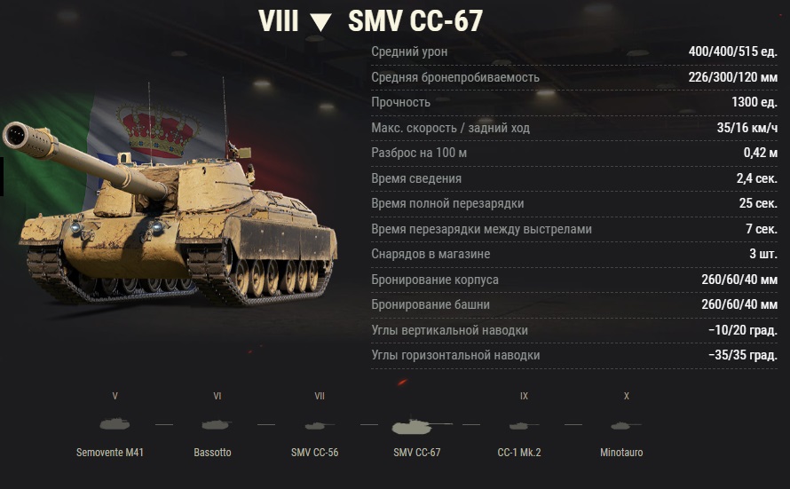 SMV CC-67 Итальянская ПТ-САУ 8 уровня SMV CC-67 воплотила в себе все лучшие качества итальянских истребителей танков. Эта ПТ-САУ также оснащена вращающейся башней, сектор обстрела которой составляет 70 градусов (по 35 градусов в каждую сторону). У SMV CC-67 лобовая броня корпуса и башни ещё прочнее, а подвижность — выше, чем у предшественницы. Также больше максимальная скорость, скорость заднего хода, мощность двигателя, удельная мощность и даже скорость поворота. Хотя SMV CC-67 способна менять фланги, это займёт некоторое время, поэтому осознанно выбирайте подходящее направление в бою. 120-мм орудие с магазинной системой заряжания и углом склонения в -10 градусов позволяет играть «от башни», комфортно вести огонь и отходить в укрытие на несколько секунд, чтобы у противника не было возможности точно прицелиться по уязвимым зонам вашей машины. ТТХ техники Важно: Тема является стартовой. Любой пользователь может подготовить гайд и получить в качестве награды статус на форуме и золото, информация для игроков по созанию гайдов, находится тут. Если гайд будет хорошо написан, то его выберут основной темой по танку, а данная тема будет закрыта.