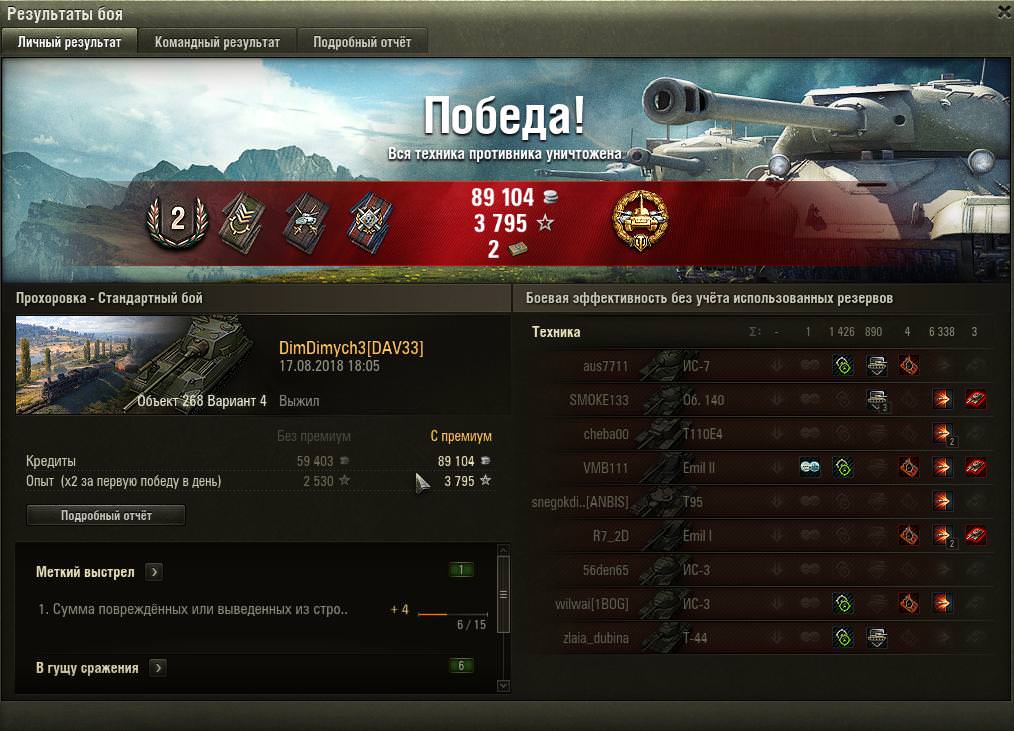 Уважаемые разработчики, объясните пожалуйста, почему мне не засчитали ЛБЗ ПТ-2 "Операция Об.260"? "Прицельная стрельба" Нанести не менее 5000 урона и вывести из строя 3 внутренних модуля или члена экипажа машины противника. Не иметь к моменту окончания боя повреждённых или выведенных из строя внутренних модулей или раненых членов экипажа. Хотелось узнать, что я сделал не так http://cdn-frm-eu.wargaming.net/4.3/style_emoticons/wot/Smile_Default.gif