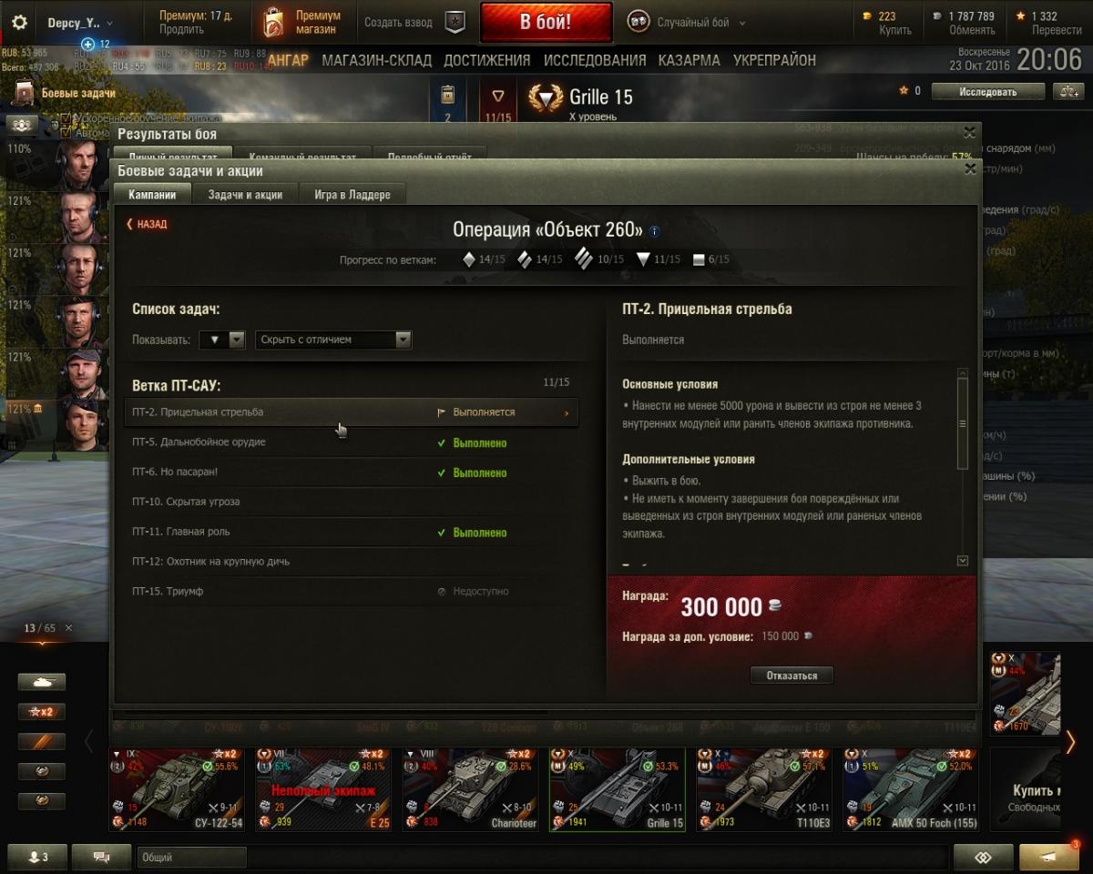 Доброго времени суток! Пытался выполнить ПТ-2 на яге е100. Нанёс 5200 урона и повредил командира,топливный бак и и двигатель. Почему не засчитало? http://wotreplays.ru...agdpanzer_e_100 P.S. я оставлял это сообщение в цепочках задач на пт для 260, и увидел ,что не у одного меня такая проблема. Как сделать так,что бы мне её засчитали без перепрохождения?