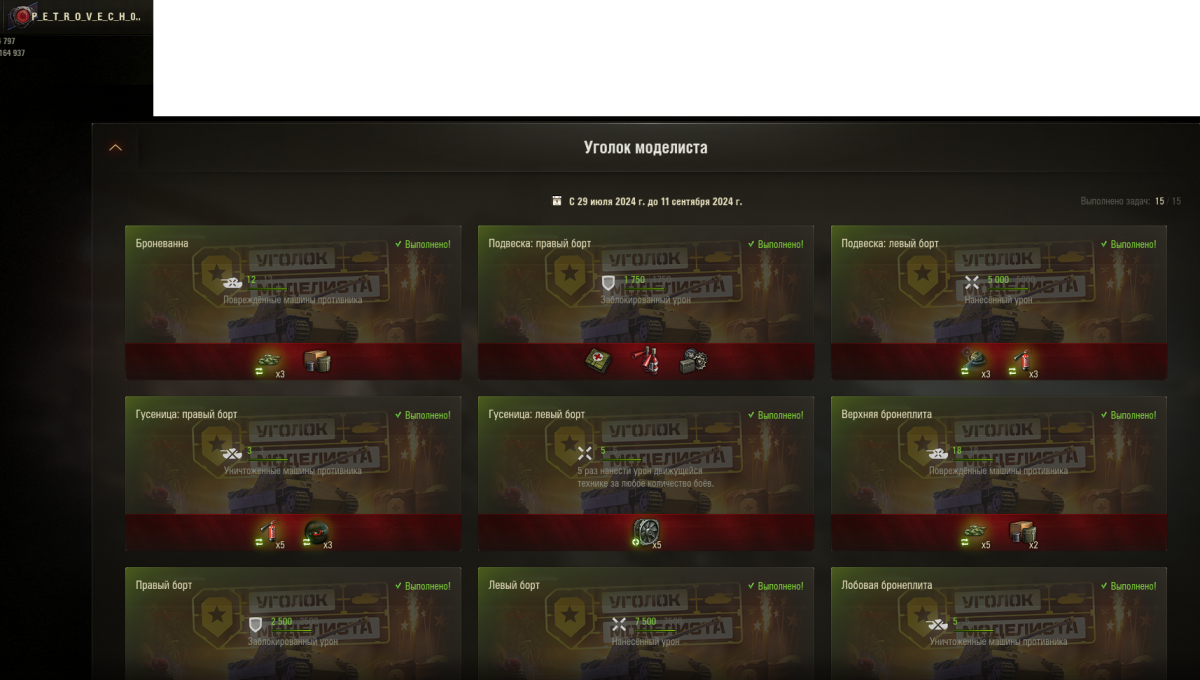 Итак наши разработчики выкатили на ДР не только фан режим, но и мини ивент где главной наградой является советская пантера (теперь ждём ивент на советский тигр - такой был) Смотрим внимательно, у нас есть: https://forum-mt-prod.lesta.ru/monthly_08_2024/post-47821122-0-91223200-1723320929_thumb.png Сделано!!! https://forum-mt-prod.lesta.ru/monthly_08_2024/post-47821122-0-94793300-1723320948_thumb.png Ура ура ура!!! идём в ангар радоваться нашей награде, ставим фильтры чтобы было легче найти иииии... https://forum-mt-prod.lesta.ru/monthly_08_2024/post-47821122-0-01992100-1723321095_thumb.png Либо я слепой или не понимаю как танк начисляется, либо опять что-то сломалось и награда просто не выдаётся. Как так то товарищи разработчики? https://forum-mt-prod.lesta.ru/monthly_08_2024/post-47821122-0-35446100-1723321261_thumb.png