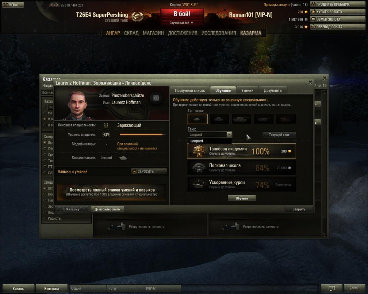 Пересмотрел весь форум, но такой темы почему-то не нашёл. Зато нашёл тему- введите возможность переобучать танкистов на другие специальности. Связи с этим я решил написать небольшой гайд по использованию экипажа. Тема созданна для того, чтоб решить вопрос- как не плодить в казарме людей с несколькими перками сидящими без дела. За отправную точкую я возьму игрока, который только что зарегистрировался в игре и поставил перед собой задачу- прокачать все танки что в ней есть( по состоянию на патч 0.8.4) до упора, те до 5-8-10 уровней. В этом случае вам потребуется сразу купить некоторое кол-во слотов. Чтоб вся ТОп техника уместилась в ангаре- нужно минимум чтоб было 29 слотов, без учёта прем техники о которой я раскажу позже. В расчёт я брал только возможных танкистов с навыками от 1% первого навыка. Итак самая первая и самая простая ветка это немцы- ибо во всей ветке нет такого танка, в котором при переходе на след. уровень какой либо член экипажа оставался без работы. Небольшой нюанс представляет Гивипантера- радиста у неё нет. Но ничего не мешает ему посидеть в казарме месяцок, ожидая открытия гивитигра. На этом всё. Следующая ветка- СССР. И могу её посоветовать качать следующим методом: 1. Начать качать ветку с Т26- дойти до КВ1. И парраллельно прокачать ветку ПТшек до су100. Экипаж с Т28 будет иметь примерно 90% основного навыка. После чего 2 радистов из Т28- дембельнуть, а оставшихся посадить в казарму на сохранение. 2. Для танка Кв1 нанять новый Экипаж за серебро. Изучить на танке Кв1- танки КВ2 и кв1с. После чего экипаж с кв1- пересадить в Кв1-с. Изучить на Кв1-с танки ИС и кв13. После чего купить для танка ИС - новый экипаж за серебро. В танк кв13- вернуть экипаж с т28. Экипаж с танка кв1с- пересадить в кв2 и добавить заряжающего за серебро. Откатать на кв2- примерно 250-300 боёв с фугасницей и кумулятивами, изучить С51 и Т150. После чего экипаж с кв2- пересадить в т150, а для С51- нанять новый экипаж за серебро. Дальше- не особо торопясь качаем параллельно несколько танков- с51,Т150,ис,кв13. На кв13- до Т62А никаких замен экипажа не предвидется. На ИСе до Ис8 включительно тоже. На т150- до СТ1 тоже, но после открытия СТ1, освободится лишний радист который будет востребован на об.212- вывод простой: докачиваем С51 до топового состояния, после чего докачиваем Кв4 до топового состояния. Покупаем об.212 и Ст1, пересаживаем из кв4 в 212 радиста. И у нас остаётся лишний наводчик, которого можно реализовать в ветке ПТсау. Пара слов о переходе о переходе с ИС8 на ИС7 и с СТ1 на ИС4. Поскольку у ис8- заряжающий 1н, а у ИС7 их 2 и наоборот: у СТ1- заряжающего 2, а у ИС4 он один то вывод напрашивается сам собой: докачать обе ветки до топ состояния, а потом просто перерокировать экипажи- из ИС8 посадить в ИС4, а из СТ1 в ИС7. Тот экипаж который был в су100- перейдёт в су152( или в су100м1- по вашему желанию), а лишний наводчик с с-51 перейдёт в су100м1(су152). Остаётся только вопрос- что делать с радистом, когда на об.212 будет открыт об.261? Варианта 2- посадить его в ангар в надежде, что в будущем разработчики внедрят какие нибудь новые советские танки где будет радист, или купить какой нибудь прем танк где вакантна должность радиста, и на котором можно качать экипажи для других танков. В ветке СССР таких танков целых 3: т-127, кв5, черчиль 3. По мне наиболее оптимален- кв5, но их не продают просто так, и нужно ждать акции. Поэтому тут вы поступаете как хотите.