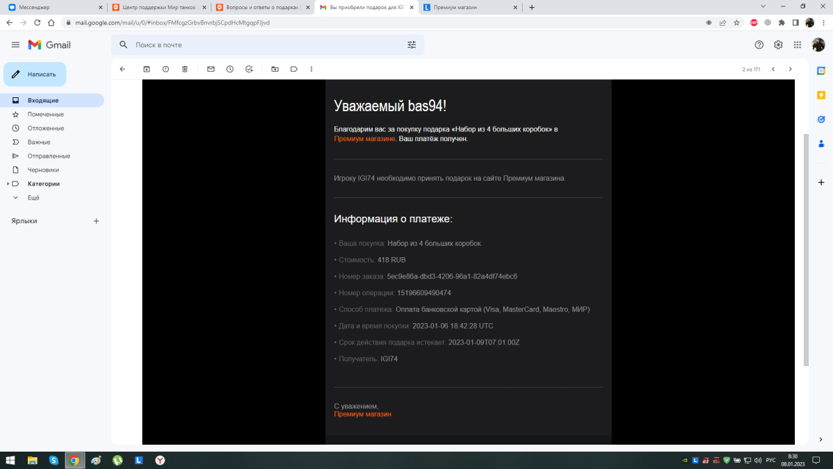 Купил коробки в подарок для друга 6.01.2023 в 18:42:28 UTC, спустя 24часа подарков нет, как и уведомлений. Чек и скан покупки прилагаю.