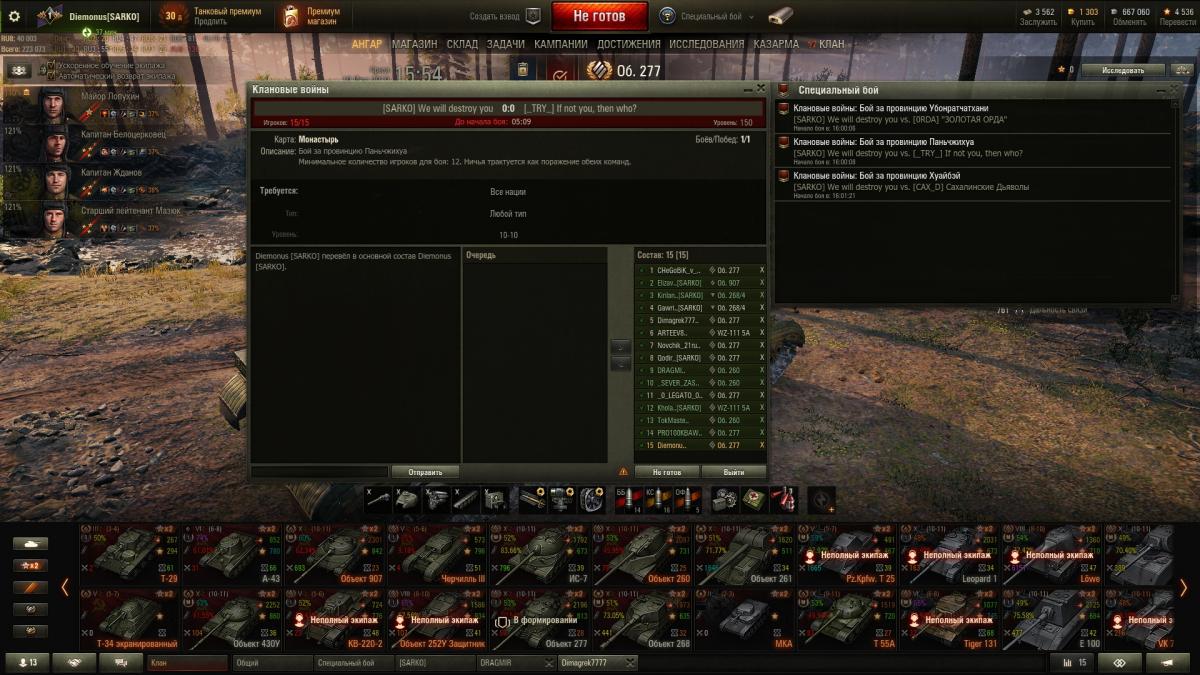 Всем привет! Я любитель и активный участник Турниров разных форматов. На данный момент набираю команды на 6-х и 8 -х уровнях. Желающим играть на 6 лвл не обязательно кататься на 8 лвл и наоборот, никакой привязки - только желание играть и побеждать. От игрока прежеде всего требуется в меру спокойный(не буйный) темперамент . По технике. VI уровень - профильная техника с большим количеством боев - нет боёв на технике нет и скилла на ней.В приоритете мобильность, хорошая маскировка, высокий дпм. По технике VIII уровня. ЛТ WZ-132 и M 41 90 GF(Черный бульдог) СТ Type-59 и об.416/ ТТ ИС-3,Защитник(об.252у), более реже Т-32 ,50-100, главное знание своей техники Бывает что выезжаешь на сборной солянке - и так и не останавливаешься до финала. Всем заинтересовавшимся писать в ЛС. Связь исключительно ТС3 Сразу оговорюсь что некоторые кандидаты будут проходить тренировки или смотры)