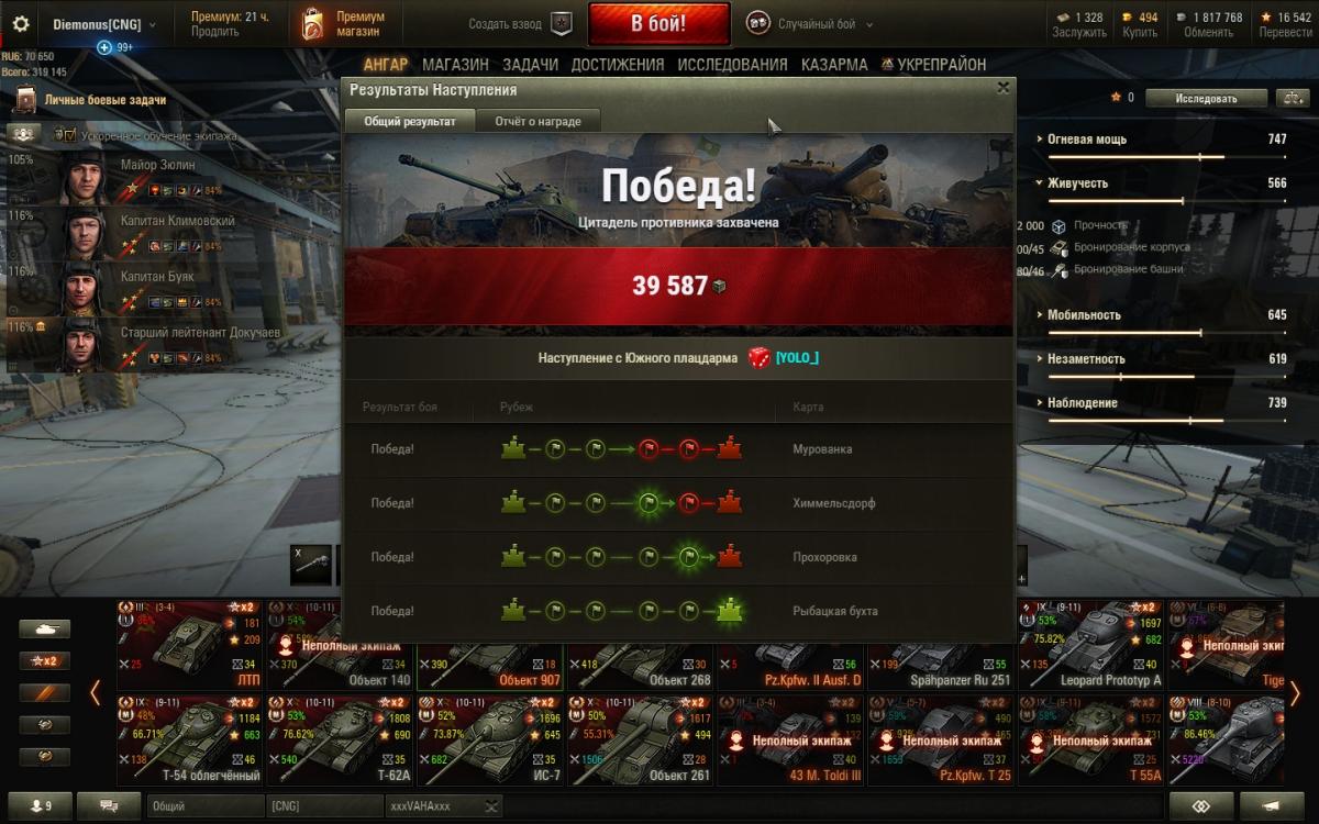 Всем привет !!!! Полевой с огромным опытом игры в командные бои ( более 15000 боев) в средних кланах собирает "боевую роту" с нуля в новом клане "Злые смайлы". Собираю роту так как нравится именно АБС формат, командная игра с кланом где это ни было (ГК , Укрепы) , а не рандом. Почему собираю роту спросите вы?: - Все просто !!! Люди встречаются , женятся ,заводят детей, уходят из игры и в бесплатных ротах постоянно нужна подпитка новыми кадрами. Что я могу предложить вам: Танки за ивенты , голду с военных игр, гарантию что вас не удалят из клана без моего ведома, плюшки включающиеся для бойцов , а не для того чтобы кто-то продавал промресурс и не наполнял свой карман за ваше потраченное время, приятное общение внутри роты, адекватное обоснованное командование без криков и необоснованных оскорблений. Что я хочу видеть от игроков: 1)Онлайн в игре 3-4 вечера(с 20-00 мск) в неделю 2)Зеленую стремящуюся вверх статистику 3) Умение пробивать танки больше чем в 70% случаев 4) Умение слушать и принимать адекватную , обоснованную критику( готов вступать в дискуссию и доказывать игроку хоть сутки что он в той или иной ситуации был не прав , а не переходить на личности и пользуясь положением в клане удалять игроков из клана). Либо признать что я был не прав и извинится перед бойцом ( мне в незападло). 5) Наличие танков для АБС формата 6) Наличие микрофона 7) Желание играть с ротой и развиваться в игре как рота. Ищу игроков которым интересен именно формат Командной игры Что я в итоге хочу увидеть : Дружную роту в составе 22-25+ игроков ( имеенно стольким на ивенте я гарантирую получение танка) умеющую играть и выигрывать кланы с 1350+ЭЛО . Общение в *ротной группе вайбер* . Там мы узнаем расписание боев , будут или не будут сегодня покатушки, а также возвожность сбора в то или иное время.(Очень удобная штука Экономит кучу времени и сил) Кто желает попробовать свои силы у нас в роте пишите в Личные сообщения в игре P.S прикрепляю также некоторые скрины за 9 лет моего командования