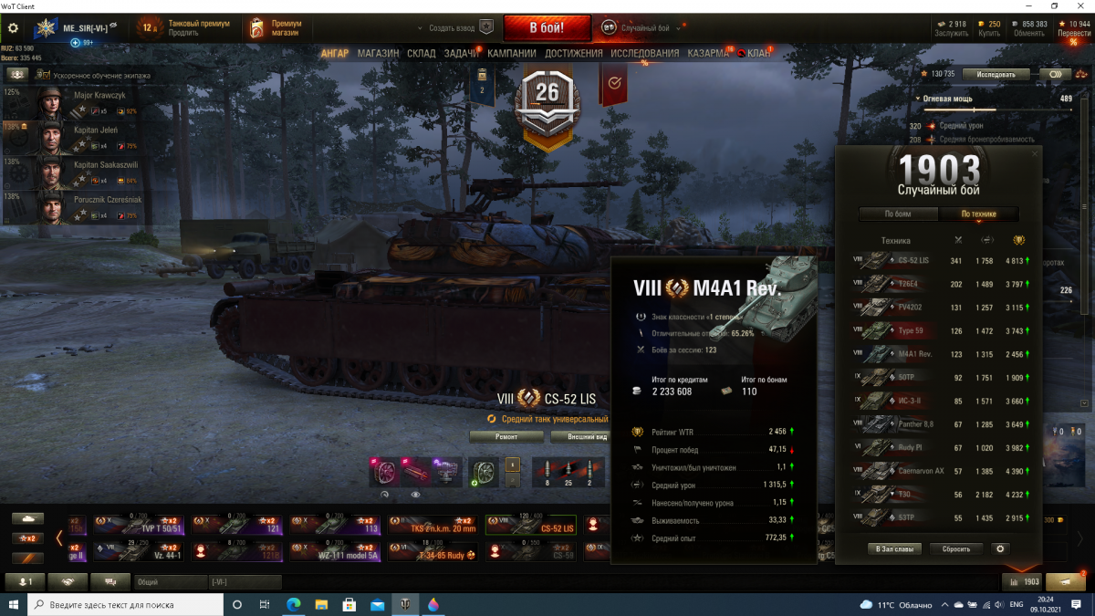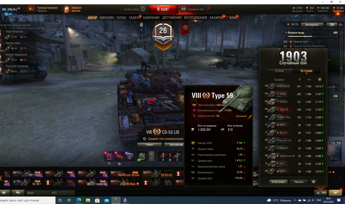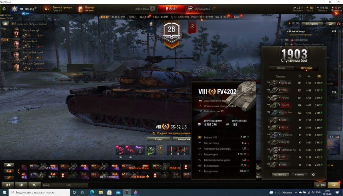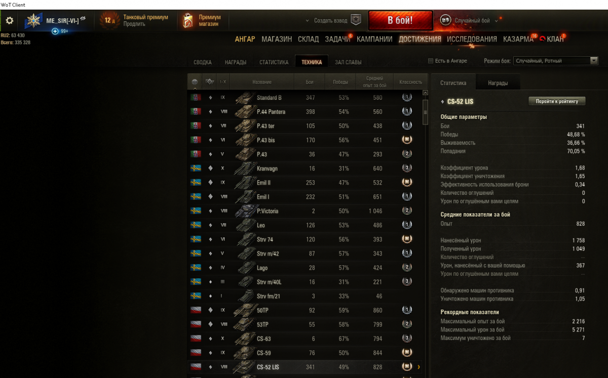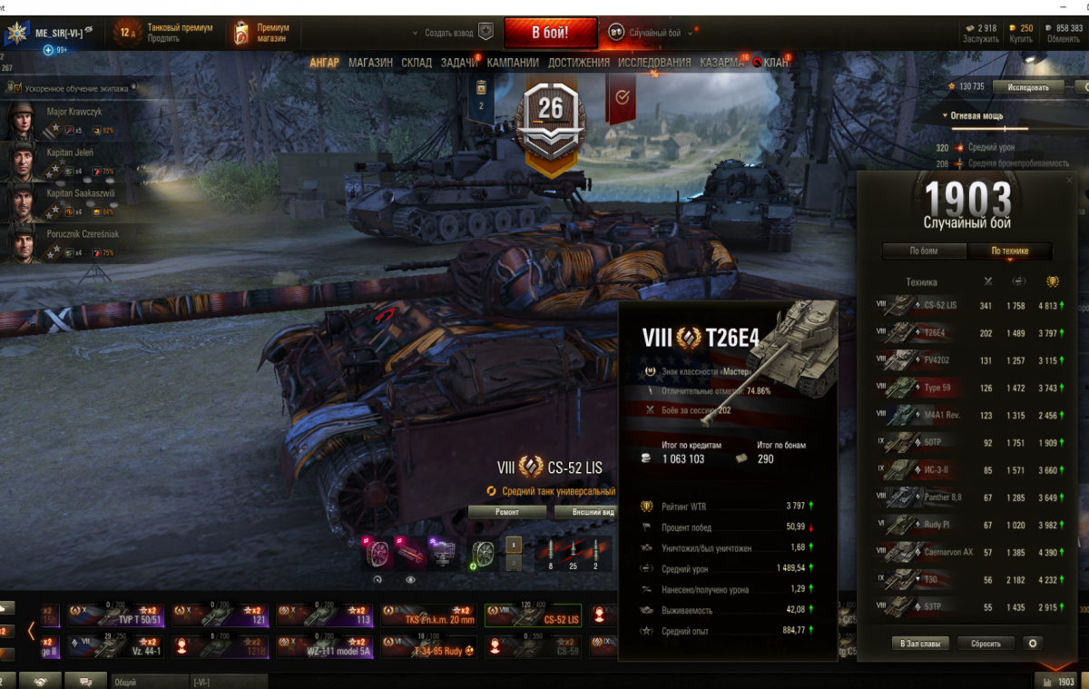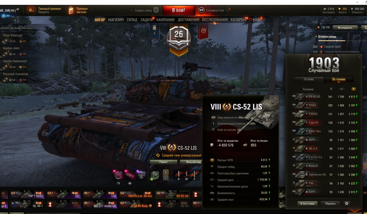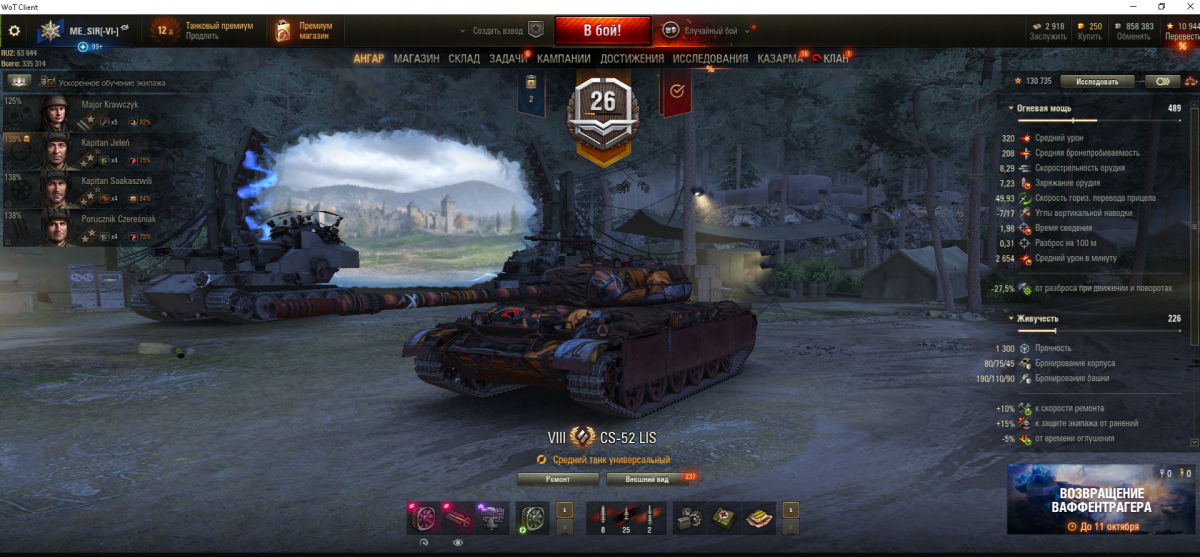 Доброго времени суток, уважаемые танкисты и танкистки!. 1. Вступление. CS-52 LIS - это премиумный средний танк 8 уровня Польши. Техническая стоимость 6 700 золота CS-52 LIS относится к классу премиум техники и обладает следующими преимуществами: Приносит больше опыта, кредитов и опыта экипажа за каждый бой. Имеет «элитный» статус, то есть не требуют исследования «топовых» модулей. Позволяет осуществлять пересадку экипажа с того же типа техники без штрафов и переобучения. Имеет возможность ускоренного обучения экипажа с первого боя Перед получением рекомендую ознакомится с данный гайдом, а также проконсультироваться с владельцами данного среднего танка. 2. Историческая справка 3. ТТХ: CS-52 LIS мы получаем сразу в элитном состоянии. Доступны три типа снарядов - ББ/БП/ОФ Средний урон - 320/320/420 единиц Бронепробитие на 50 метров - 208/252/53 мм Бронепробитие на 500 метров - 192/222/53 мм Скорость полёта - 980/1569/822 м/с Стоимость снарядов - 480/4400/410 серебра Боекомплект - 35 штук 4. Бронирование. Лоб корпуса - 80 мм. Борт корпуса - 75 мм. Лоб башни - 190 мм. Борт башни - 110 мм. Внимание ! Гайд я пишу как обычный игрок, пользуясь теми материалами (модификациями), которые есть в открытом доступе. Данные о бронировании могут быть неправильными, или неточными. Поэтому, считать данные изображения истиной в последней инстанции, не стоит. Как для ст, танк неплохо защищен, где-то на 4 балла по пятибальной шкале. Башня бронирована весьма неплохо, может довольно уверенно держать снаряды с пробитием в 220 мм, уязвимые зоны в виде лючков - присутствуют, но размеры их довольно небольшие и выцелить их не так-то и просто, однако жесткие пенетраторы, с пробоем выше 250 мм наносят урон весьма стабильно. Корпус защищен значительно хуже, в нормальных условиях танки с 175+ пробитием могут без особых проблем наносить урон стреляя в ВЛД, броня бортов присутствует, но не позволяет успешно использовать тактику обратного ромба. Однако бронепластины расположены под хорошими углами, и при игре от рельефа, мы можем ловить рикошеты. 5. Плюсы и минусы танка. Достоинства: Неплохая динамика и манёвренность; Хорошее бронирование башни; Рациональный угол наклона лобовой плиты корпуса; Достаточно высокий разовый урон; Высокая скорость полёта подкалиберных снарядов; Низкий силуэт; Хорошая маскировка; Повышенные коэффициенты опыта экипажа и кредитов; Возможность пересадки членов экипажа без штрафа.Недостатки:Посредственная броня корпуса Низкая максимальная скорость 6. Оборудование. Установкой дополнительных модулей мы можем усилить свой танк, сделав его преимущества более ощутимыми, либо сгладив недостатки. В нашем случае особое внимание нужно уделить комфорту нанесения урона, скорости и обзору, так что для CS-52 LIS оборудование следует ставить такое: Вариант 1: Турбонагнетатель Досылатель Стабилизатор Вариант 2: Досылатель Оптика Стабилизатор Вариант 3: Досылатель Вентиляция Стабилизатор На этом вариации не исчерпываются, но они, на мой взгляд, менее актуальны. Так же можно установить усовершенствованные, трофейные или экспериментальные аналоги, которое ещё больше повысит нашу эффективность в бою. 7. Расходники . Стандартный набор: Малая аптечка , малый рем.комплект и автоматический огнетушитель. Альтернативный набор: Большая аптечка , большой ремкомплект и хлеб со смальцем. Скорость перезарядки орудия имеет следующие п