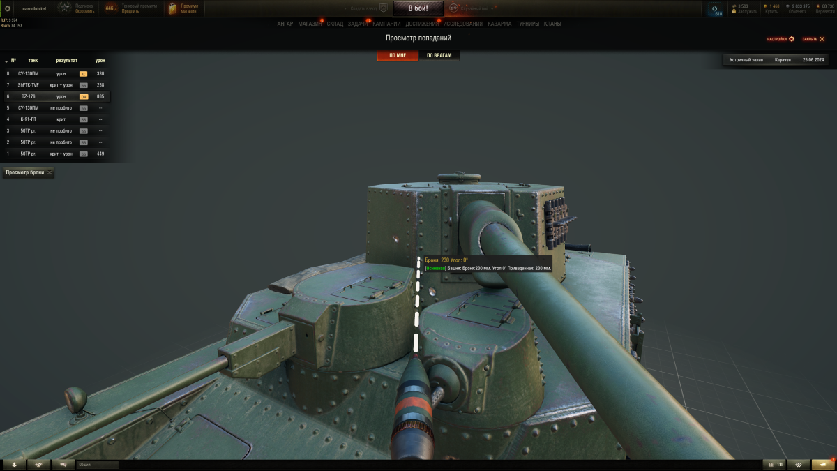 Пробитие от BZ176, с пробоем в 225мм, учитывая что у Карачуна под прямым углом там 230 мм брони, почему так?