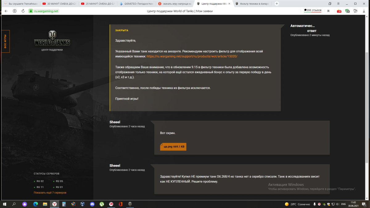Здравствуйте! купил танк Об.268/4, посадил экипаж, накинул камуфляж. но танка нет а серебро списали. Танк в исследованиях висит как НЕ КУПЛЕННЫЙ. Решите проблему.2 дня издеваетесь надо мной, зайдите на мой аккаунт и посмотрите, что танка там НЕТ! Ответ от центра поддержки: ЗАКРЫТАЗдравствуйте, Указанный Вами танк находится на аккаунте. Рекомендуем настроить фильтр для отображения всей имеющейся техники: https://ru.wargaming.net/support/ru/products/wot/article/15020/ Также обращаем Ваше внимание, что в обновлении 9.15 в фильтр техники была добавлена возможность отображения только техники, на которой ещё остался ежедневный бонус к опыту за первую победу в день (х2, х3 и т.д.). Соответственно, после победы техника из фильтра исключается.