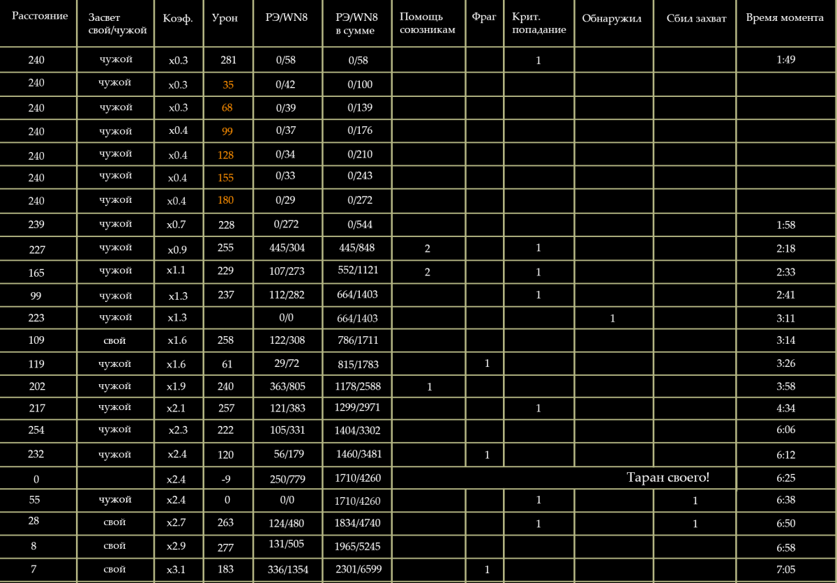 Удивительные вещи происходят в каждом бою, а мы их даже не замечаем. Может быть для кого- то это и не было тайной, но лично я был удивлен принципом начисления «КПД» за определенные действия. Например, за обнаружение противника никакого начисления не было, а за таран союзника накинуло весьма существенно. Чем дольше и сильнее горит противник, тем меньше начисляется. За снос гусли ничего не дают. За фраги ничего не дают. Но я сделал поверхностные выводы, не углубляясь в математический расчет. Может быть и найдутся люди которым интересно вычислить формулы, я же в математике слаб. С другой стороны, наверняка имеются уже вычисленные формулы, но я их даже не пытался найти, ограничившись подробной детализацией лога начисления РЭ/WN8 при помощи мода. Возможно те странности что я выявил являются багами, которые следует исправить. Сделано это было потому что захотелось разобраться, что по чём. Какие действия выгодно делать, а какие нет. Но я так и не смог понять, эти цифры меня еще больше запутали. Возможно вам уважаемые, удастся разобраться. Бой https://www.youtube.com/watch?v=gs7z5PbBXIU&feature=youtu.be Лог начислений РЭ/WN8 http://cdn-frm-eu.wargaming.net/wot/ru/uploads/monthly_11_2015/post-3986056-0-44257400-1446444322_thumb.png