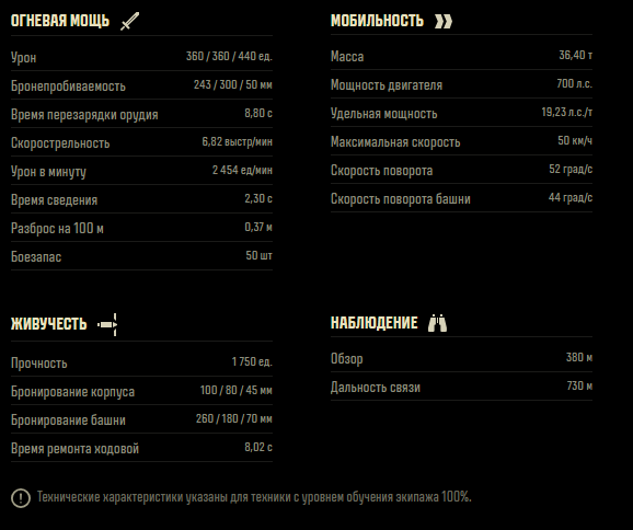 Дуплет ТТХ: Огневая мощь 415 Калибр (мм) 100 Урон (ед.) 320 / 320 / 420 Бронепробиваемость (мм) 241 / 289 / 50 Скорострельность орудия (выстр/мин) 7.50 Время смены орудия (с) 5 Заряжание орудия (с) 8 Заряжание орудий (с) 8 / 8 Время подготовки залпа (с) 2 Блокировка заряжания после залпа (с) 2 Скорость гориз. перевода прицела (град/с) 44 Углы поворота башни (град) 180 / 180 Углы вертикальной наводки (град) -8 / 20 Время сведения (с) 2.10 Разброс на 100 м (м) 0.38 Средний урон в минуту (ед./мин) 2400 Боекомплект (шт.) 60 Живучесть 311 Прочность (ед.) 1650 Бронирование корпуса (лоб/борт/корма в мм) 90 / 80 / 45 Бронирование башни (лоб/борт/корма в мм) 250 / 75 / 75 Время ремонта ходовой (с) 8.02 Мобильность 535 Масса (кг) 41002 Мощность двигателя (л.с.) 860 Удельная мощность (л.с./т) 15.43 Макс. скорость / задний ход (км/ч) 46 / 18 Скорость поворота шасси (град/с) 52 Незаметность 273 Неподвижной машины (%) 0.29 В движении (%) 0.22 Наблюдение 550 Обзор (м) 380 Дальность связи (м) 730 Важно: Тема является стартовой.Любой пользователь может подготовить гайд.Если гайд будет хорошо написан, то его выберут основной темой по танку, а данная тема будет закрыта.