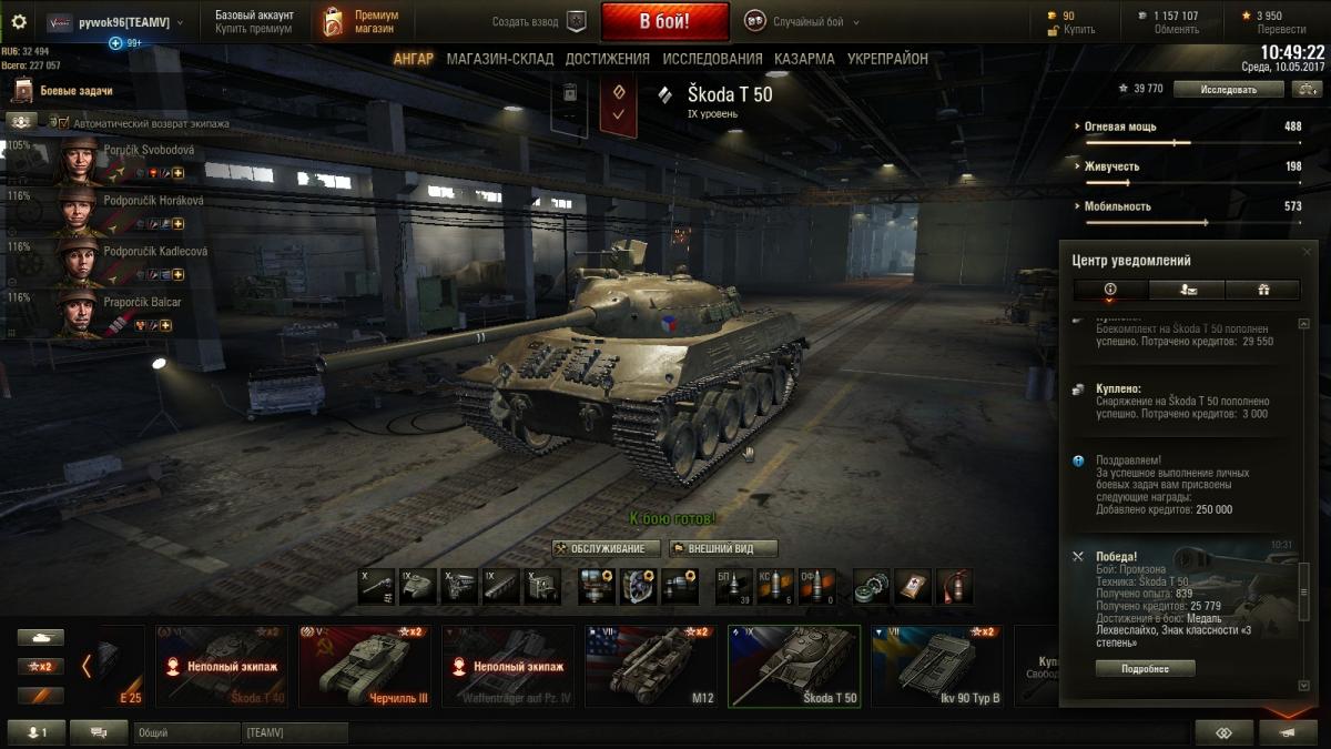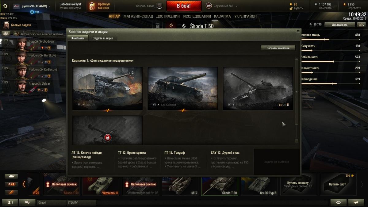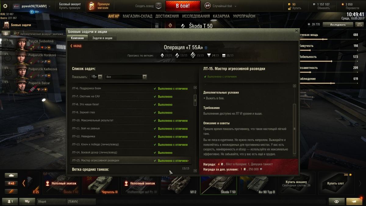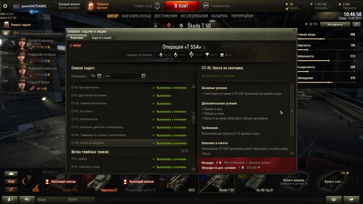 Всем добрый день, столкнулся с такой бедой: Выполнил ЛБЗ СТ15 на Т 55А - выполнение как положено засчиталось, а вот девушку мне дали, нигде не могу найти (ни меню с ЛБЗ, ни сразу после боя, ни в казарме) меню рекрутирования танкистки, при этом наградные листки и 250,000 серебра начислились исправно. Пробовал запускать клиент без модов, та же история меню рекрутинга нигде нету. Сразу же отписал в ЦПП, но решил написать сюда, возможно кто-то с подобным сталкивался и знает решение. Заранее извиняюсь, если такая тема уже есть, просто с форумами не дружу. Реплей: Spoiler 20170510_1031_czech-Cz02_TVP_T50_114_czech.wotreplay 1,32МБСкриншоты: 20170510_1031_czech-Cz02_TVP_T50_114_czech.wotreplay