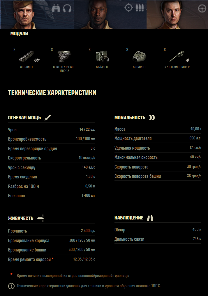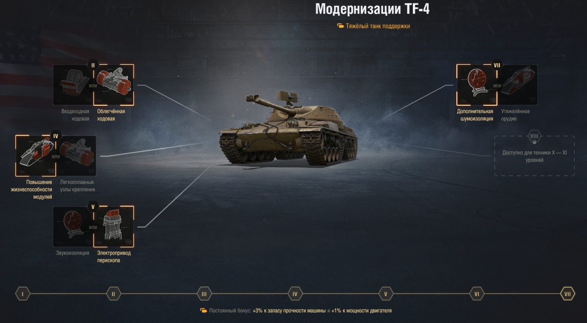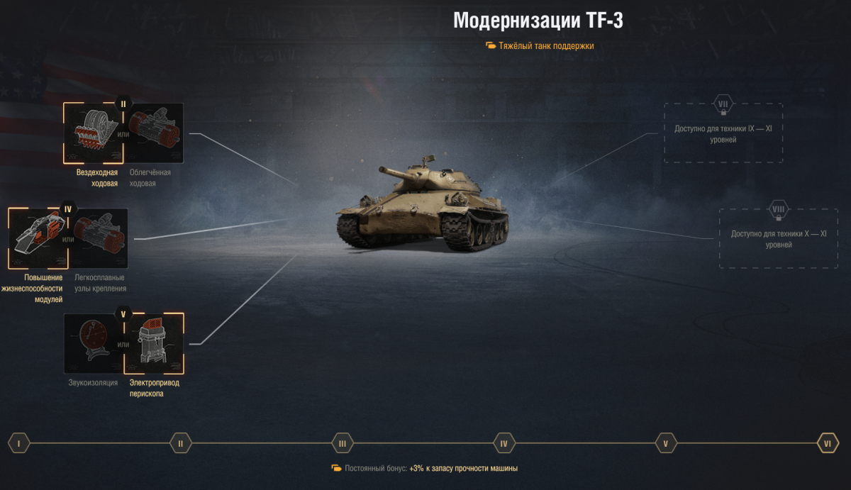 ОГНЕМЁТНЫЙ ТЯЖЕЛЫЙ ТАНК VIII УРОВНЯ TF-3 Здравствуй, читатель! Прошел 7 уровень? Вот и замечательно, потому что теперь ты стал на шажок ближе к пониманию величия струи, и тебя ждет настоящий огнемет: подвижный, бронированный, глазастый. Готовься, все танки в линейки от 8 до 10 уровня похожи друг на друга, отличаясь лишь самую малость, а потому тебя ждет практически неизменный геймплей на протяжении оставшейся прокачки ветки. А урон? Его как не было, так и не будет. TF-3, конечно, делает качественный скачок по сравнению с 7 уровнем, но сам по себе ничем особенным не выделяется. Это вполне себе крепкий середнячок среди огнеметов, для прохождения которого придется отвалить кучу опыта. Историческая справка В игре представлено следующее описание: Опираясь на опыт применения танков M4 Sherman, которые были переоборудованы в огнемётные танки, Химический корпус армии США объявил конкурс на разработку концепта огнемётного танка для ведения боевых действий в индокитайском регионе, в частности, для поддержки пехоты в сражениях Корейской войны. Одним из условий была унификация узлов и взаимозаменяемость компонентов с серийными машинами. Компания Cadillac представила концепт, который был одобрен для дальнейшего развития, вследствие чего, в 1952 году Cadillac начали работу над прототипом. 27 июля 1953 года Пханмунджомское перемирие положило конец боевым действиям. Работу над проектом заморозили. Значимые изменения 1.32 - ввод огнеметной ветки США 1.34 - ослабление лобовой брони и урона огнесмеси 1.38 - изменения балансировщика (приоритет на уровень боев ±1) ТТХ танка, его экипаж и прокачка модулей Так как в последние годы разработчики полюбили делать модули новых танков уникальными, ты тоже сможешь почувствовать себя уникальным и прокачать совершенно точно уникальный двигатель, который совершенно точно не стоит на Т-32 и у которого совершенно точно не точно такое же название. Радует только рация, которая, скорее всего, у тебя уже открыта. Все модули желательно прокачать, т.к. они дают весомый бонус к характеристикам, для чего потребуются не очень скромные 63 200 опыта. У танка есть интересная особенность: на топовой башне появляется огромная комбашенка (подробнее об этом в разделе брони), поэтому имеет смысл повременить с ее установкой или же вовсе не ставить. В результате получается оригинальный порядок прокачки: Двигатель -> Гусеницы -> Рация -> Башня В стоке танк может похвастаться следующими характеристиками: Пушка не меняется, броня стоковой башни в сравнении c топовой не сильно хуже, поэтому главным отличием стока от топа будет скачок удельной мощности: Таким образом, в топе танк со 100% экипажем обладает хорошим обзором 390 м (или 380 м со стоковой башней) и аж 10 градусами УВН, средними показателями прочности 1600 ед. (1500 ед. со стоковой башней) при неплохом бронировании с ярко выраженными уязвимыми зонами. При этом танк получает хорошую подвижность, что очень заметно после игры на 7 уровне. Удельная мощность достигает 16,67 л.с./т (16,01 л.с./т со стоковой башней), а максимальная скорость 36 км/ч. Относительно M4A2FL урон огнесмеси растет на 2-3 ед., в дальнейшем урон при повышении уровня будет возрастать, к сожалению, лишь на 1 ед. Как и у всех огнеметов, сложности представляет прокачка экипажа, поскольку данный танк обходится всего 3-мя членами экипажа, 2-ое из которых выполняют несколько ролей 
