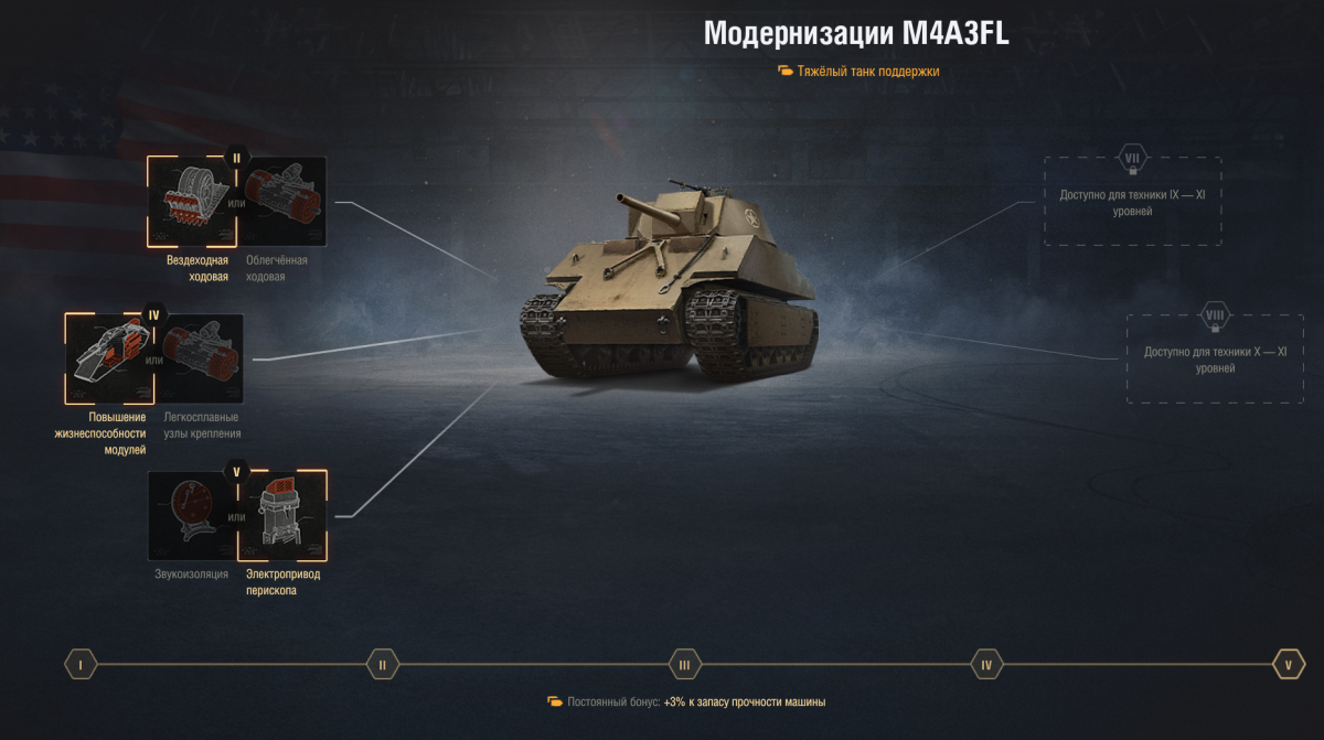 ОГНЕМЕТНЫЙ ТЯЖЕЛЫЙ ТАНК 7 УРОВНЯ M4A3FL Здравствуй, читатель! Внезапно появилось желание ознакомиться с американскими огнеметными танками (самое время в текущем патче-то)? Что же, в данном руководстве ты сможешь ознакомиться с характеристиками первого танка огнемётной ветки, а именно Его Величества Посредственности VII уровня M4A3FL, его сильными и слабыми сторонами, как он себя чувствует в рандоме, и стоит ли его вообще качать (ну хоть опыта для этого нужно немного). Историческая справка В игре представлено следующее описание: К вопросу создания огнемётных танков военные США подошли уже после начала Второй мировой войны. Летом 1942-го года Служба химического вооружения (CWS) приступила к испытаниям танковых огнемётов, в частности, специальной огнемётной версии Medium Tank M4A3. Данная модель получила новую сварную башню и дополнительную броневую защиту корпуса. Однако проект, так и не получивший специального обозначения, далее концепции не продвинулся. Также пользователь The_X_Factor в своем комментарии отметил, что основой игровой модели танка мог послужить деревянный макет так называемой bolt-on armor (проект комплекта добронирования) от CDA, у которого и вовсе не предусматривался огнемет. Значимые обновления 1.32 - ввод огнеметной ветки США 1.34 - ослабление лобовой брони и урона огнесмеси 1.38 - изменения балансировщика (приоритет на уровень боев ±1) ТТХ танка, его экипаж и прокачка модулей В стоке имеем следующее: Прокачивать модули, к сожалению, придется, но, т.к. это танк всего лишь 7 уровня, вывод танка в топ затребует сравнительно мало опыта – 39 900. С другой стороны, танк в стоке не торт, и чудеса унификации обошли этот танк стороной (кроме рации): на башню, гусеницы и даже знакомый по прочим Шерманам двигатель Ford GAA придется фармить, лучше в следующем порядке: Башня -> Двигатель -> Гусеницы -> Рация Если не вывести танк полностью в топ, то купить башню и двигатель, пожалуй, стоит, потому что путь до 8 уровня долог, труден и требует почти 107 000 опыта. После вывода в топ цифры становятся чуть-чуть лучше, но лебедем танк не станет: Таким образом, в топе танк со 100% экипажем обладает хорошим обзором 380 м и аж 10 градусами УВН, средними показателями прочности 1300 ед. при относительно сильном бронировании, что в целом свойственно американским огнеметам, однако подвижность откровенно подводит. Мощность 12,77 л.с./т и максимальная скорость 34 км/ч делают из танку какую-то уж совсем хромую утку в этой ветке гадких утят. Как и у всех огнеметов, сложности представляет прокачка экипажа, поскольку данный огнемет обходится всего 3-мя членами экипажа, 2-ое из которых выполняют несколько ролей одновременно (см. картинку выше), так что, друг, готовь учебные пособия. Броня Броня танка действительно вроде и хороша, но с нюансами. Корпус При правильной постановке ромбом он способен создать значительные проблемы тяжелым танкам одного с ним уровня при стрельбе стандартными и «золотыми» снарядами, даже тяжи на уровень выше могут испытывать трудности без использования голды (>240 мм в корпусе, однако) (рис. 1 и 2). Уязвимыми зонами можно считать места расположения экипажа, нижний бронелист (под 200 мм брони, кстати) и узкую полоску над гусеницами, в которую попадут разве что случайно. Увы, но нижняя часть борта имеет броню всего лишь 38 мм, так что при любом довороте тот же ИС с деструктором пробивает туда по п