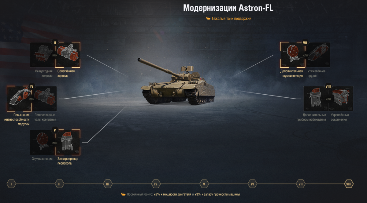 ОГНЕМЕТНАЯ МАШИНА СМЕРТИ 10 УРОВНЯ ВСЕМ КАЧАТЬ (уже нет) ASTRON-FL Здравствуй, читатель! В данном руководстве ты сможешь ознакомиться с характеристиками американского тяжелого танка X уровня ASTRON-FL, его сильными и слабыми сторонами, как он себя чувствует в рандоме, и стоит ли его вообще качать (а опыта для этого нужно много). Историческая справка В игре представлено следующее описание: С середины 50-х годов в рамках программы ASTRON разрабатывалась альтернатива огнемётному танку М67, которая обладала бы высокой защищённостью и имела 4-гусеничную схему ходовой части. Проектная масса машины составила 50 тонн, предполагалась установка электрической трансмиссии. Разработка машины, получившей индекс Astron-FL, завершена не была. Главной тому причиной оказалась ситуация вокруг самой программы ASTRON: к концу 50-х годов у неё уже отсутствовали перспективы. В комментариях пользователем The_X_Factor отмечено, что танк является видением разработчиков того, как фантазия на тему сборного танка могла бы выглядеть в реальности. Об огнемете в проекте речи, разумеется, не шло. Значимые обновления 1.32 - ввод огнеметной ветки США 1.34 - ослабление лобовой брони и урона огнесмеси 1.38 - изменения балансировщика (приоритет на уровень боев ±1) 1.39 - незначительное изменение полевой модернизации ТТХ танка и его экипаж Прокачивать никакие модули, к счастью, не нужно, это танк 10 уровня и представлен сразу в топовой комплектации. Пока важно только отметить, что в базе танк со 100% экипажем имеет хорошую удельную мощность 17 л.с./т с максимальной скоростью 40 км/ч, выдающиеся 12 градусов склонения орудия, солидные 400 м обзора и не впечатляющие 2300 ед.прочности. Сложности представляет прокачка экипажа, поскольку, как и остальные танки ветки, данный огнемет обходится всего 3-мя членами экипажа, 2-ое из которых выполняют несколько ролей одновременно (см. картинку выше), так что, друг, готовь учебные пособия. Броня По сравнению с 9 уровнем можно даже сказать, что танк стал менее защищенным. Да, он все еще крепок, но размер и количество уязвимостей гораздо больше, противники же злее и кусачее. На рисунке прекрасно видно, как голда может сделать из неосторожного ASTRON-FL мальчика для битья, а на голде на высоких уровнях играют, как все мы знаем, все. Огнеметные особенности Первой особенностью огнеметных танков является… огнесмесь. Крайне медленная, сильно демаскирующая, с низкой дальностью, но весьма забавной траекторией полета, позволяющей безопасно закидывать через холмы. Про игнорирование брони после последнего нерфа говорить уже не стоит – стоит о нем забыть.По сравнению с IX уровнем возрастает бронепробиваемость с 90 до 100 мм и урон на одну единичку с 13 до 14 и с 21 до 22 для первой и второй огнесмеси соответственно. Хоть как-то заметно, пожалуй, будет только первое изменение.Второй особенностью выступает постепенный перегрев орудия, степень которого показана в виде шкалы слева от прицела. При полном ее заполнении придется ожидать охлаждения орудия в течение 12 секунд, в течение которых стрельба невозможна, а каждый последующий сектор шкалы от 1 до 3 сильно снижает урон, поэтому увлекаться не нужно, достаточно ограничиться первыми двумя в большинстве случаев. Плюсы и минусы: + подвижность + броня + обзор + четыре гусеницы + высокий урон при пробитии + криты противника + УВН - низкая скорость - большое число уязв