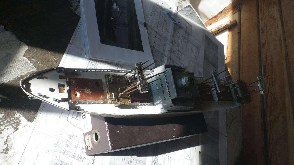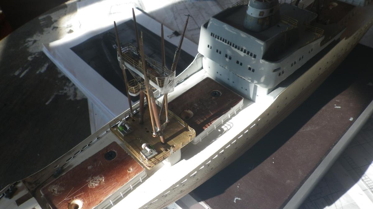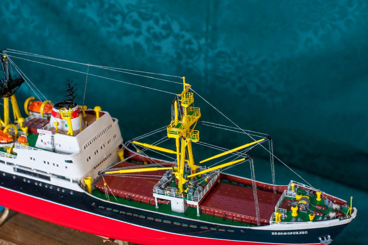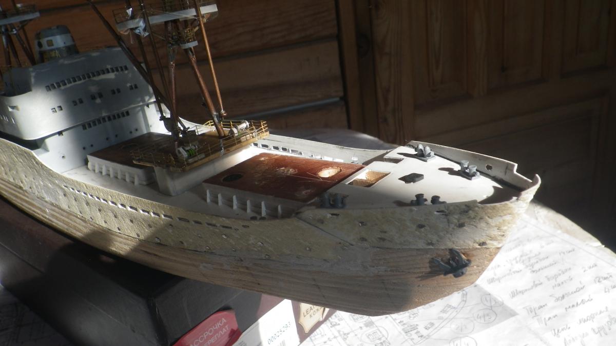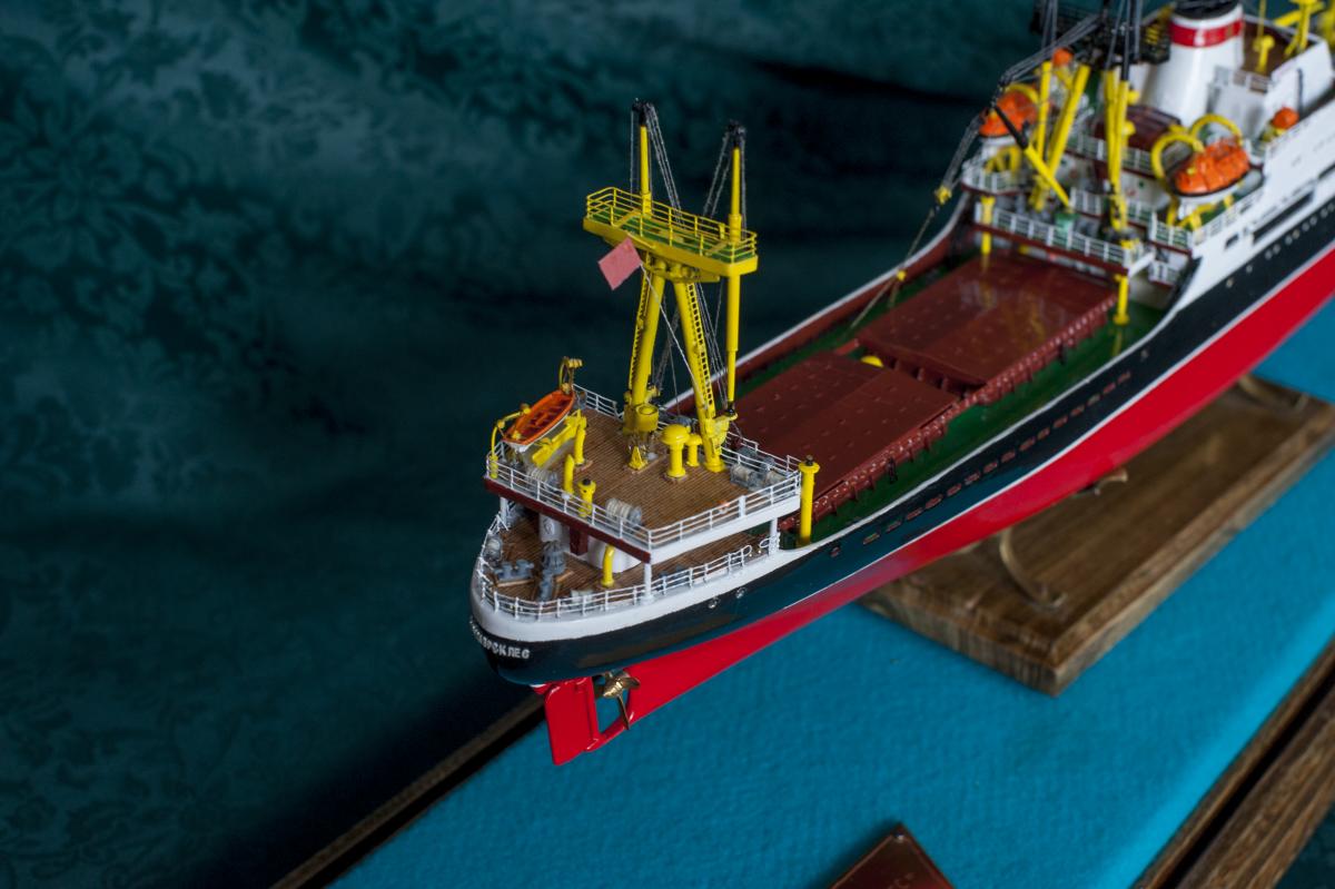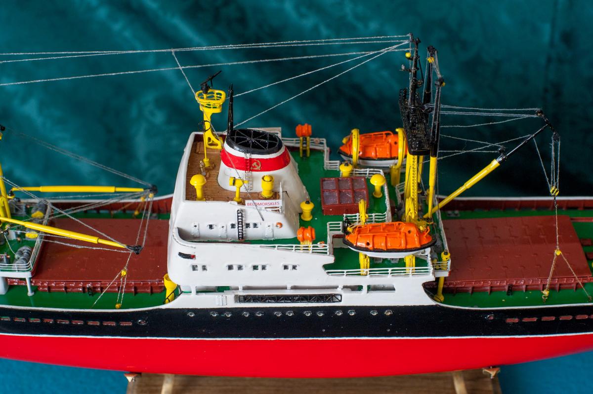 SpoilerПриветствую уважаемые Моделисты , и просто Зрители. Статья будет длинная. Все же два года упорной работы это для меня , можно сказать , определенный этап. Прототип с небанальной историей ,да и модель "шла " очень непросто и туго .Признаться, многое из запланированного откровенно - не получилось . Так что наболело знаете ли. Блог не стал вести , т.к. здешний народ больше по броне , и не уверен , что мои потуги были бы кому - то интересны, да и фотика достойного - не имею . В общем, кому не особо интересно - листните сразу вниз, к фоткам. Поехали .... Началось все с первой фотки : Любопытно знаете ли... определенно , достаточно современный кораблик , с ледокольными обводами, и явно гибнет в результате ледового зажима. Оказалось, это шестидесятые годы, Карское море , лесовоз "Витимлес" . Дальше больше... Лесовоз действительно ледового класса , польской постройки , серия кораблей "Беломорсклес" . Проект Б45 разработан ЦКБ Польской Народной Республики.Серия строилась с 1960 года на Гданьской судоверфи (г. Гданьск, Польша). По заказу СССР было построено около 70 судов данной серии.Тип судна: теплоход, лесовоз, ледового класса.Конструктивный тип: однопалубное, трёхостровное, со средним расположениемМО и жилой надстройки, ледокольным носом и крейсерской кормой.Назначение: перевозка лесоматериалов и зерна.Класс Регистра: УЛ*Р4/1С лесовоз.Район плавания: неограниченный.Дальность плавания: 6000 мильЭкипаж: 40 чел.Валовая вместимость: 4673 тДедвейт: 6036 т (лес), 5726 т (зерно)Длина: 123,88 мШирина: 16,70 мВысота борта: 8,40 мОсадка: 3,43/7,51 мМарка ГД: дизель "562VT2BE-140" Мощность ГД: 1 х 5450 л.с.Скорость: 16,0/17,2 уз.4 грузовых трюма общей вместимостью 7558 куб.м (киповая), 8444 куб.м (насыпью).8 легких грузовых стрел грузоподъемностью по 10,0 т2 тяжеловесные грузовые стрелы грузоподъемностью 15,0 т и 50,0 т. Т.е. достаточно серьезный кораблик. Потом оказалось, что суда этой серии частенько ходили в нашу Игарку, а я - сибиряк знаете -ли . И лесник к тому же. Короче - заусило . История этой серии довольно богата на события , и даже со своими трагическими страничками . Погиб еще как минимум один из этой серии : лесовоз " Брянсклес" . "Воркуту" удалось спасти, хотя и помяло её крепко. Карское море шуток не любит знаете -ли... Кроме того , кто то из "Беломорсклесов" засветился на Кубе во время Карибского кризиса ( на пиндосовской хронике определенно мелькали характерные надстройки ) . Гонять ледокол на Карибы, это по нашему, чтоб америкосовские эсминцы таранить ... Ну и как - то вот плавненько , сначала нашел какие - то пиратские чертежики кусочками, потом - посидел, собрал кусочки в кучу ну и пошло - поехало. Пока дело касалось только дерева- железа , все было ок, но вот как дошло до грунтовки - покраски... просто - амба. Специально под этот проект взял аэрограф, всякие красочки в маленьких баночках. Только толку - то. Если руки растут из... ну вы поняли. Короче баночки кончились, а результату - ноль целых, ноль десятых. А так как такую специфическую продукцию у нас найти не просто, да и дорого , красил - эмалями из баллончиков. Откровенно говоря результатом удовлетворен - не очень . А когда 5 раз умудрился уронить главную ( в различной степени готовности) надстройку , понял, что над этой серией явно какой то злой рок, и тонули они неспроста , а моя рукож-ть распространяется не только на боевую статистику. Тем не менее , я его победил ! Помогали все кто